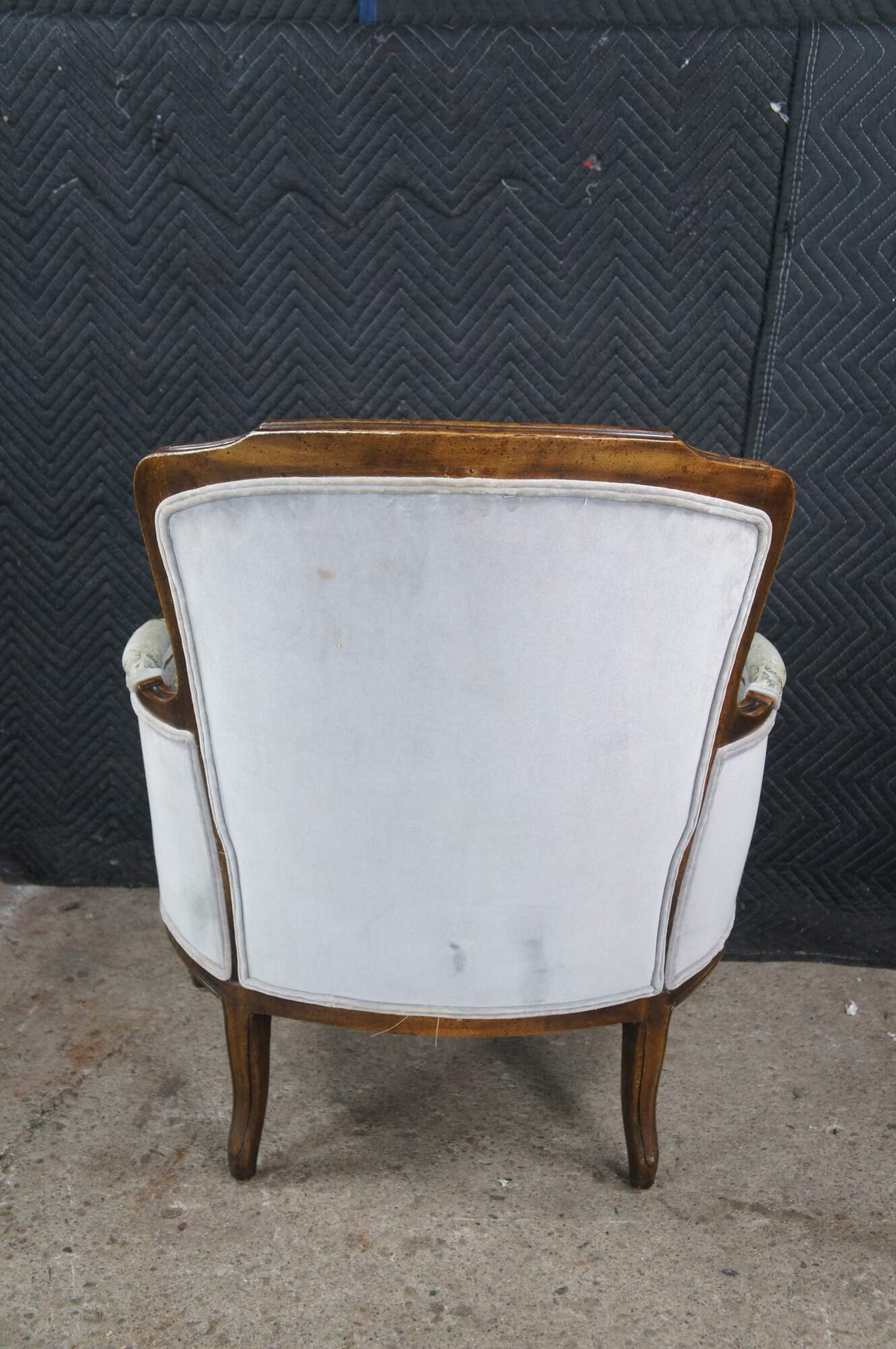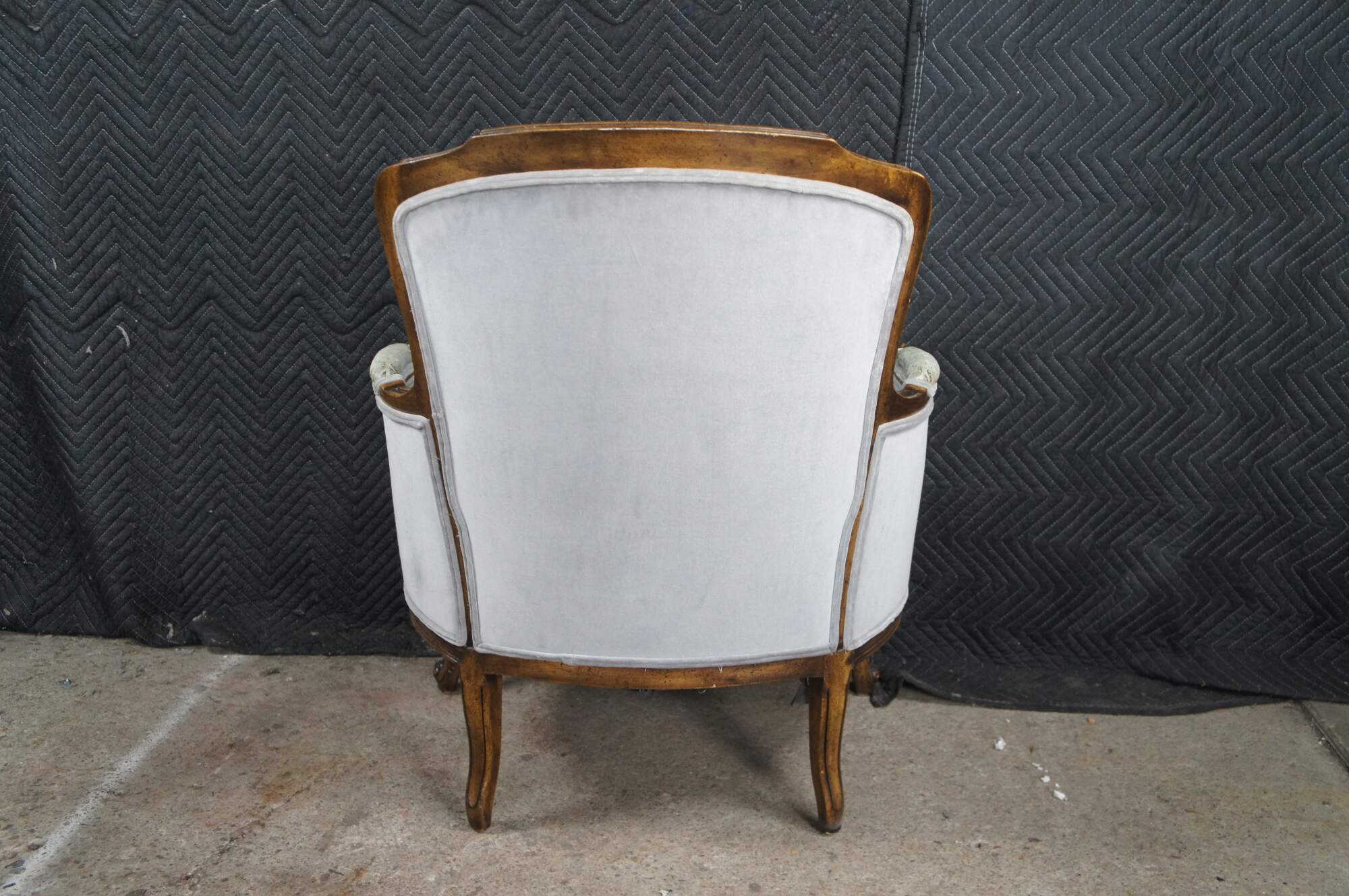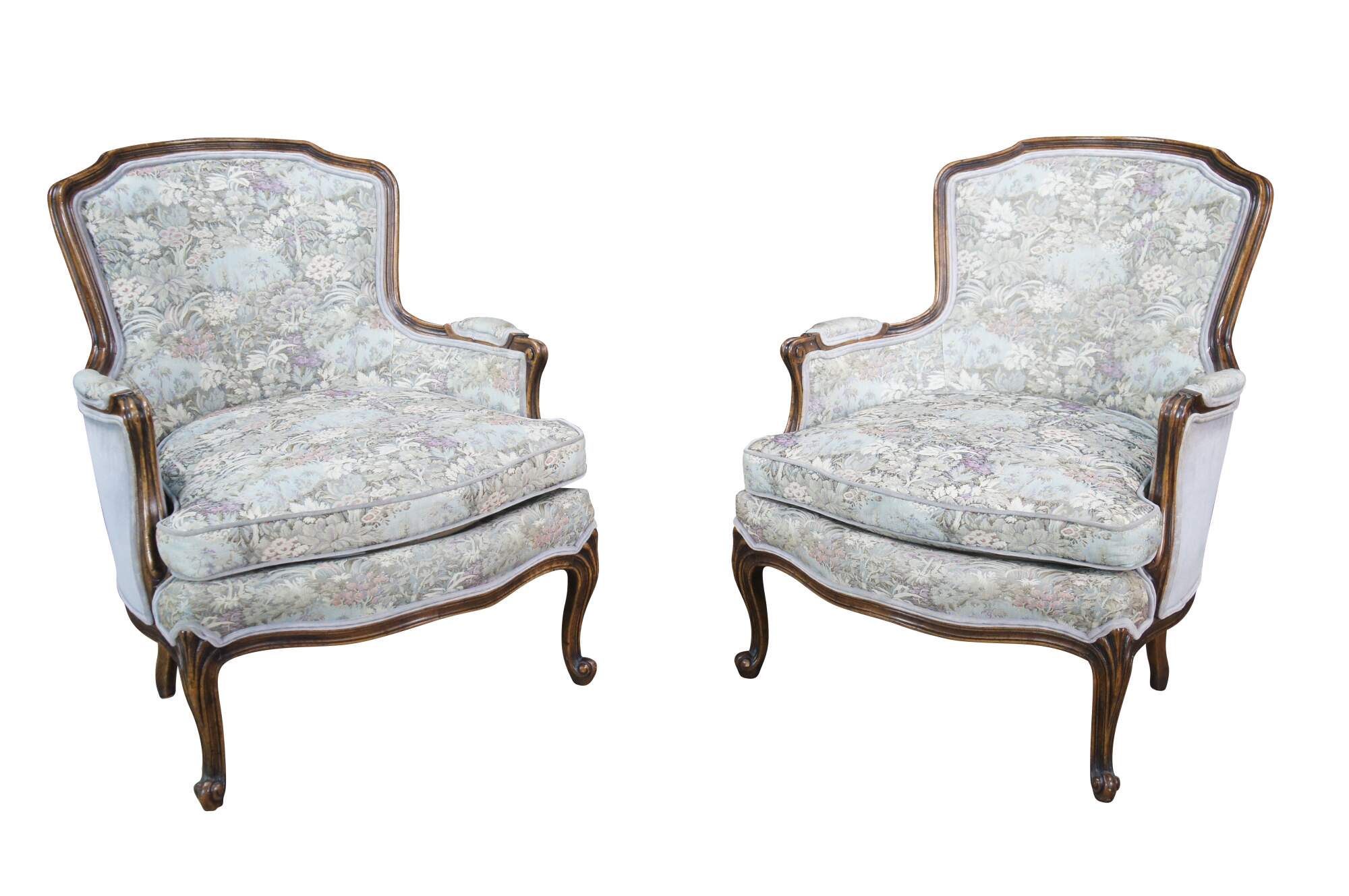 Pair of two vintage Wellington Hall floral upholstered fauteuil arm chairs. Made of walnut featuring French styling with domed wingback design, padded arms, serpentine accents and cabriole legs. Floral upholstered front, velvet back.