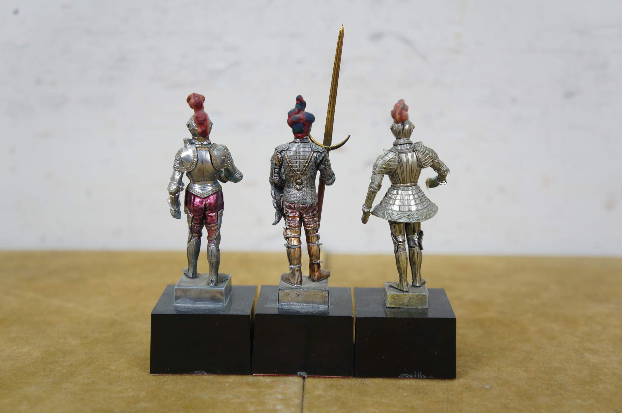 Lot of 11 mid to late 20th century figurines on black bases including two carriages, a Spanish Royal barge boat, three armoured knights on horse back, and four standing armoured knights. From Museo de Carrozas, Museo de Faluas-Aranjuez, and Madrid Real Armeria. Descriptive labels on bases.