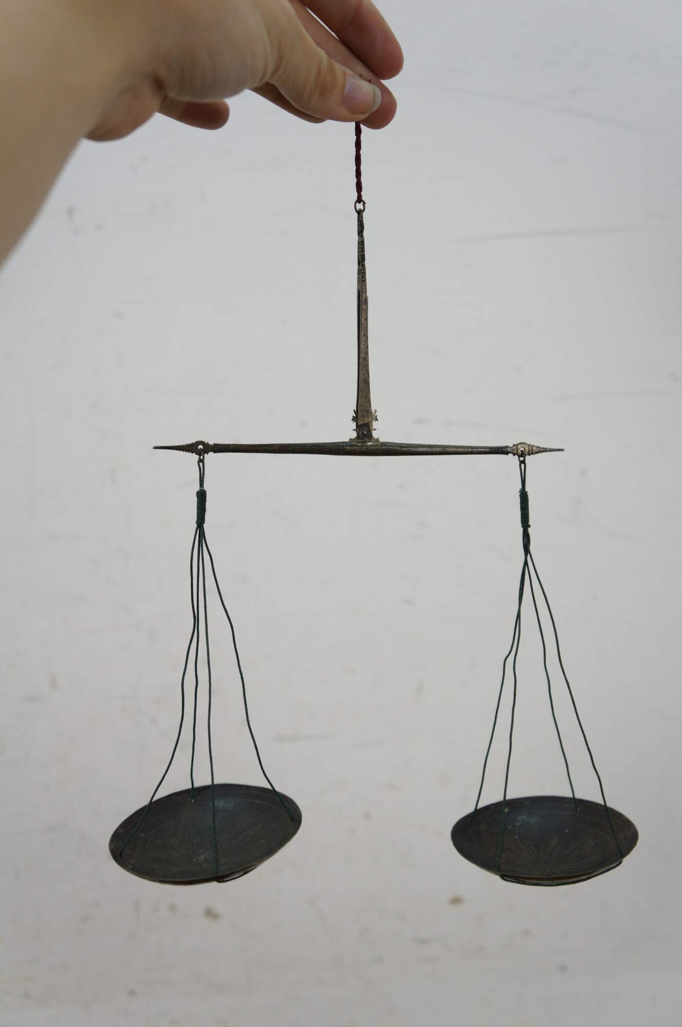Antique Chinese portable opium scale - pair of hand held brass scales etched with leaves, with a wooden case hand carved with flowers on one side, a foliate spiral on the other, and a curled dragon on the inside.