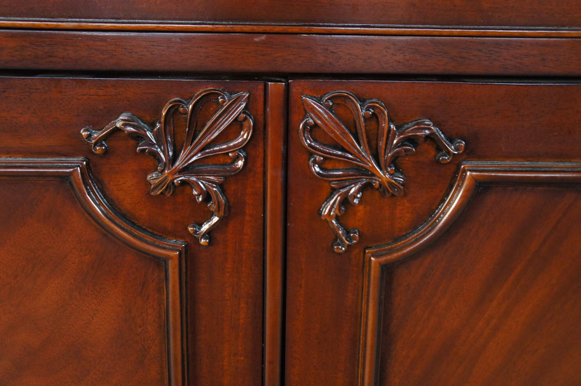 Vintage mahogany breakfront sideboard cabinet / buffet / server / console from the Robert Adam collection by Millender Furniture Company. Made of flamed mahogany featuring George III styling with carved floral swags and fluted accents.