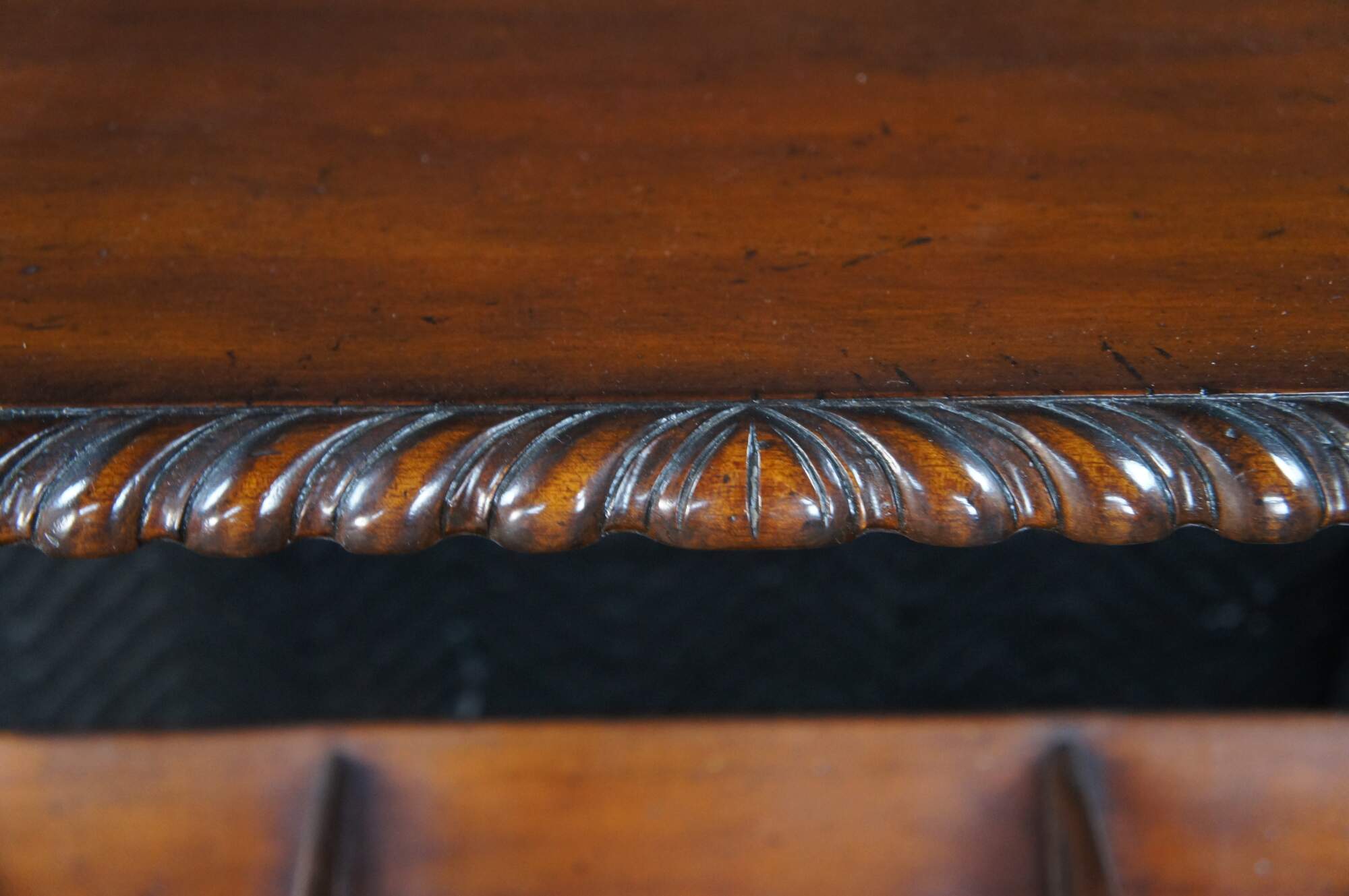 Vintage Maitland Smith Chinese Chippendale style bookcase / book stand / trough side table / library console. Made of mahogany featuring a tiered design with upper gadrooning edged shelf and lower reticulated / pierced book divider, supported by faux bamboo form legs and stretchers.