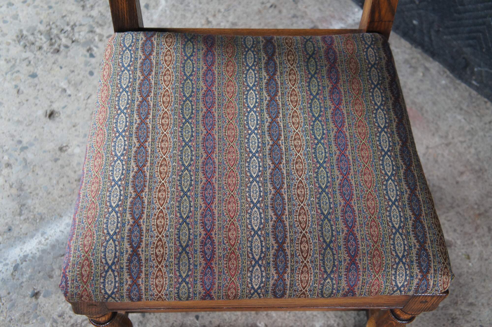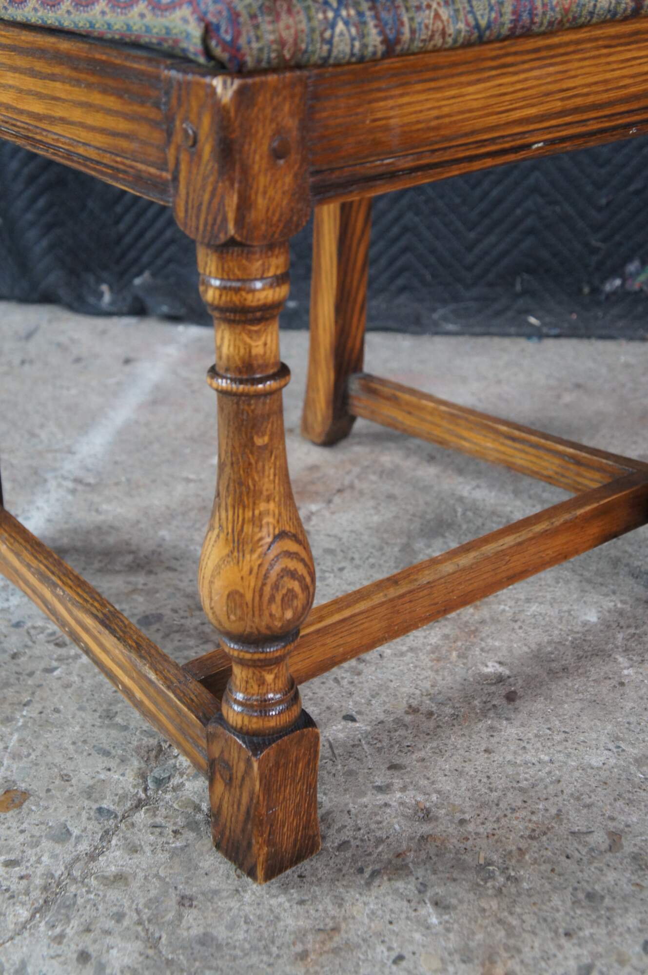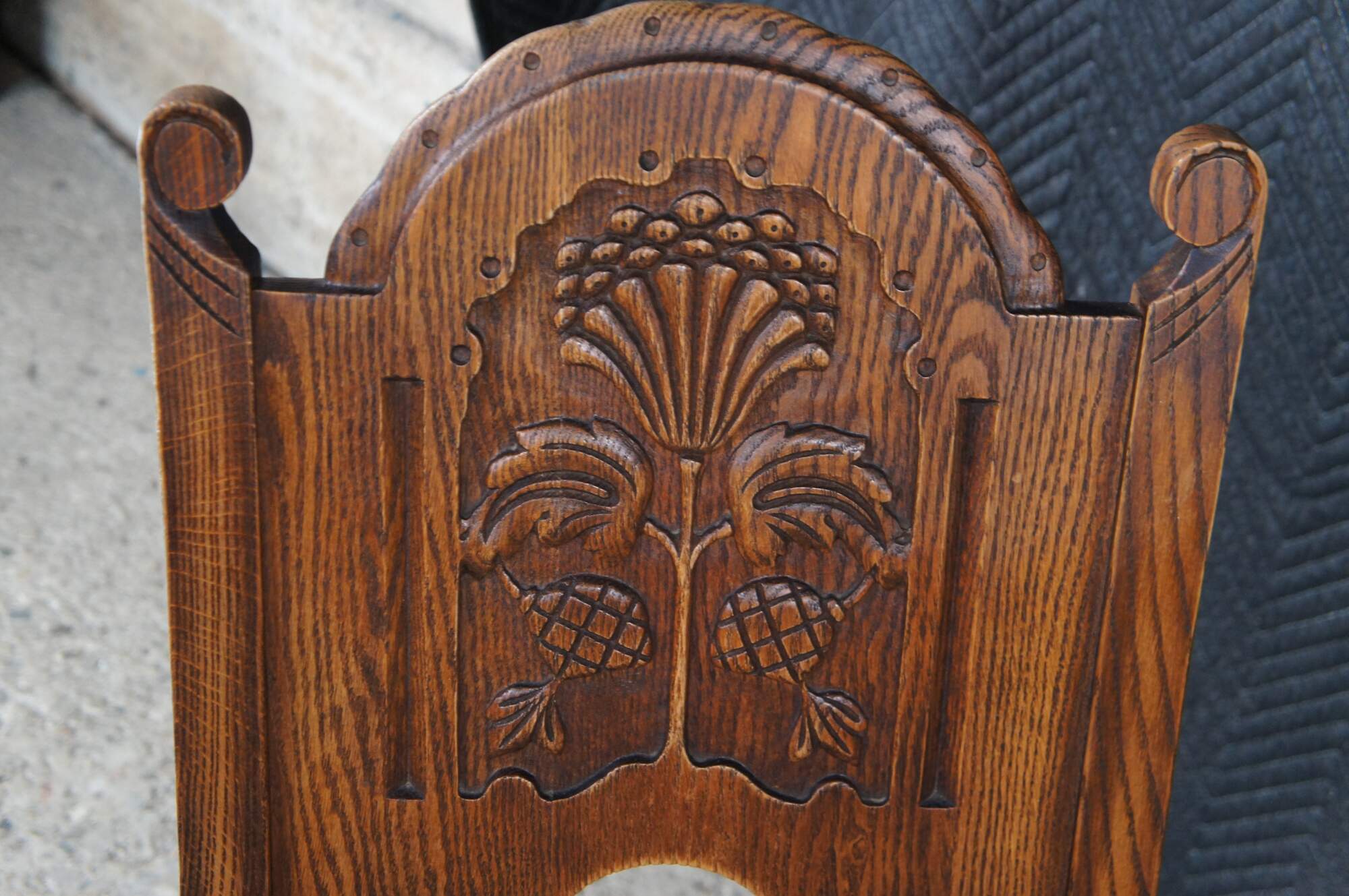 Set of six Antique Feudal Oak dining chairs by Jamestown Lounge Company. The chairs feature a rustic, ornately carved floral motif with domed top and turned baluster legs connected by stretchers. Circa 1920s-1930s.