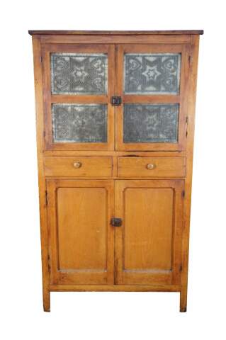 A very large and impressive antique kitchen farmhouse double pie safe. Made of pine featuring punched tin doors with stars and hearts.
