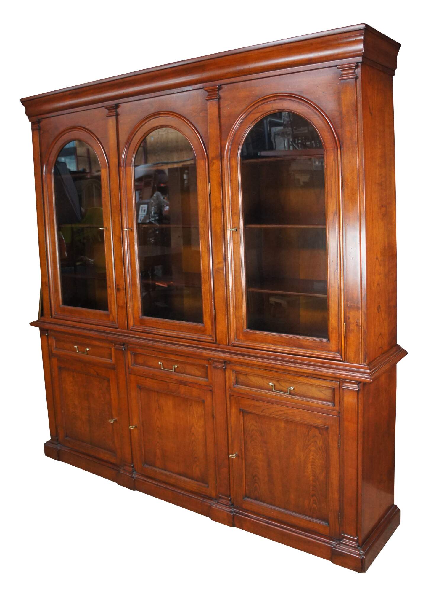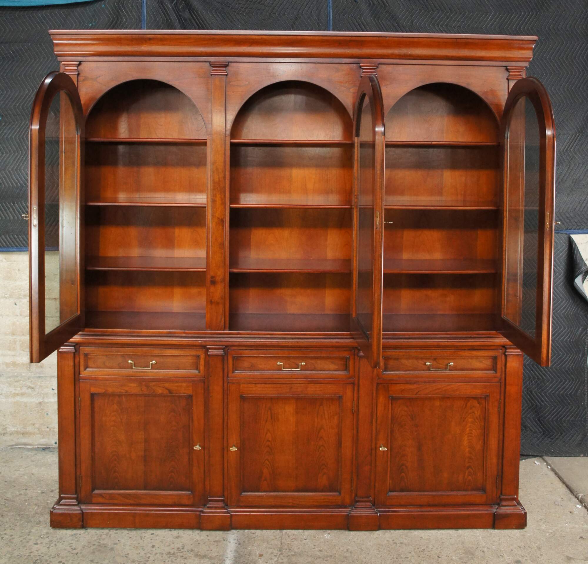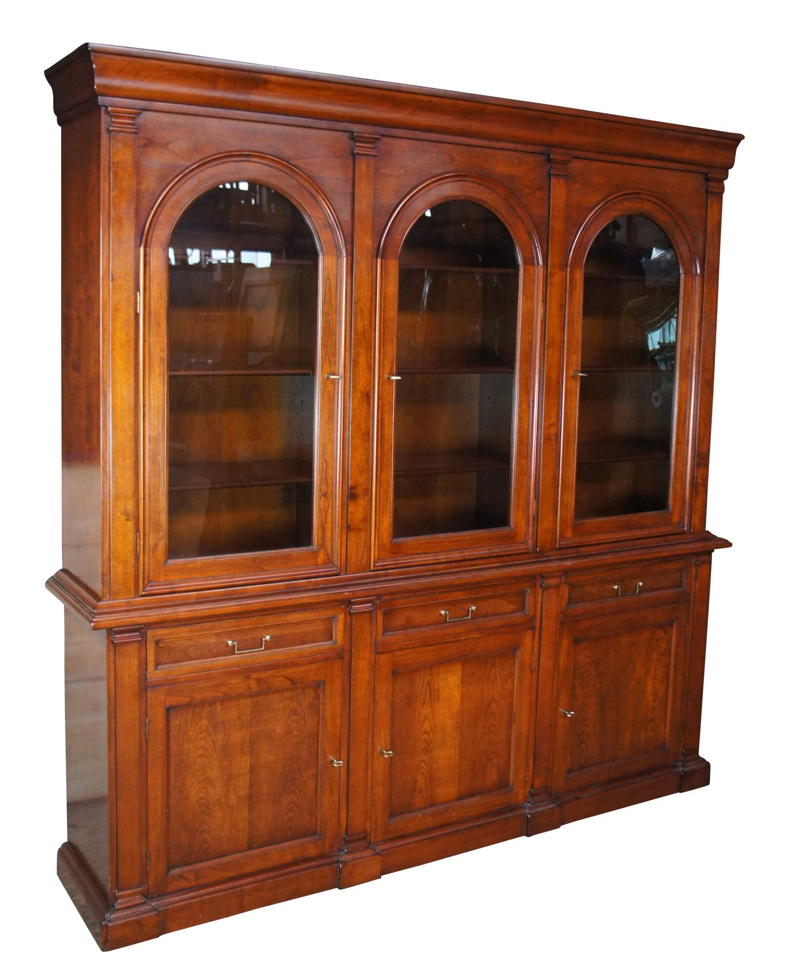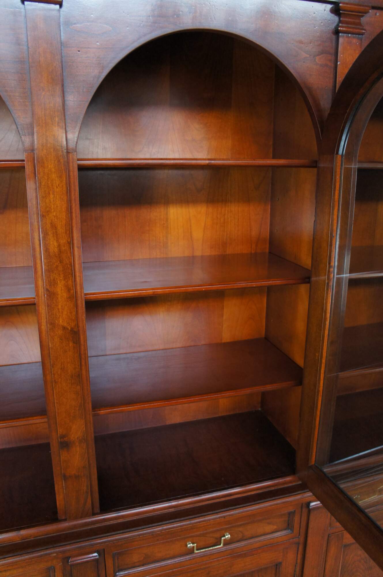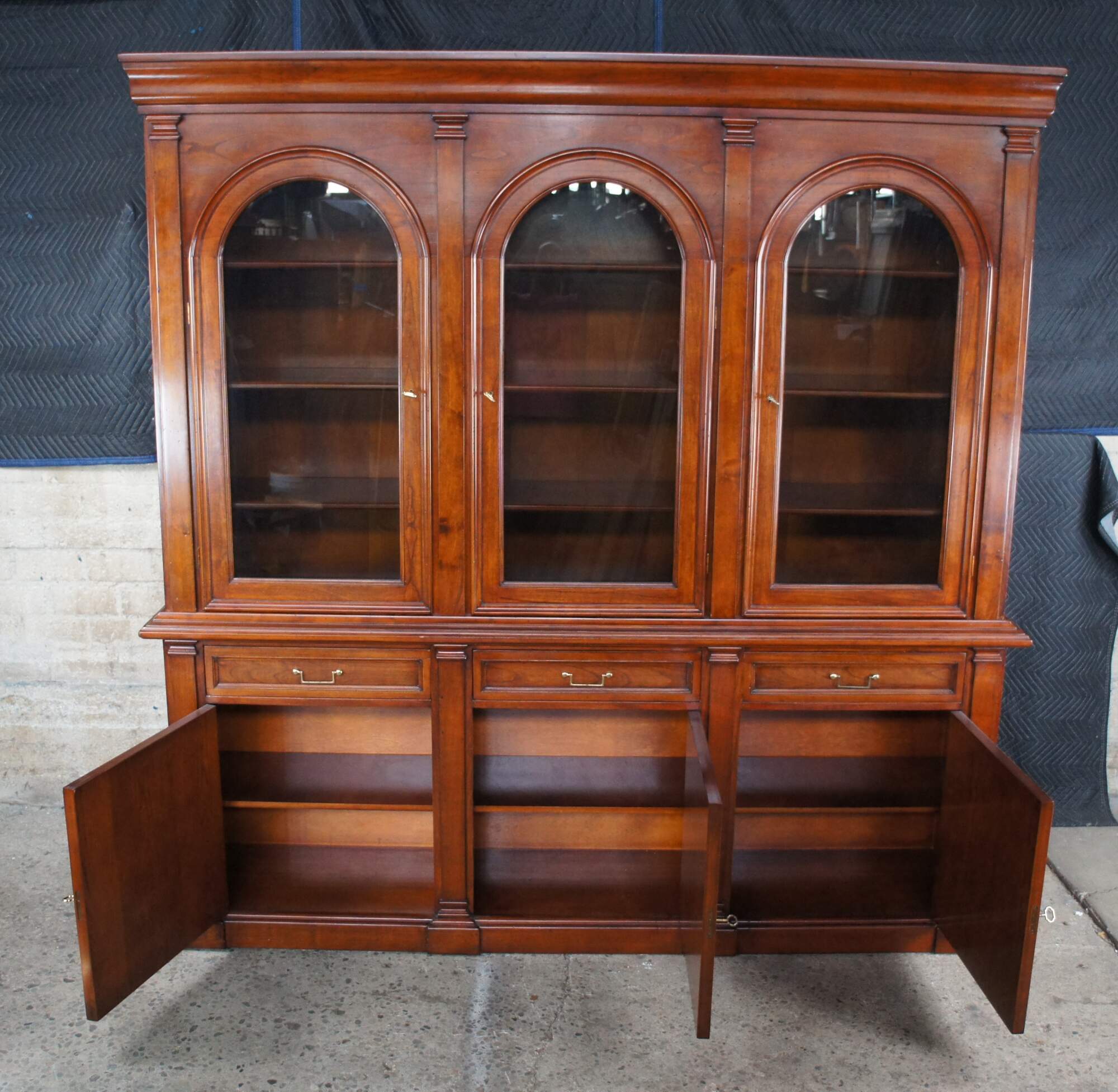 Vintage Fiorini Italian Neoclassical solid cherry library bookcase or china cabinet featuring arcaded cherry and glass front doors opening to nine adjustable shelves. Features some Louis Philippe styling with contoured crown over beautiful columns. The base showcases three dovetailed drawers with brass hardware over three lower cabinets with interior shelf. Made in Italy. Includes six keys, all locks working.
