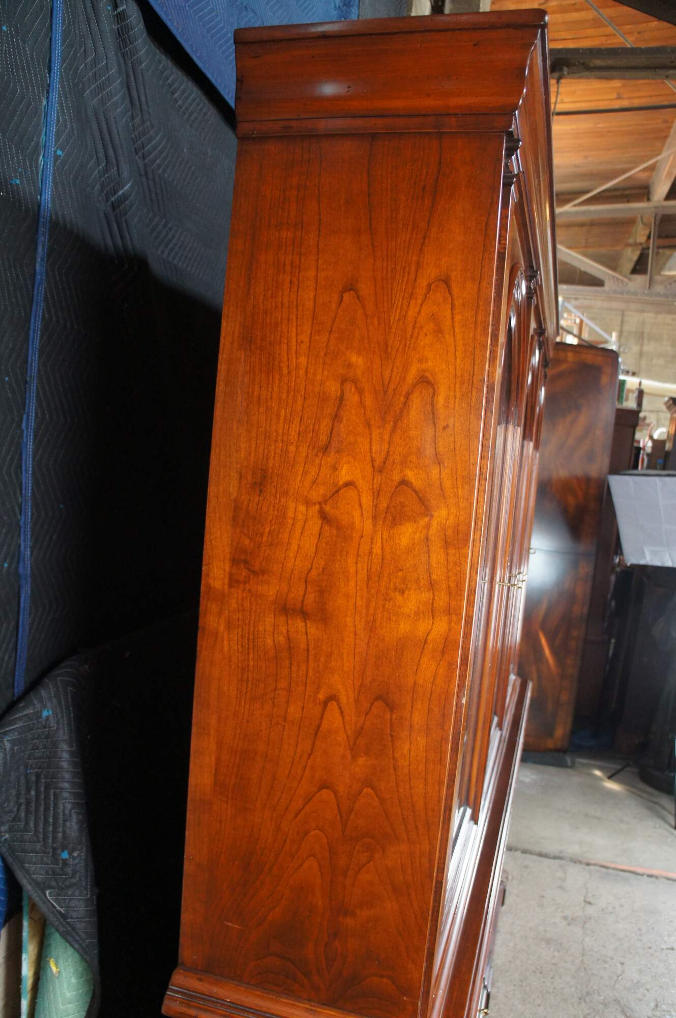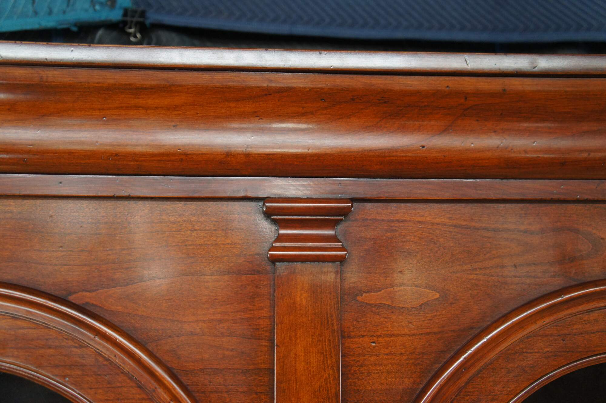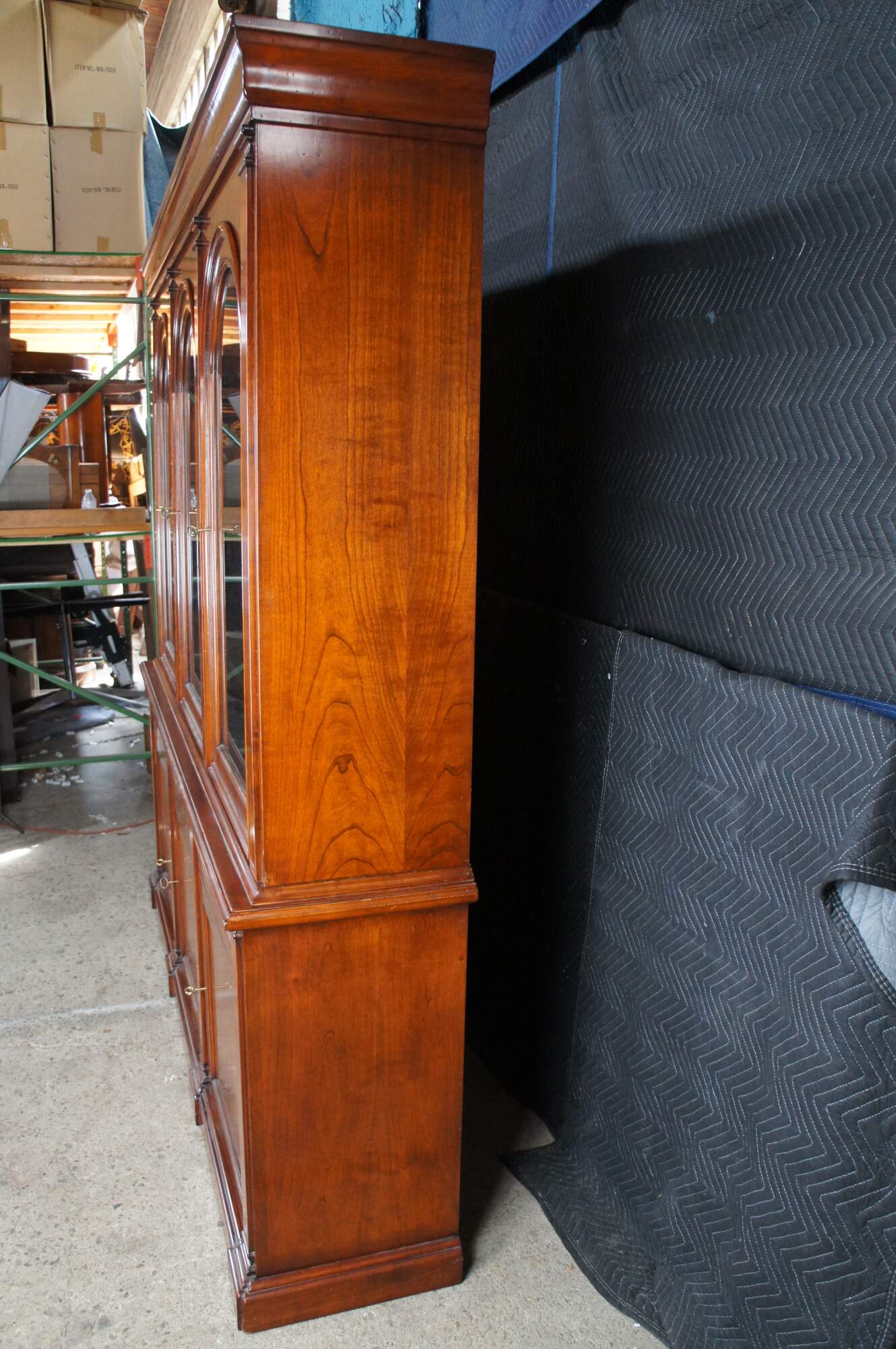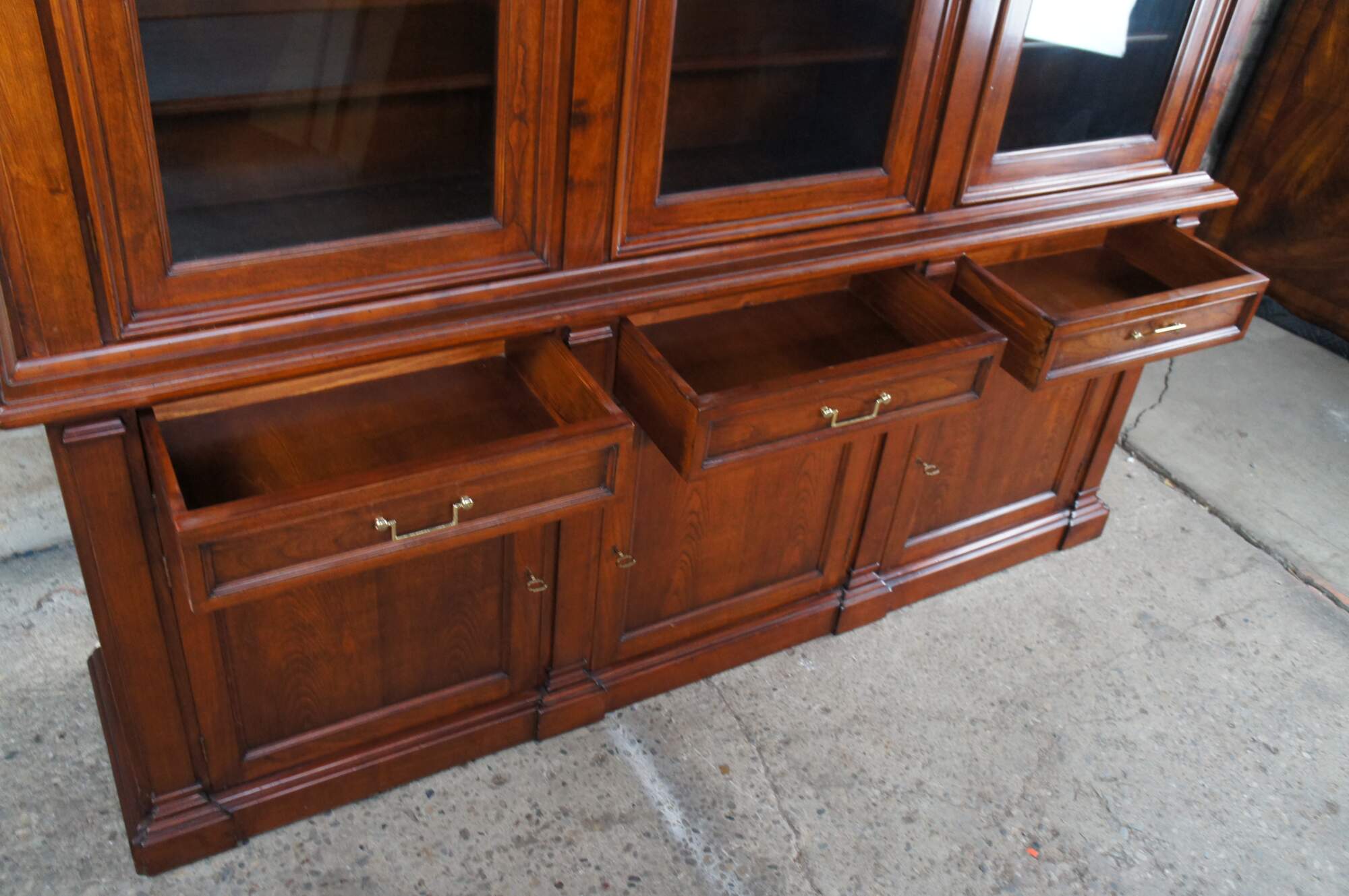 Vintage Fiorini Italian Neoclassical solid cherry library bookcase or china cabinet featuring arcaded cherry and glass front doors opening to nine adjustable shelves. Features some Louis Philippe styling with contoured crown over beautiful columns. The base showcases three dovetailed drawers with brass hardware over three lower cabinets with interior shelf. Made in Italy. Includes six keys, all locks working.