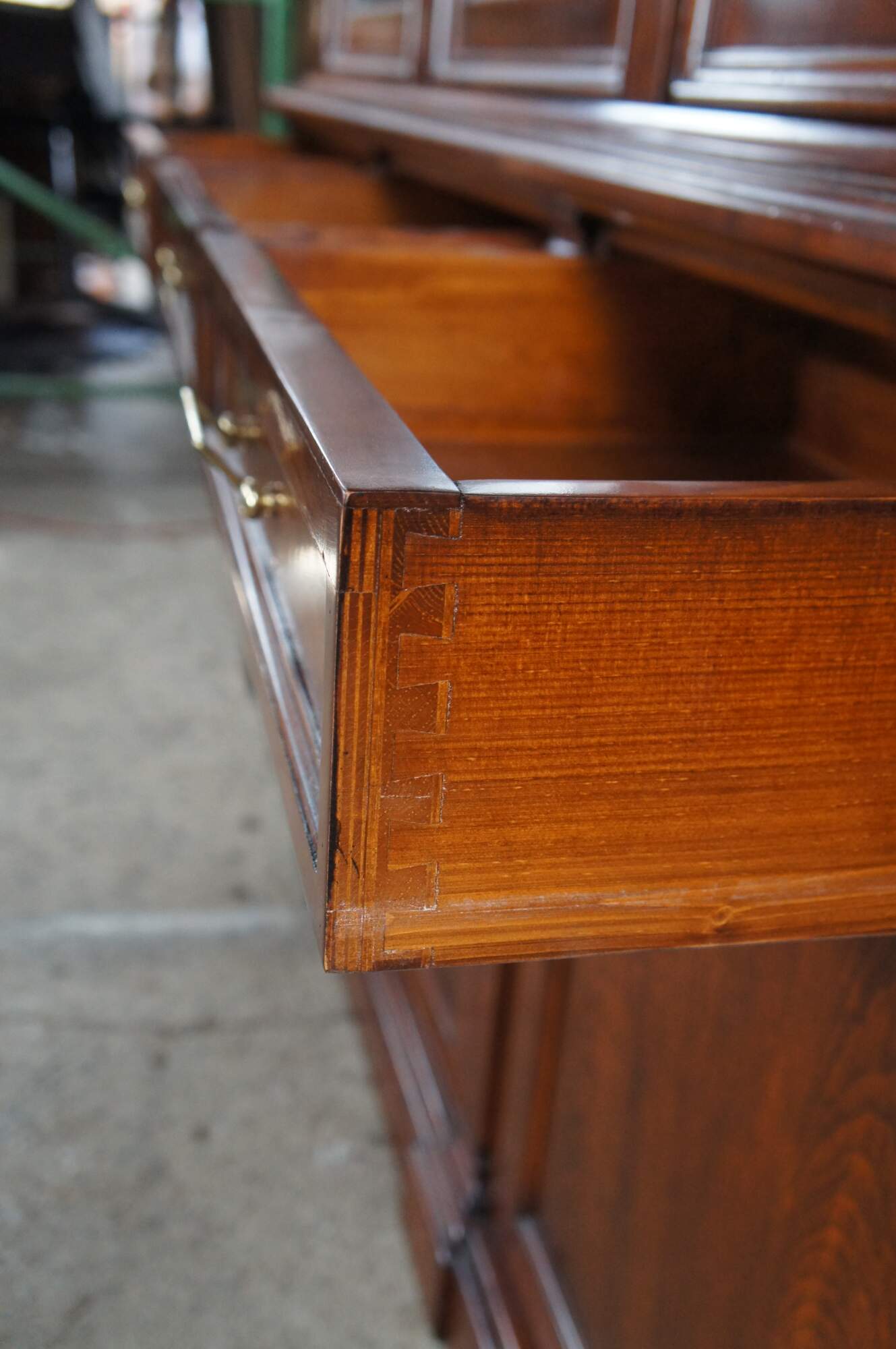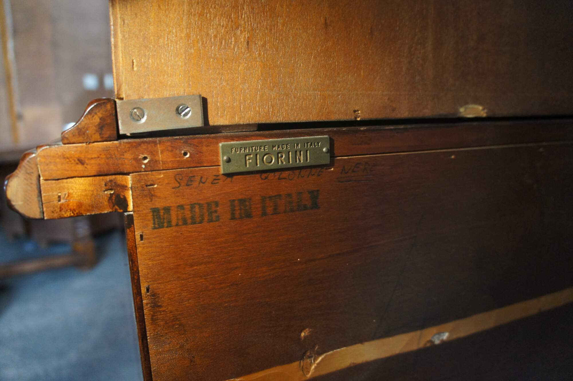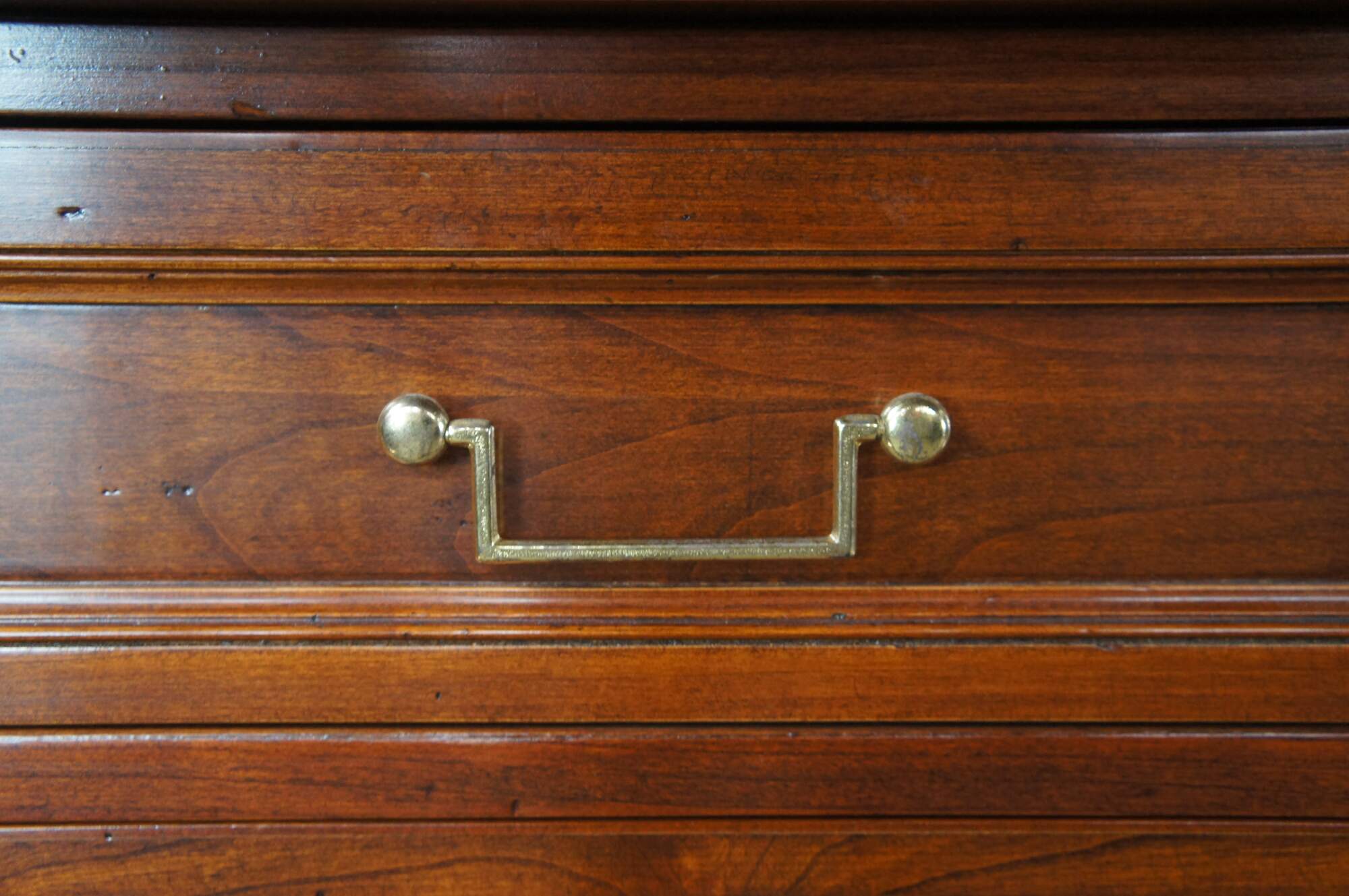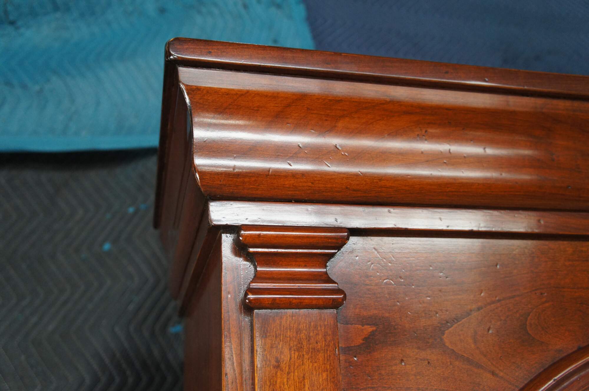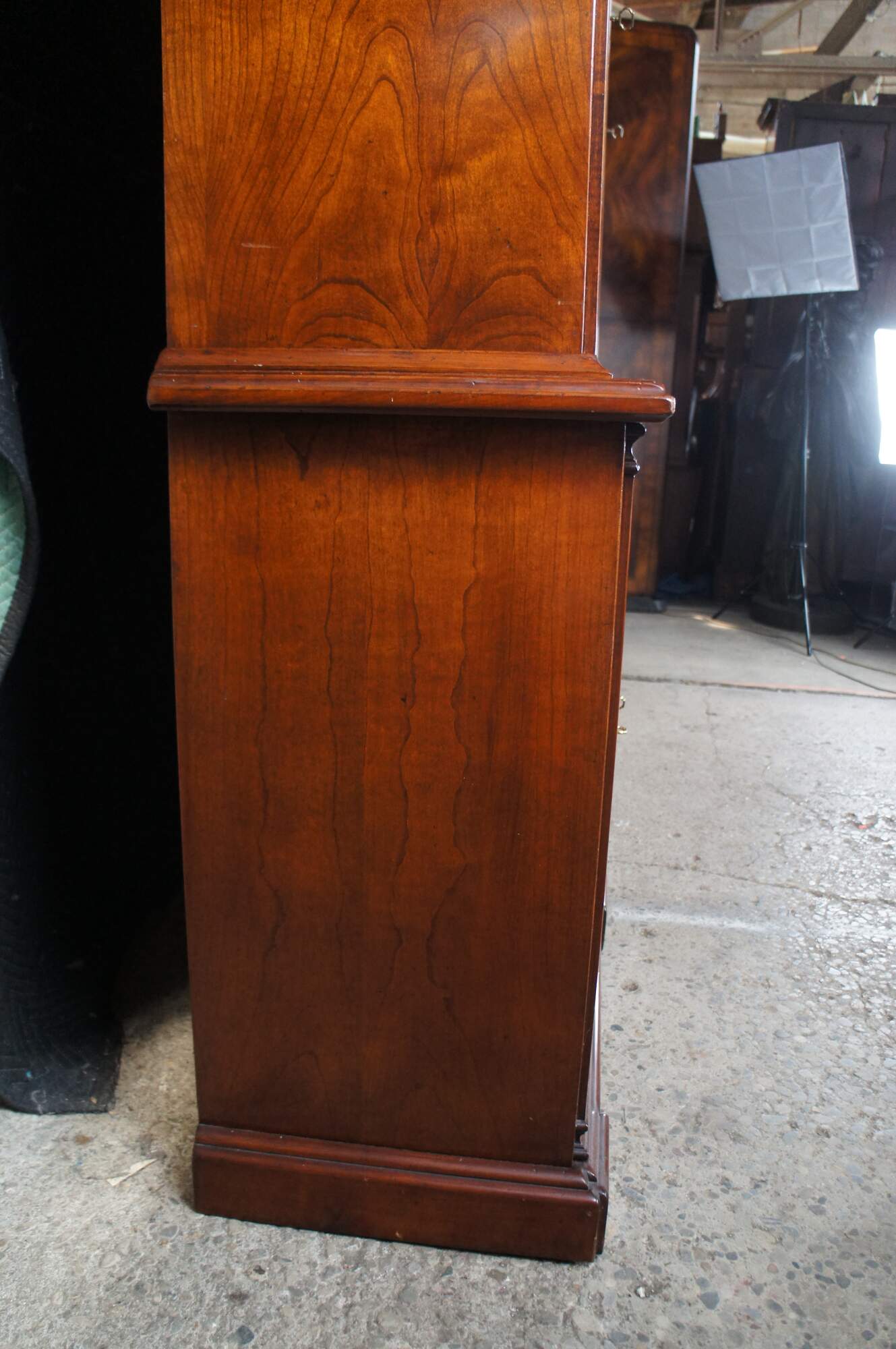 Vintage Fiorini Italian Neoclassical solid cherry library bookcase or china cabinet featuring arcaded cherry and glass front doors opening to nine adjustable shelves. Features some Louis Philippe styling with contoured crown over beautiful columns. The base showcases three dovetailed drawers with brass hardware over three lower cabinets with interior shelf. Made in Italy. Includes six keys, all locks working.