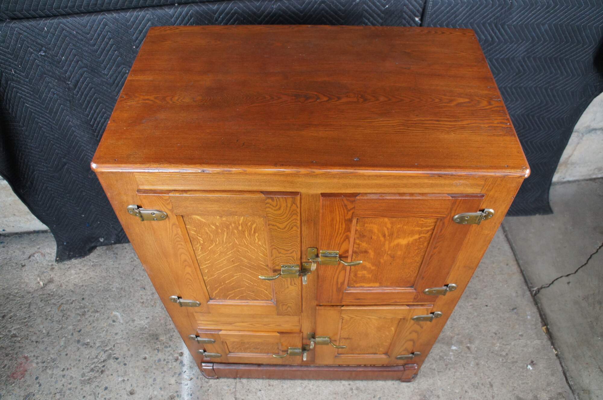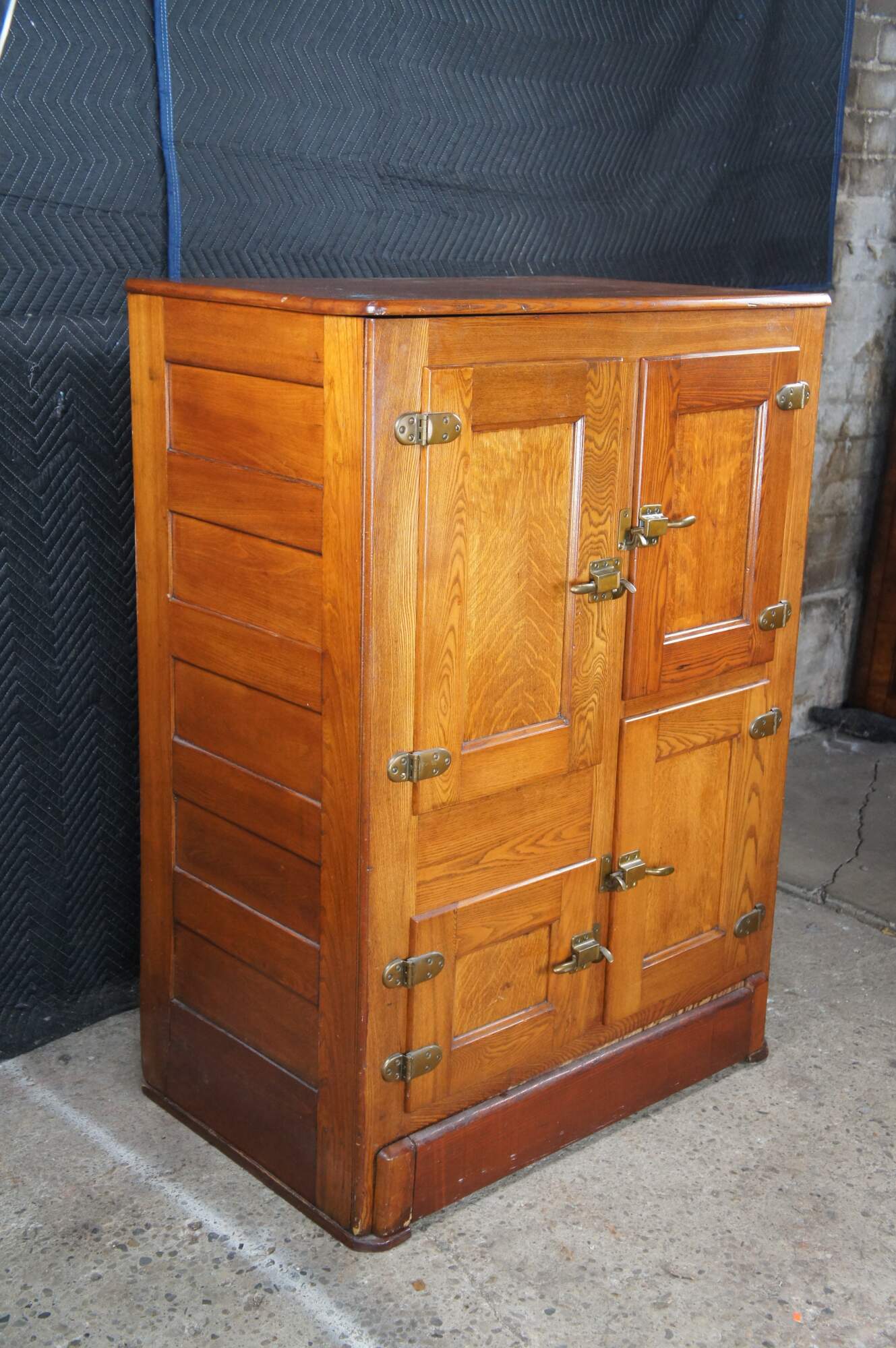 Antique Ice Chest sold by Belknap Hardware circa 1919. Made quartersawn oak with a stout rectangular frame featuring four doors, original brass hardware and paneled sides. Interior has been retrofitted for use as a storage cabinet with green felt lined shelves that are removable. Includes antique cast iron ice block tongs.
