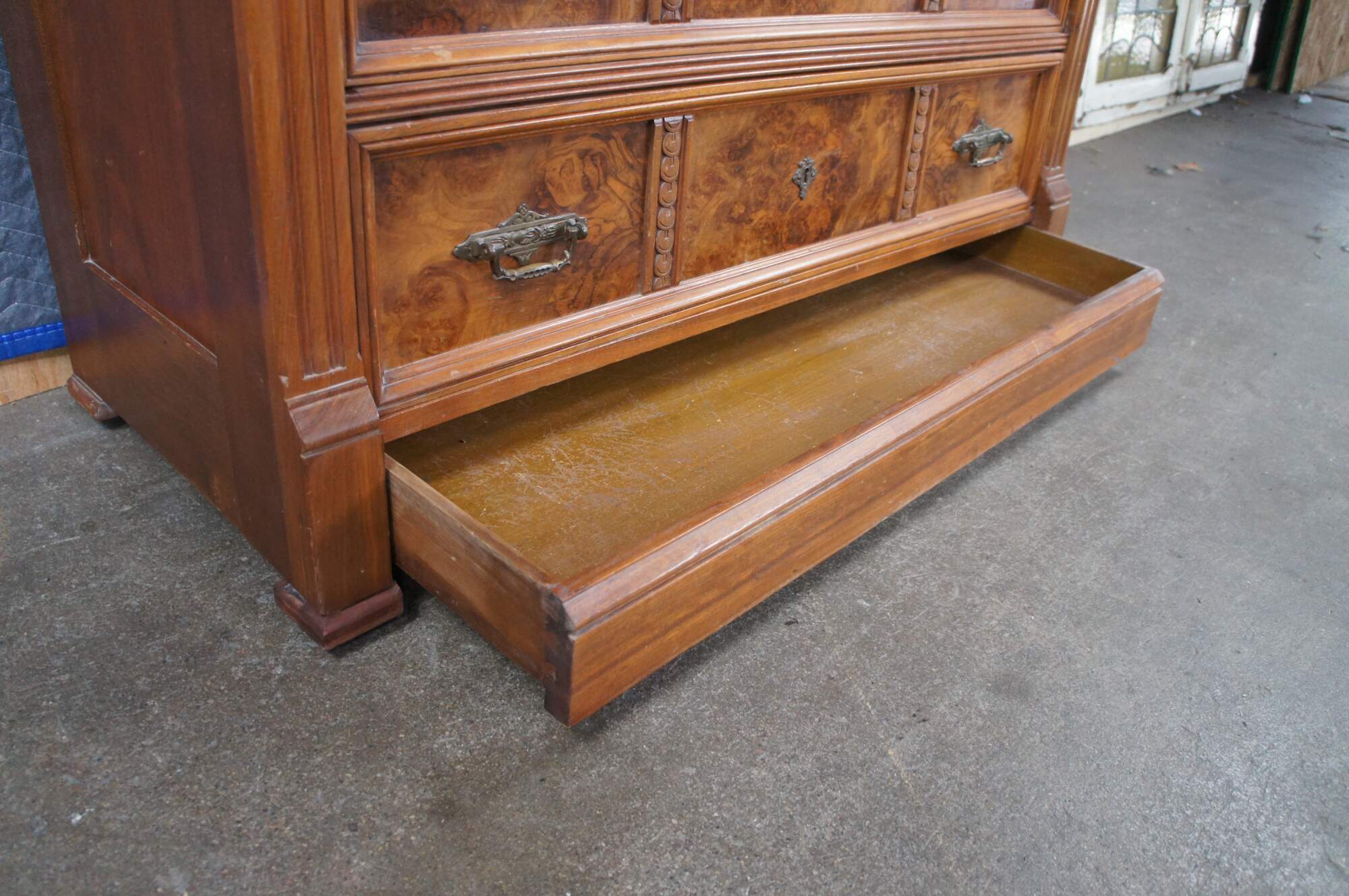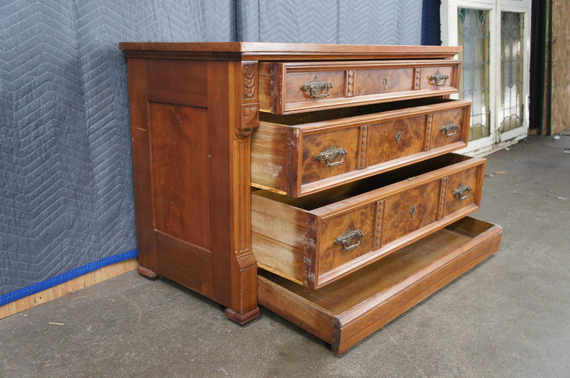 This gorgeous Victorian era dresser comes from the aesthetic period, circa 1880s. Made from walnut with three graduated drawers set between pronounced stiles with carved daisies over an apex medallion and fluting. The dresser features a hidden drawer set in the lower apron. Drawer fronts showcase burled walnut veneer and aesthetic period brass hardware with an escutcheon plate at the center.