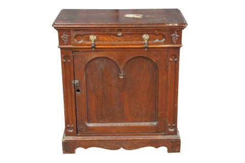 American Victorian Gothic Revival hall chest, console table or cabinet. Circa 1870s. Features a rectangular form made from walnut with a hand dovetailed inset paneled drawer flanked by grape carvings, over a lower cabinet with gothic style arched door. The cabinet opens to one shelf for accessory storage. The upper drawer features brass knocker pulls. Drawer is hand planed along the underside.