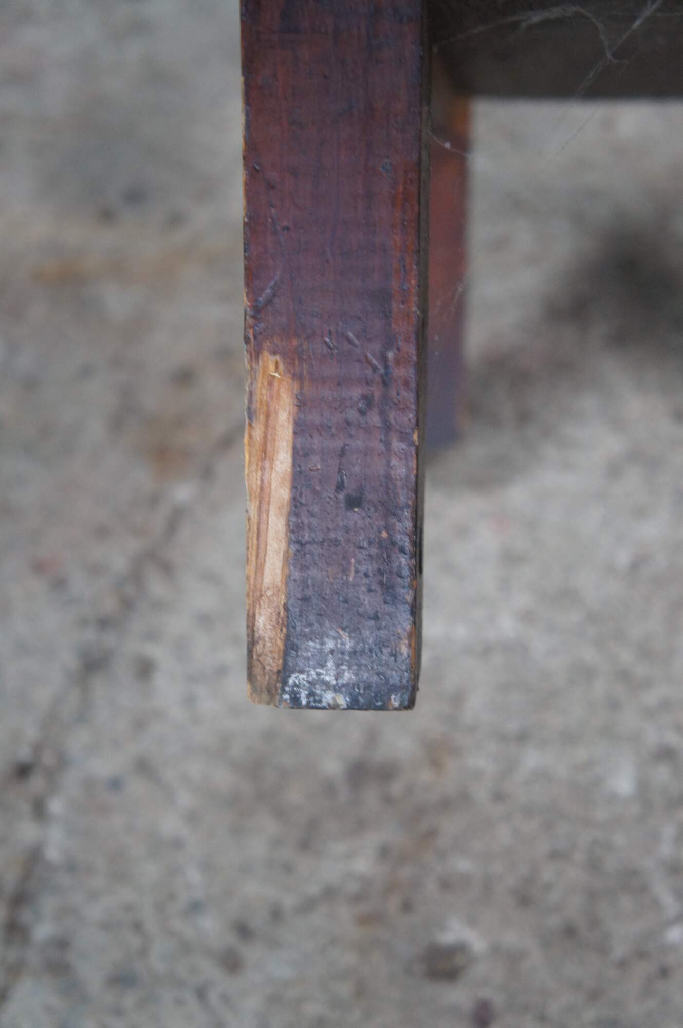 Structurally solid, heavy wear and distressing, scuffing, finish loss, splitting, chipping, hole from missing dowel.