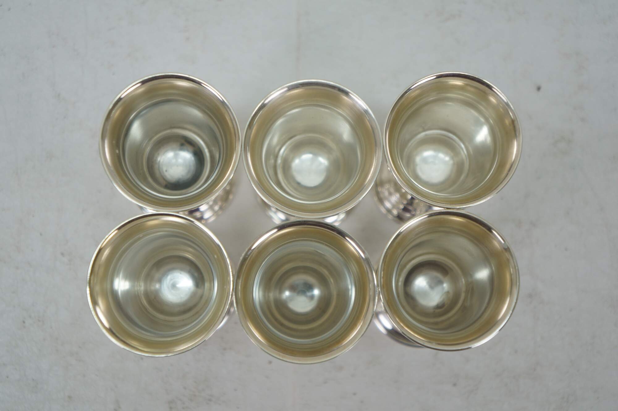 Set of 6 sterling silver miniature goblet shaped liquor / port / cordial / aperitif glasses. Weight 24.6 g each or approximately 150 g total. Marked Sterling on edge of base.