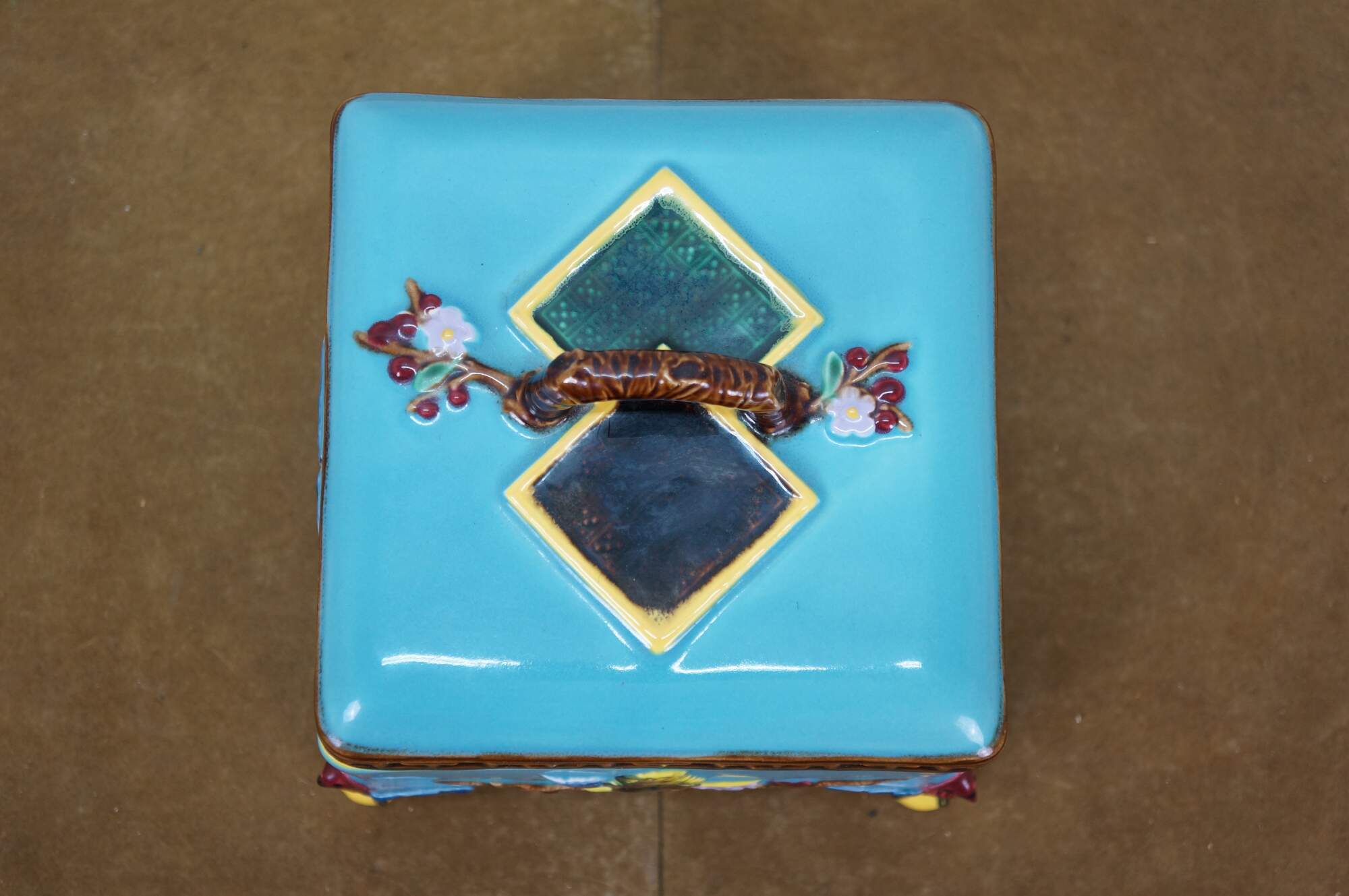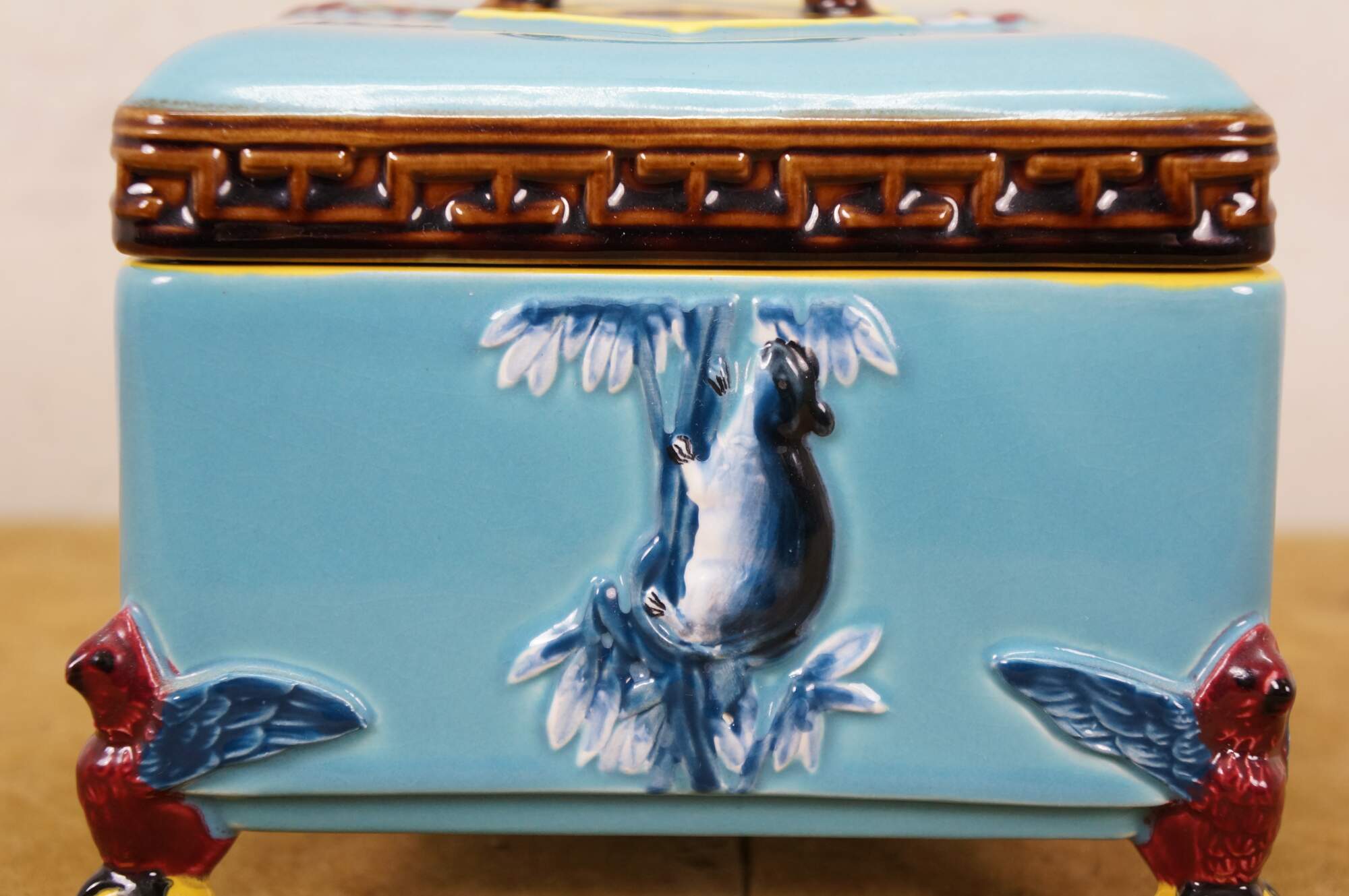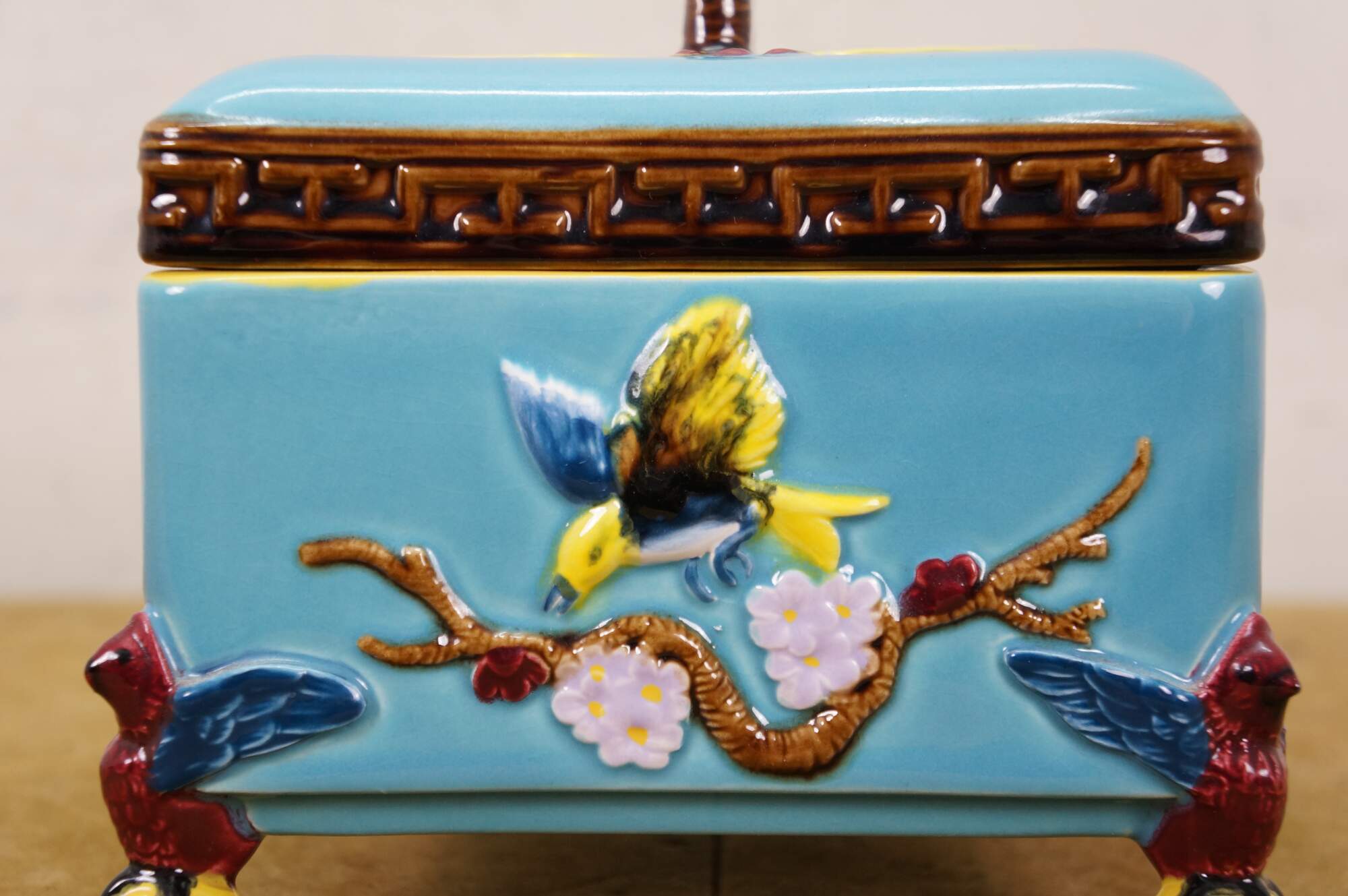 Late 20th century Chinoiserie / majolica style porcelain trinket box by Mottahedeh. Square turquoise box with feet fashioned of red birds clutching yellow orbs. Sides decorated with birds flying over flowering branches and blue squirrels. Lid features a brown Chinoiserie border and branch shaped handle over overlapping diamonds. Turquoise blue interior with yellow trim. Made in Italy.