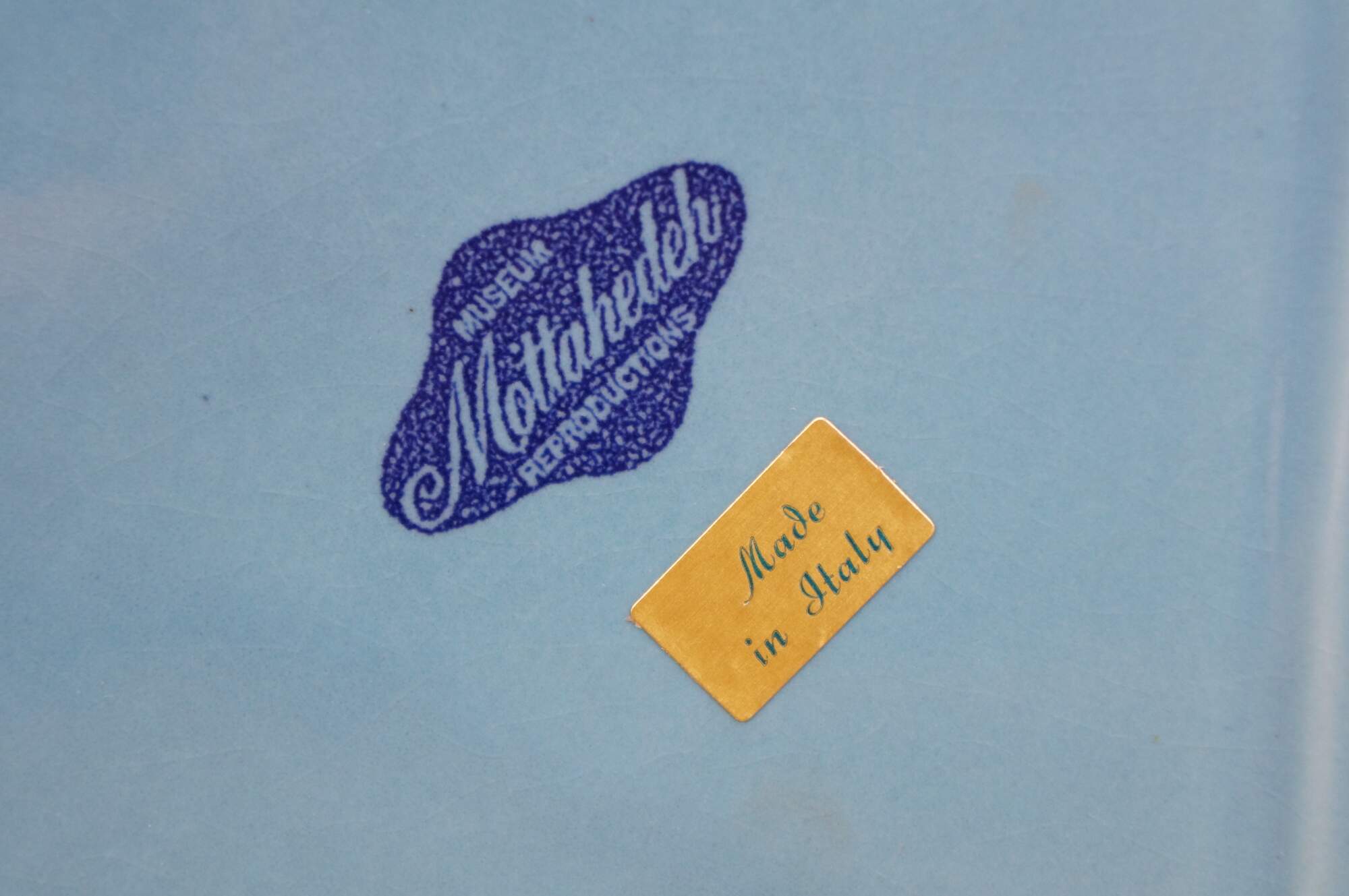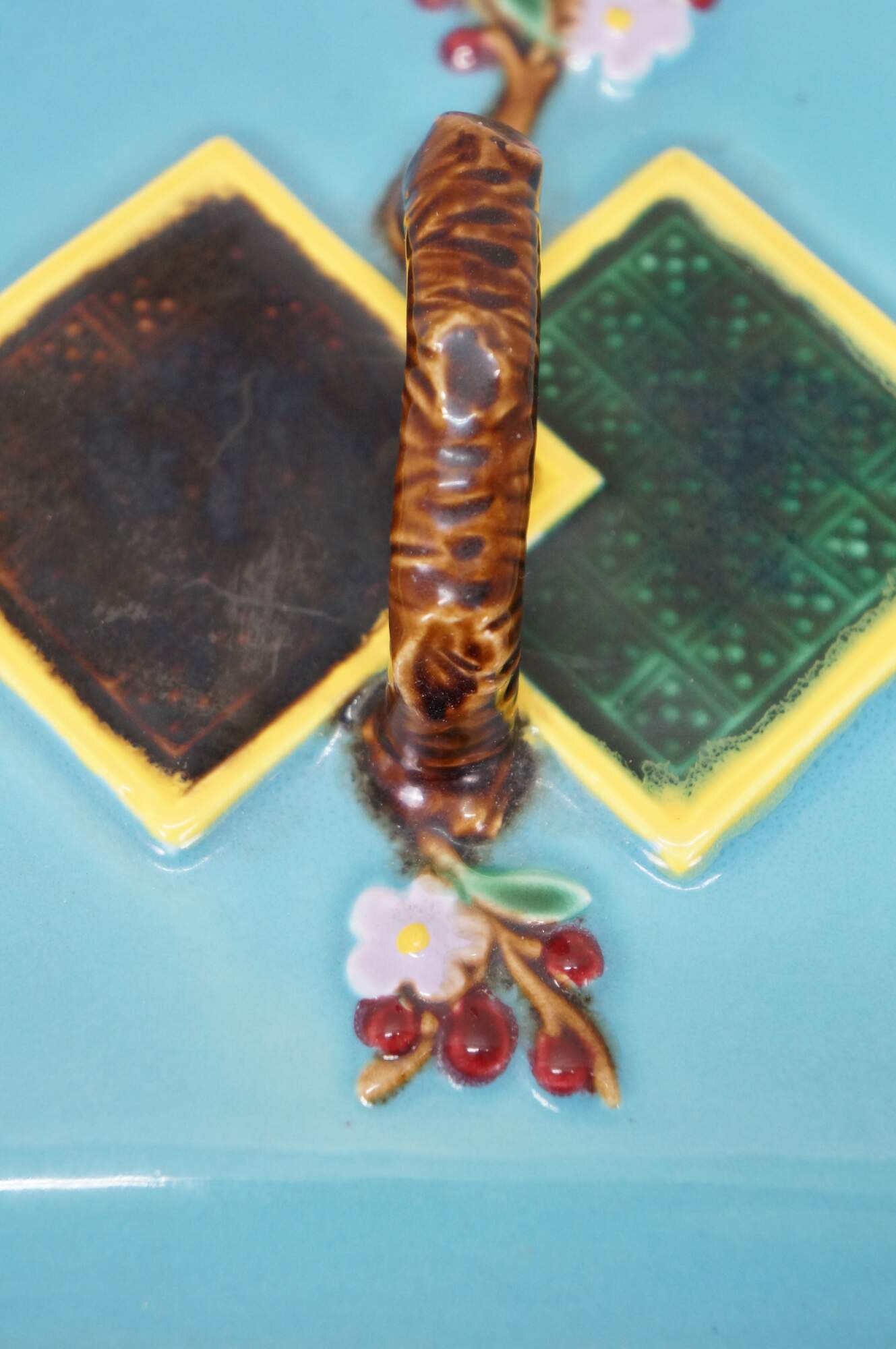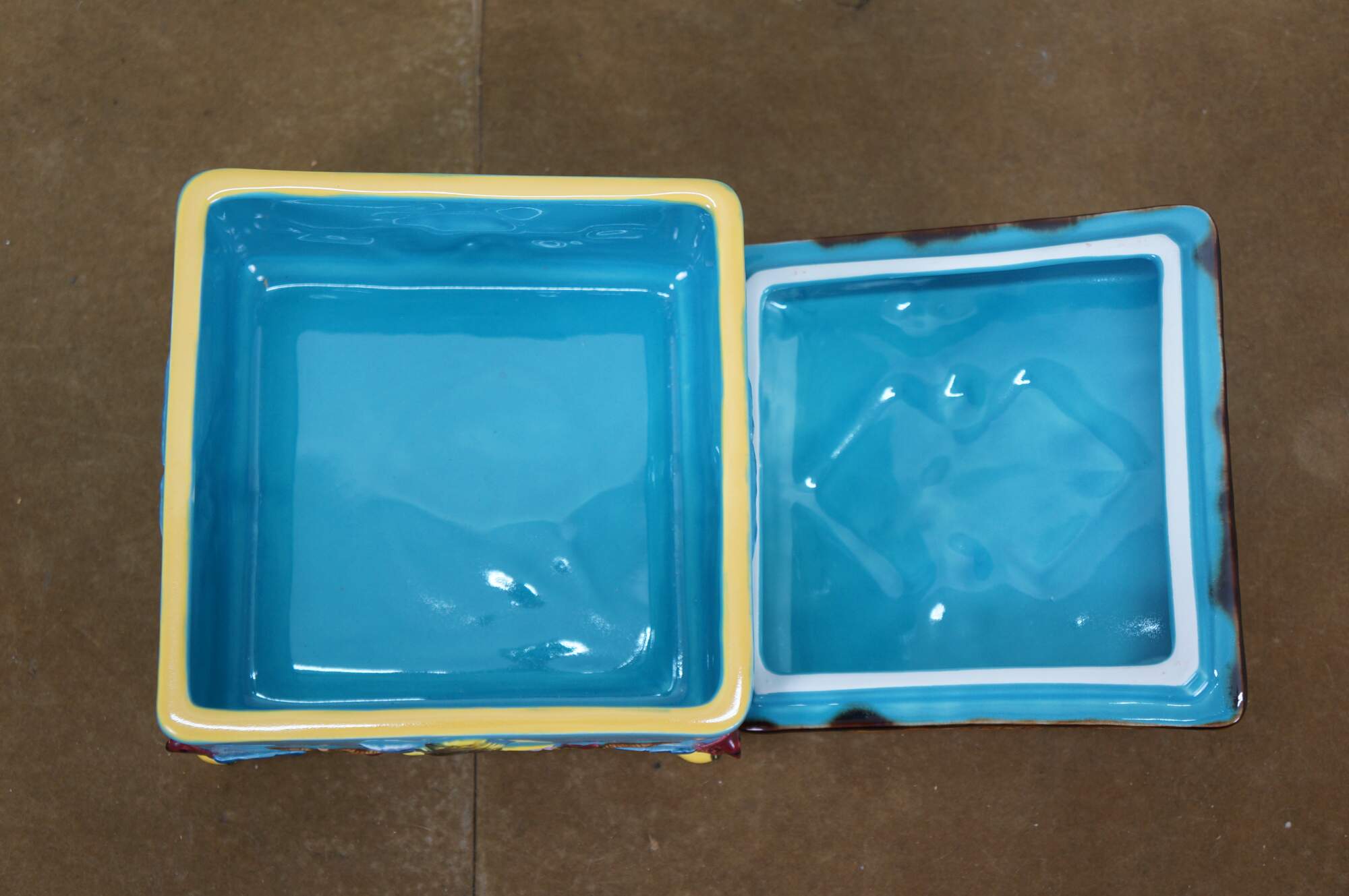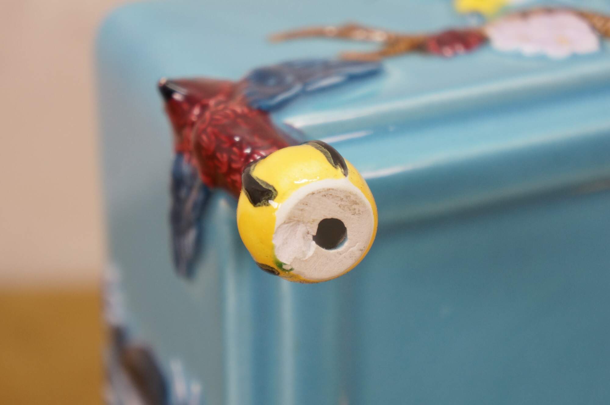 Late 20th century Chinoiserie / majolica style porcelain trinket box by Mottahedeh. Square turquoise box with feet fashioned of red birds clutching yellow orbs. Sides decorated with birds flying over flowering branches and blue squirrels. Lid features a brown Chinoiserie border and branch shaped handle over overlapping diamonds. Turquoise blue interior with yellow trim. Made in Italy.