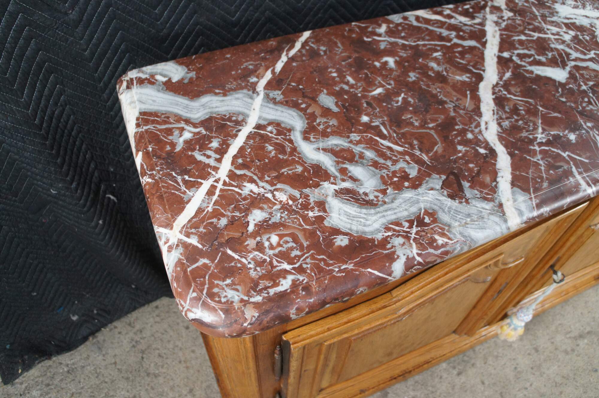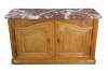 Striking Mid 18th Century French Louis XIV style Hunting Cabinet. Made from oak with a thick ruege marble beveled top over an oak case with two hand dovetailed knife drawers and a larger lower domed cabinet for storage with working lock and key. The buffet rest on molded plinth base. A remarkable addition to any space.