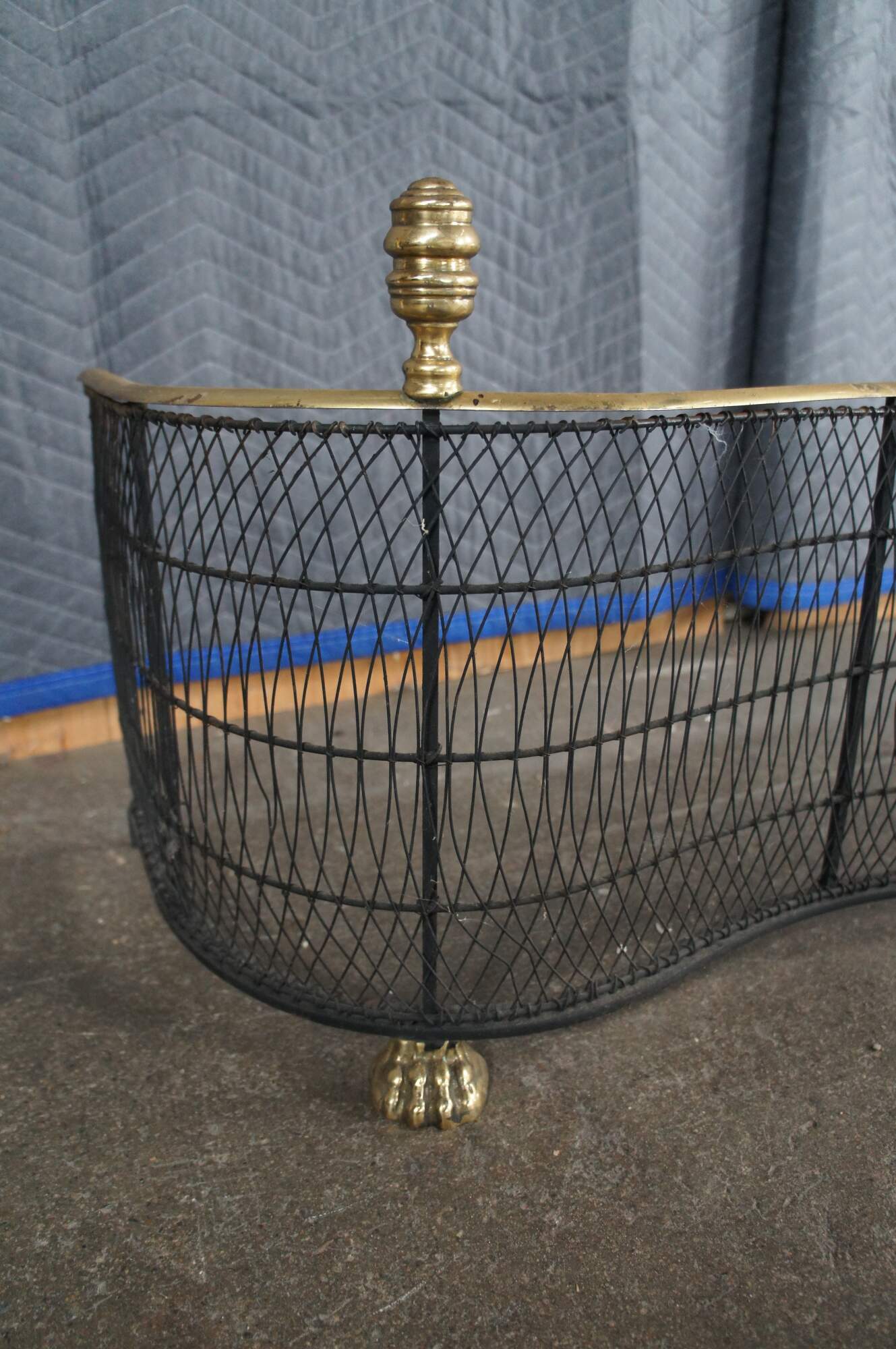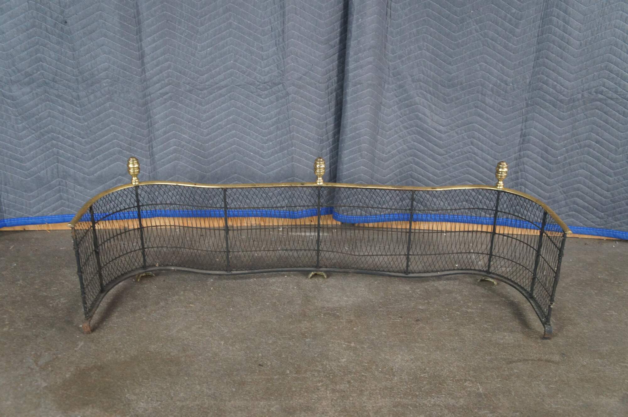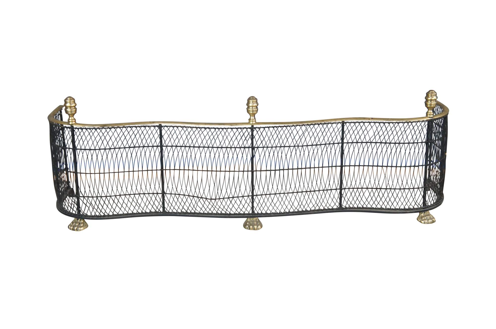 Virginia Metalcrafters Federal / Georgian style Fireplace Fender, Circa 1970s. Features a serpentine iron frame with curved lattice mesh accented by brass trim, finials and ornate paw feet. This fender offers a taller stature than most making for a stately addition to any space.