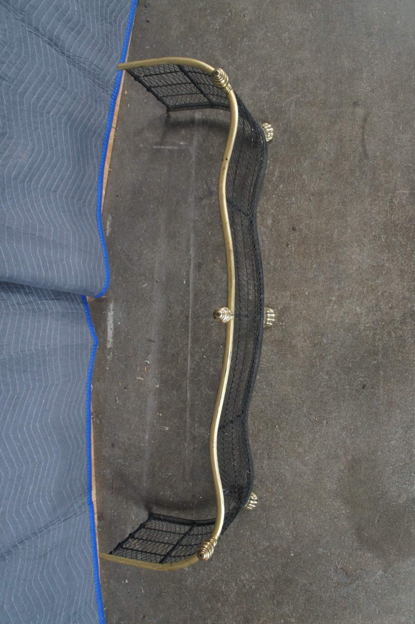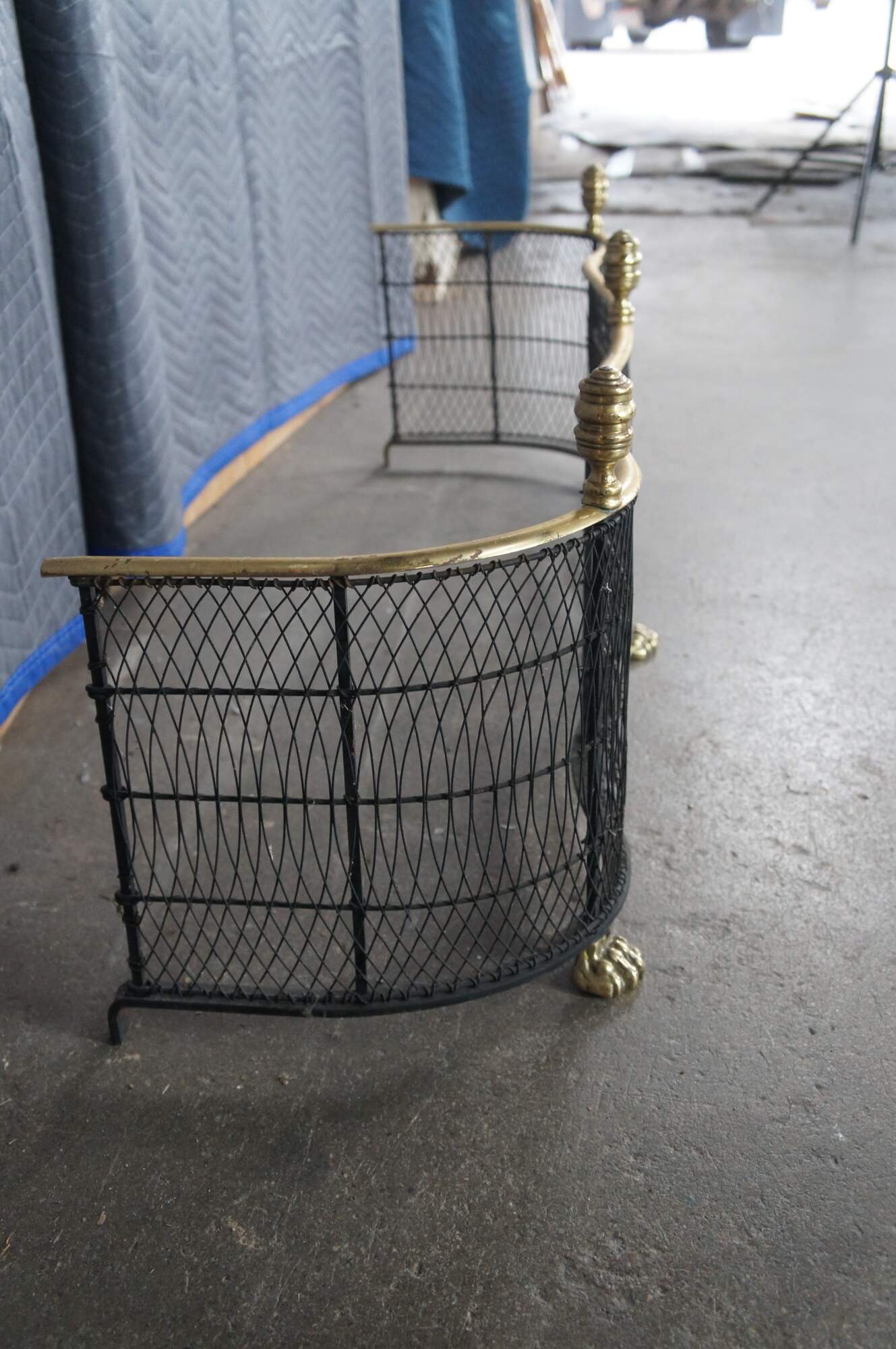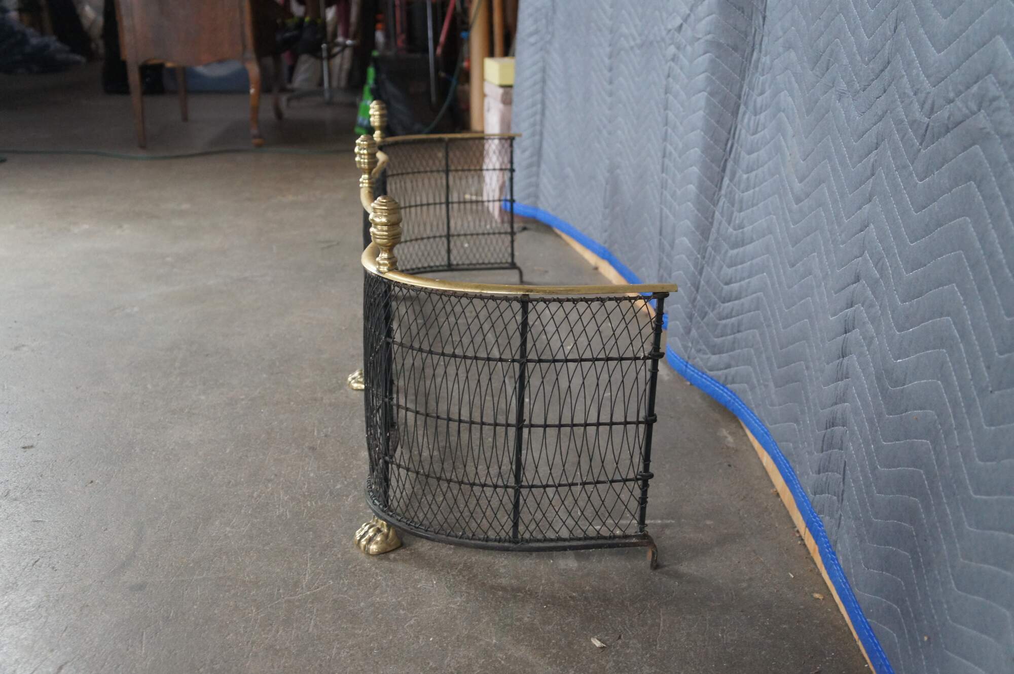 Virginia Metalcrafters Federal / Georgian style Fireplace Fender, Circa 1970s. Features a serpentine iron frame with curved lattice mesh accented by brass trim, finials and ornate paw feet. This fender offers a taller stature than most making for a stately addition to any space.