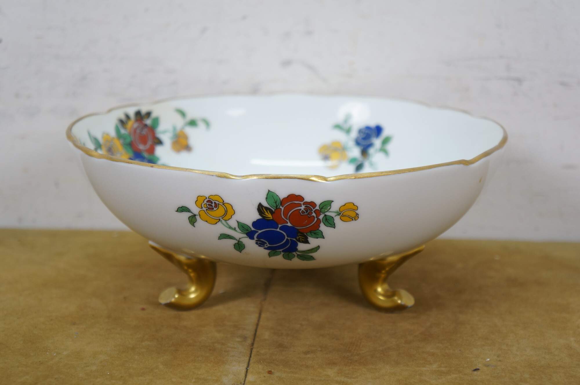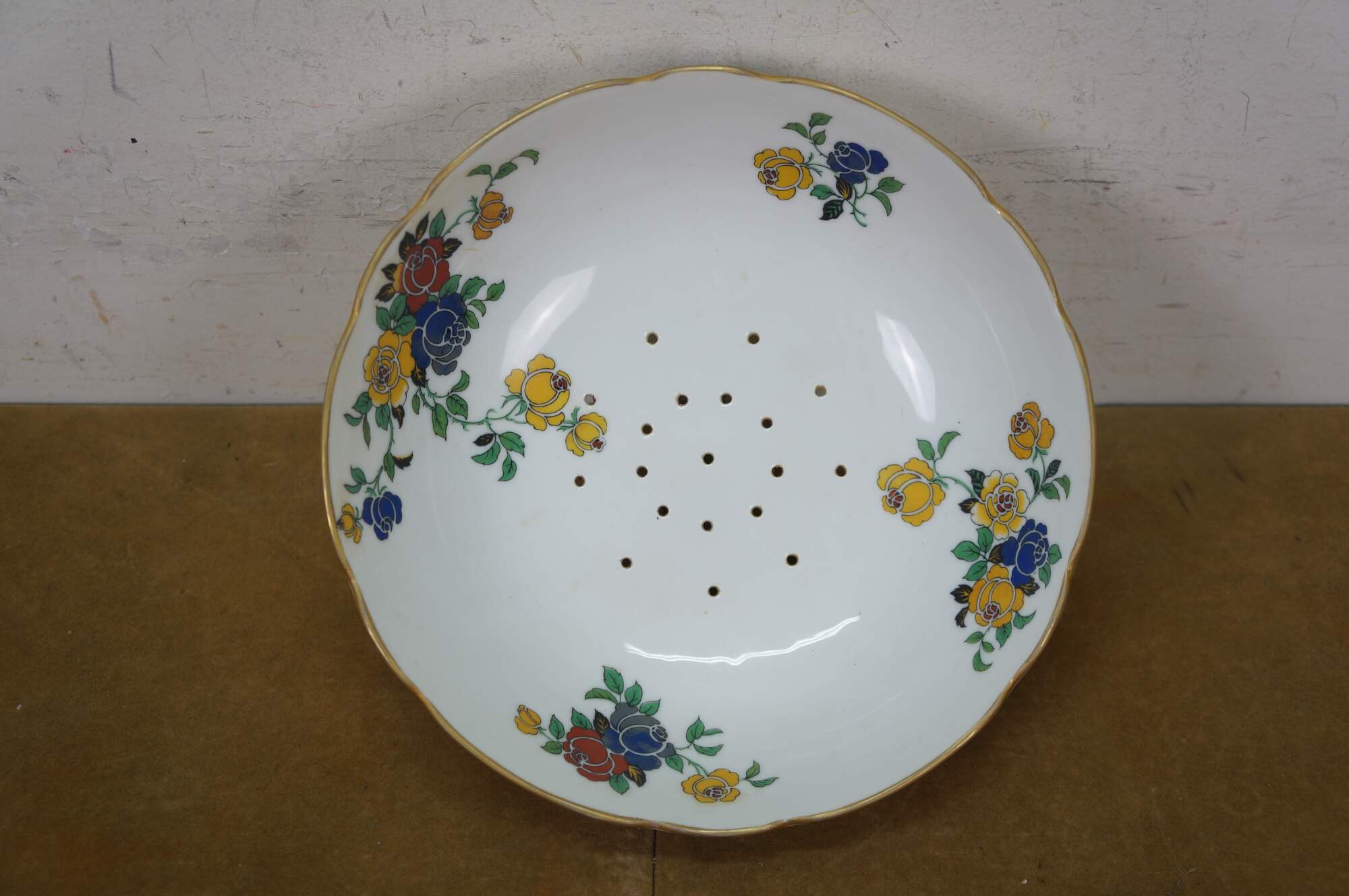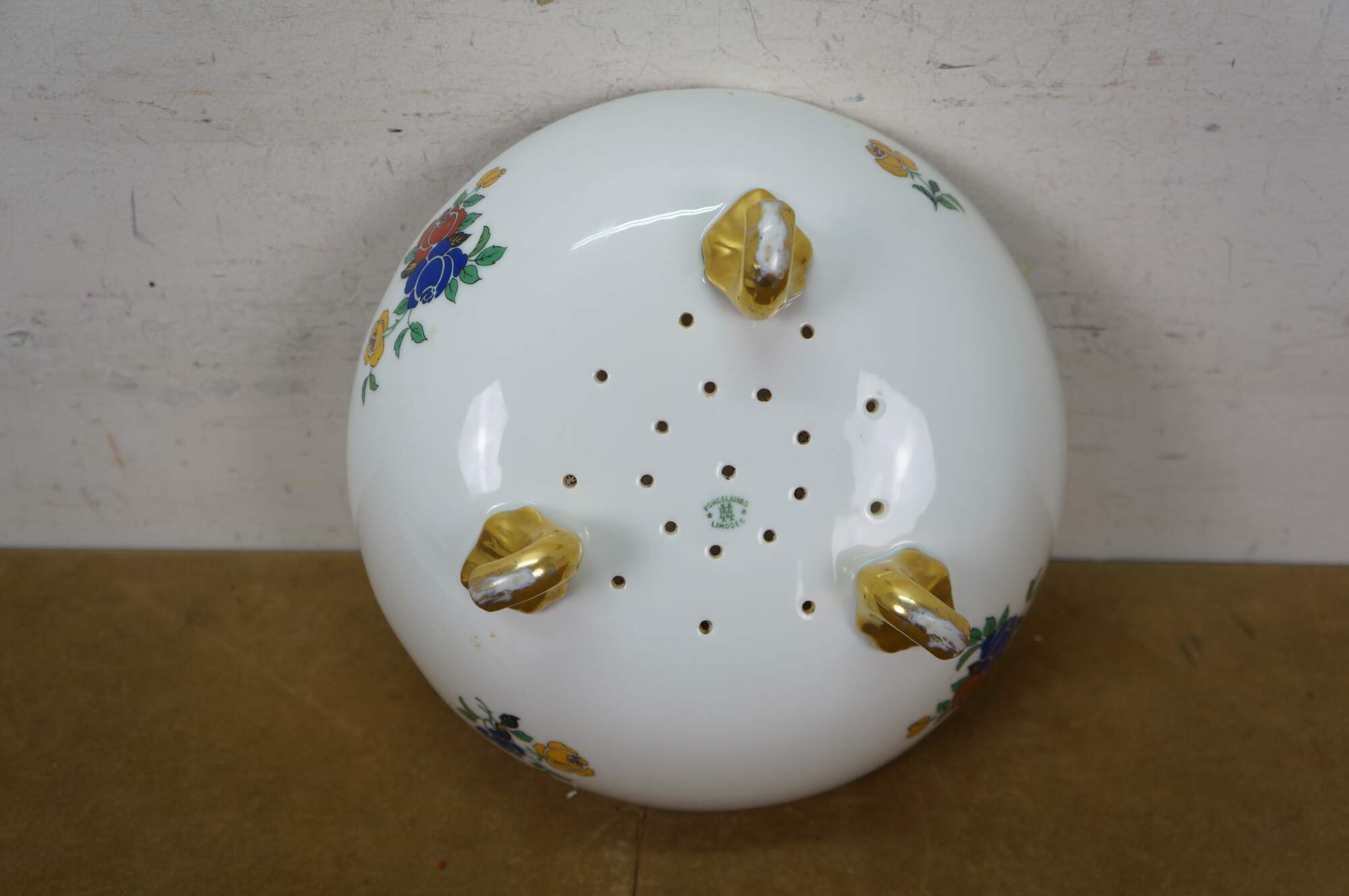Antique Art Nouveau Limoges porcelain footed berry bowl with drain holes and underplate by Emil Madesclaire. White porcelain with gilt accents, printed with a stylized floral design of red, blue, and yellow roses.