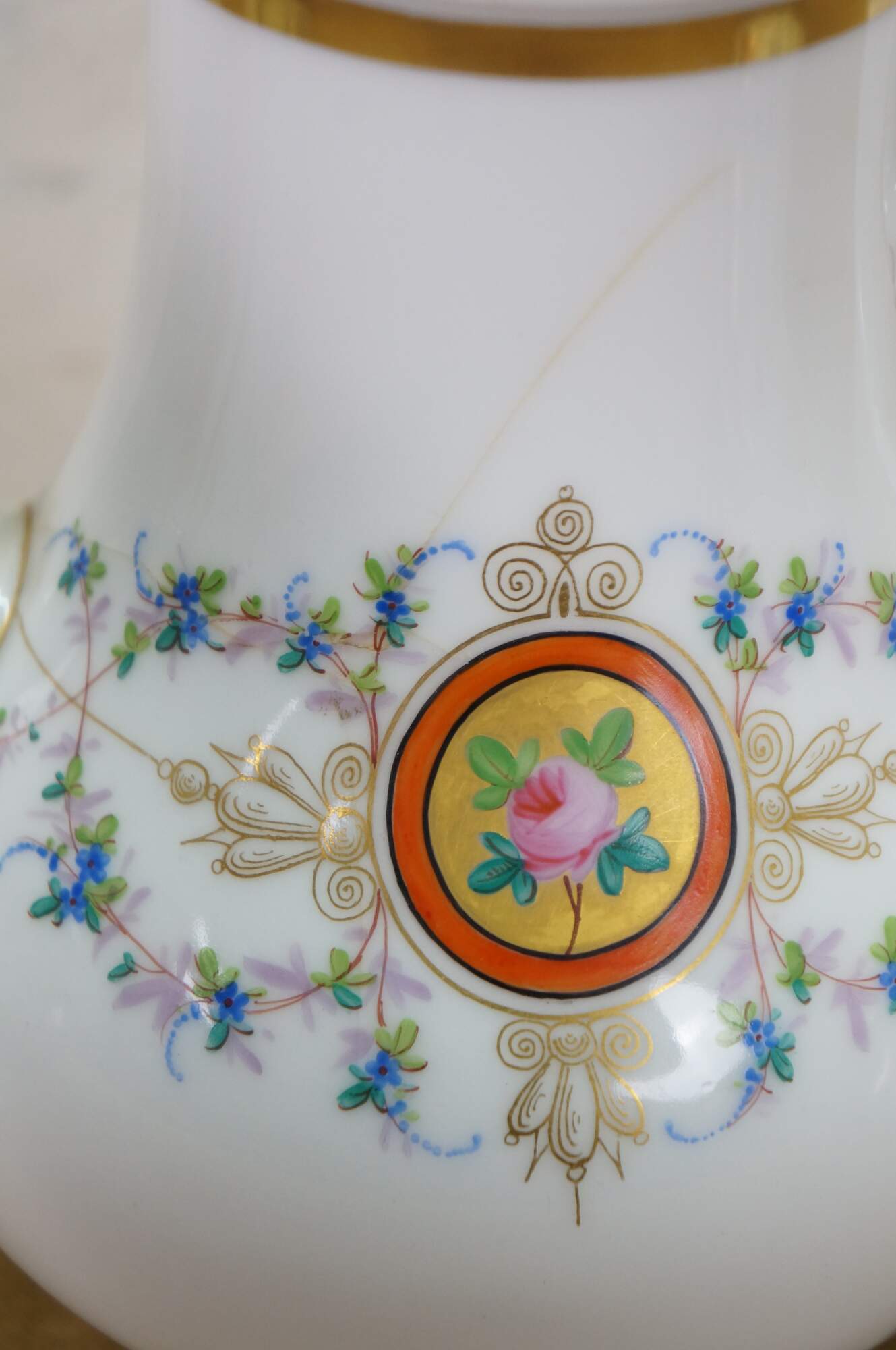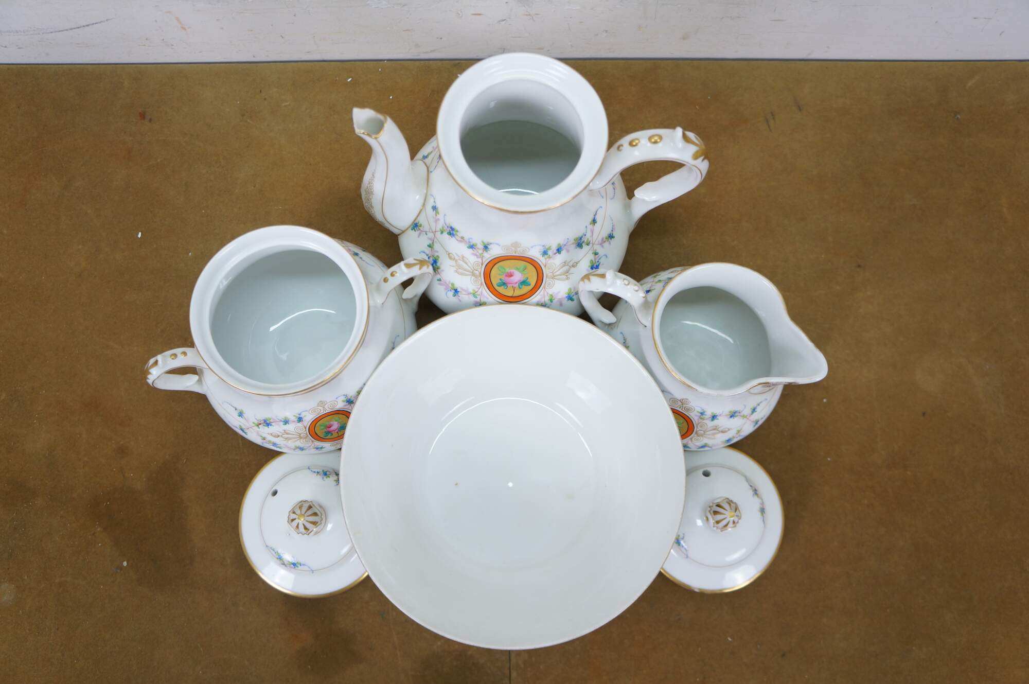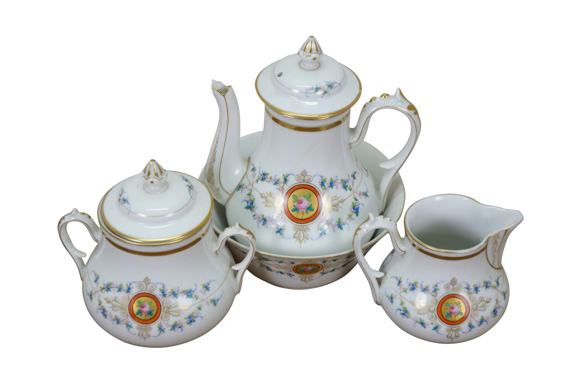 Antique 6 piece hand painted porcelain tea set. Decorated with pink roses on an orange and gold medallion, surrounded by swirling gilt and blue floral vines. Set includes: Teapot with Lid, Sugar Bowl with Lid, Creamer, and Serving Bowl. Marked 13 on bases.