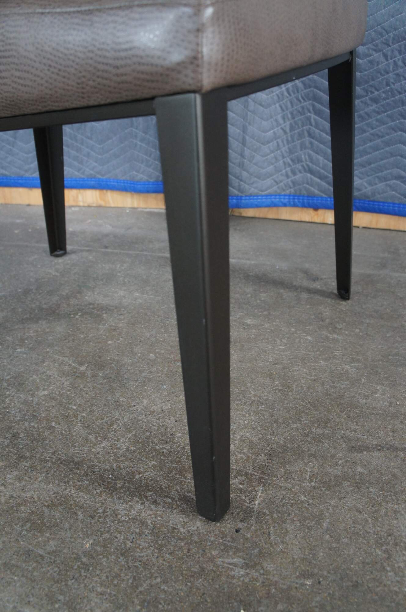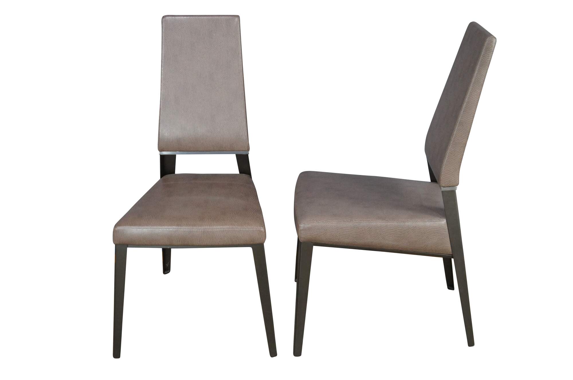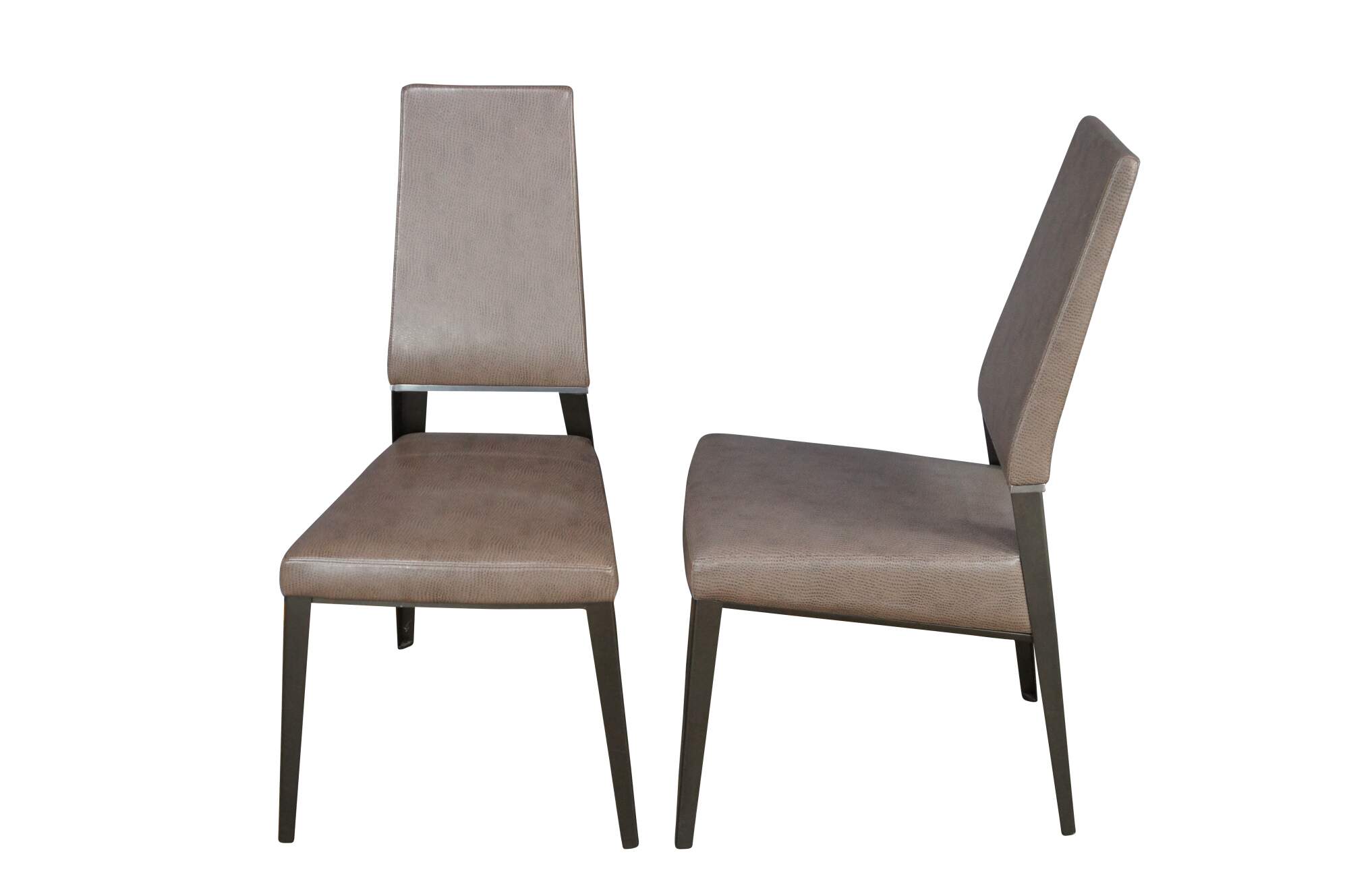 8 Elite Manufacturing Vivian Dining Chairs. Tall and elegant, with shapely tapered legs and just a hint of sparkle. Crisply tapered and tailored forms create a striking silhouette, while providing comfort and support. Vivians sparkle comes from a polished stripe of solid aluminum, which links the extra tall upholstered back with the sturdy steel frame. Upholstered in a brown faux ostrich leather. MSRP $10,000