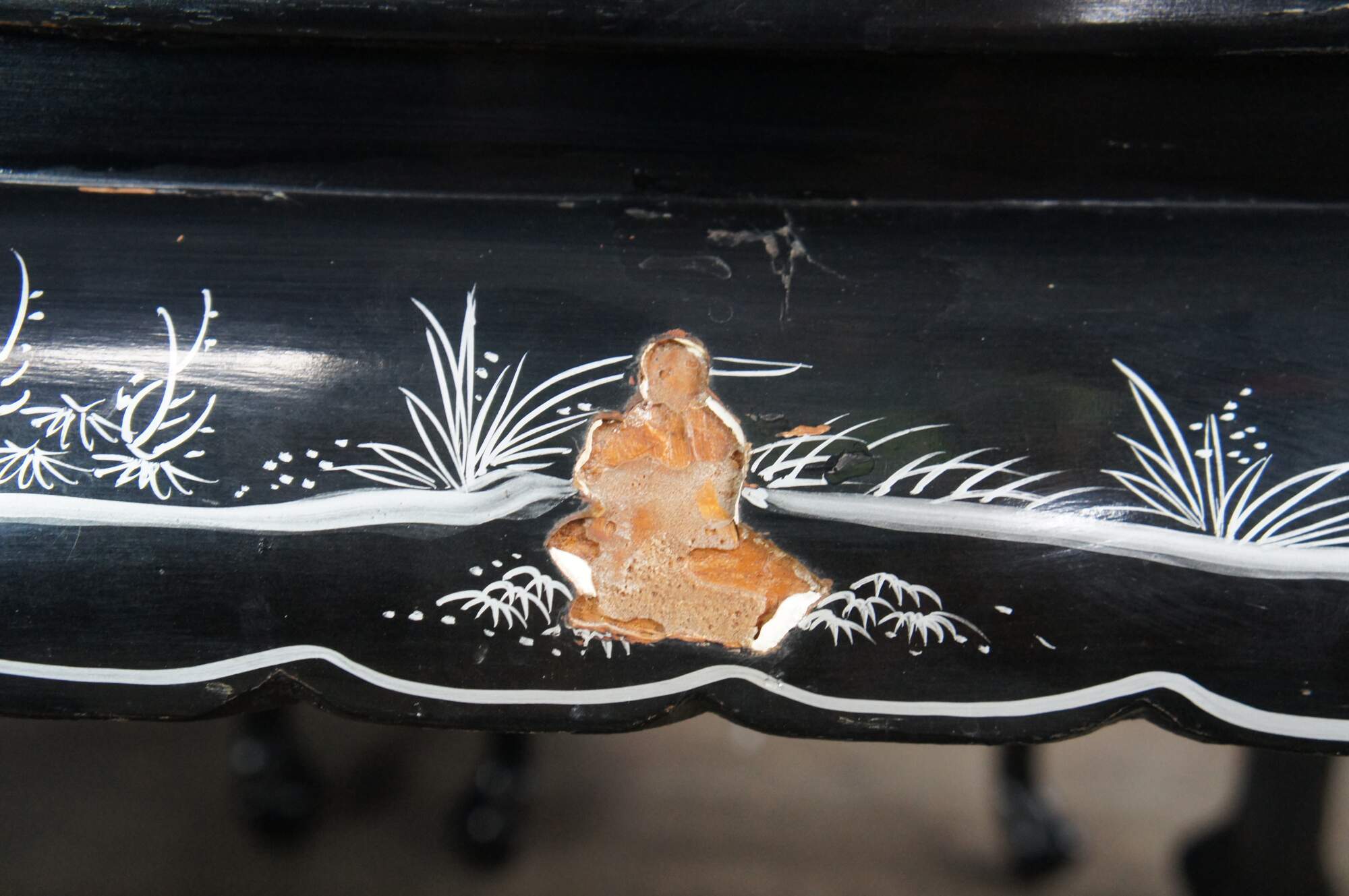 Vintage Chinese Chinoiserie black lacquered coffee or tea nesting table with six chairs. It features a Pagoda landscape scene with carved soapstone and Mother of Pearl Geisha figures listening to a musician on the garden terrace, which overlooks mountains and an Island with a Temple. The table features a glass top and is supported by carved bat / dragon legs with claw foot. Made in Hong Kong.