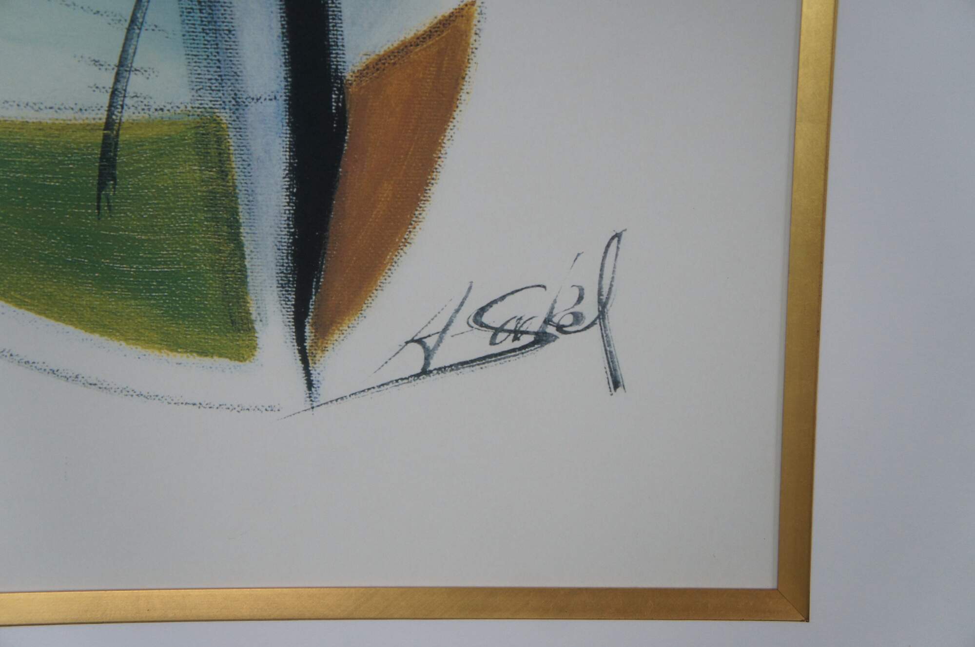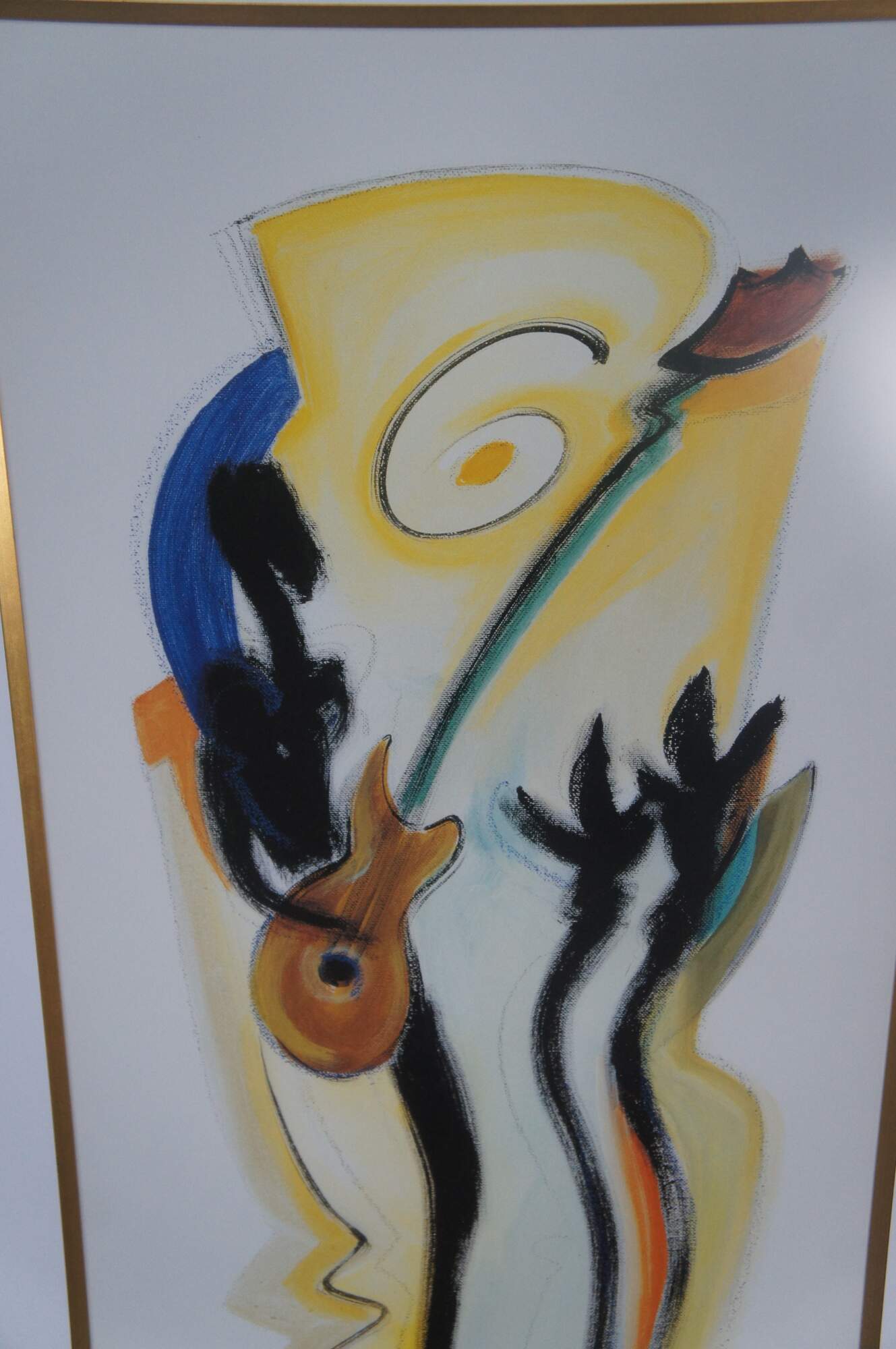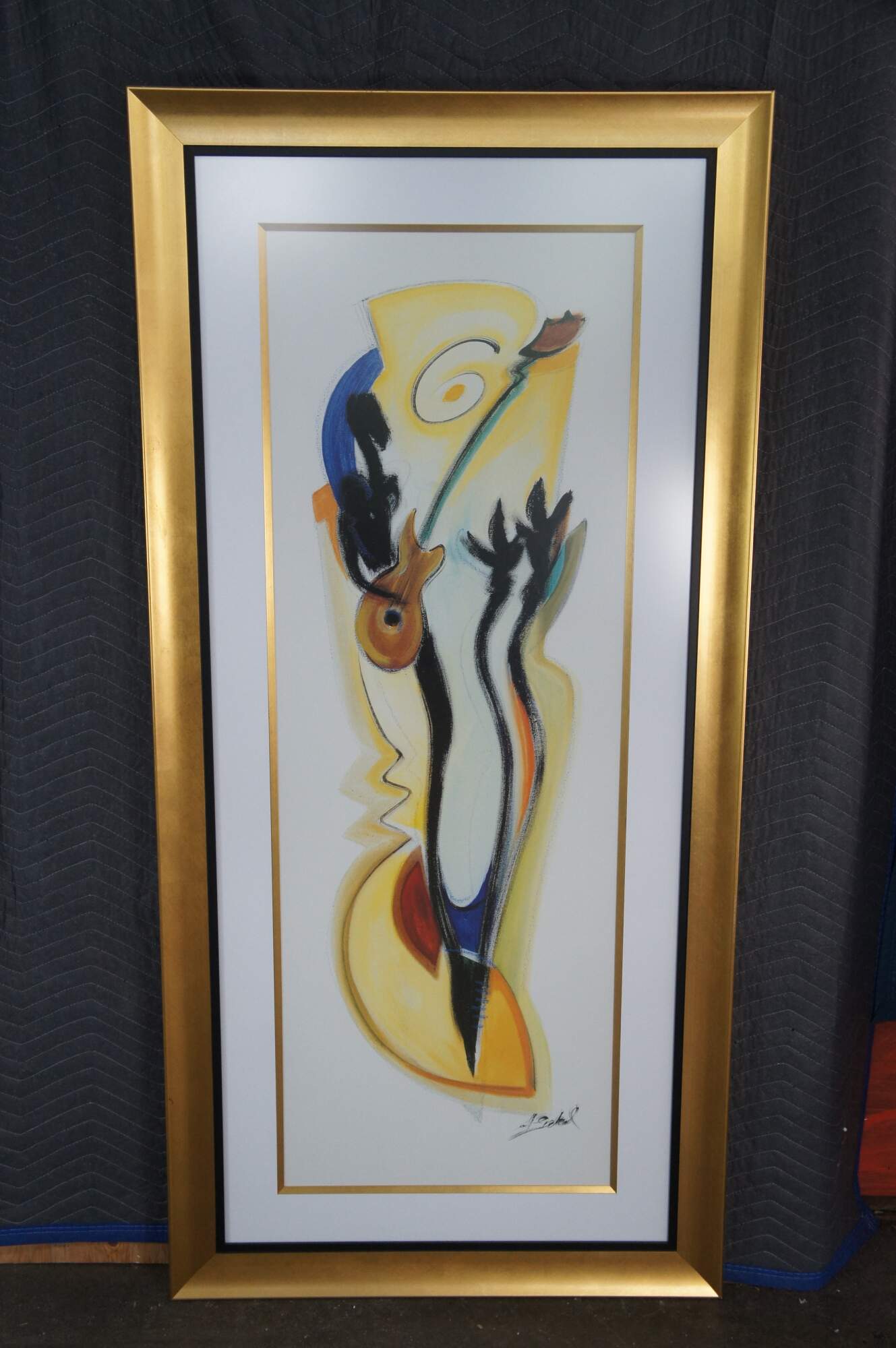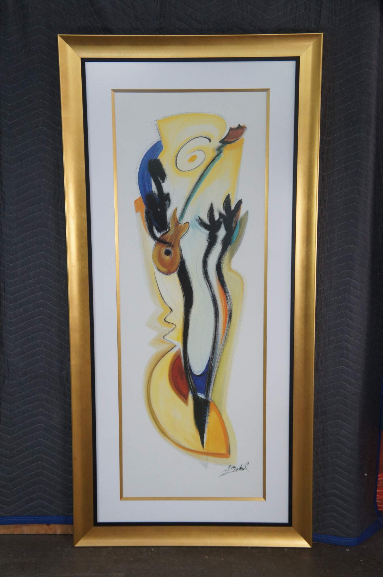 Large pair of Alfred Gockel prints. Each showcases a silhouette of a musician. Framed in gold.