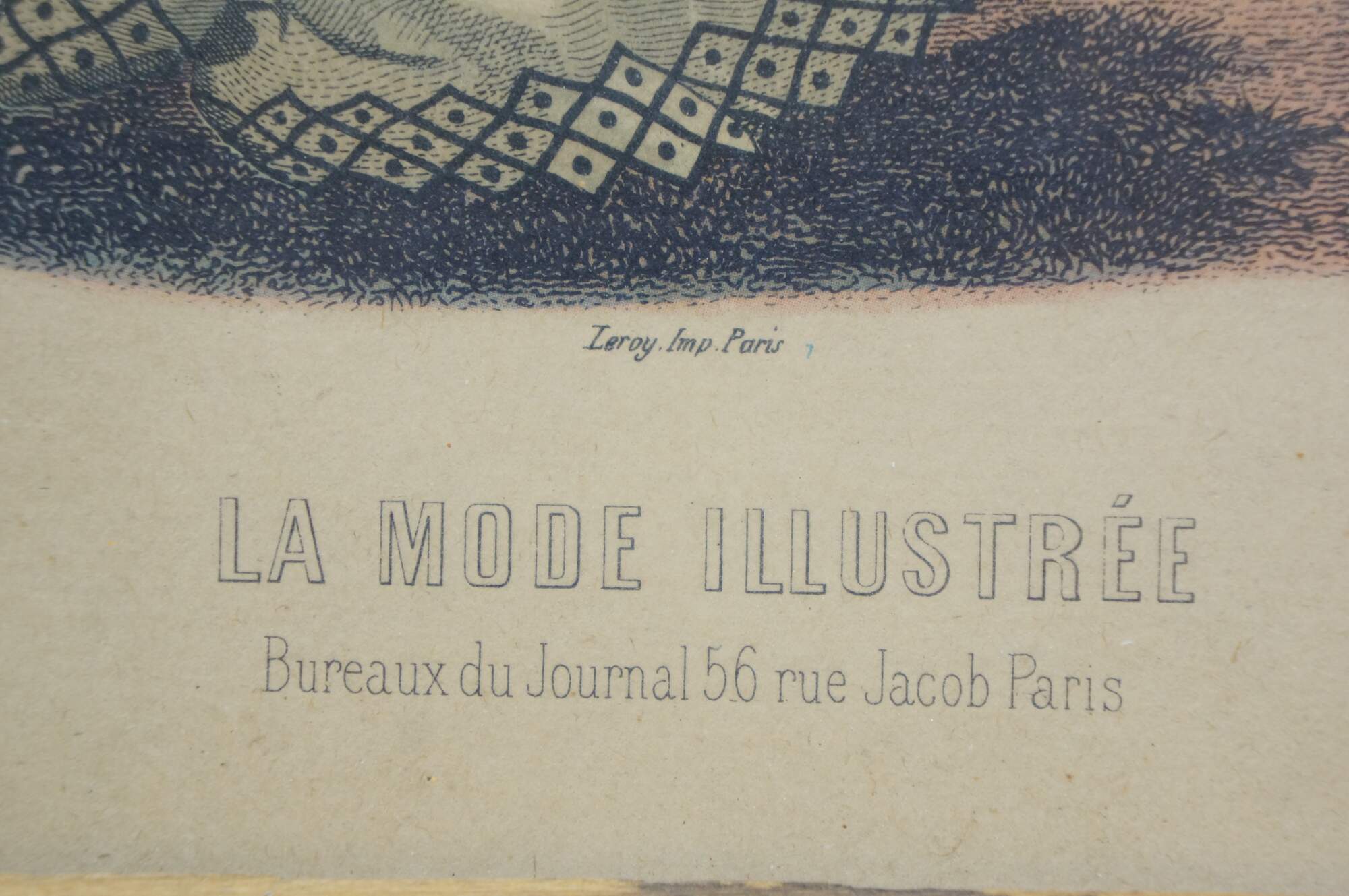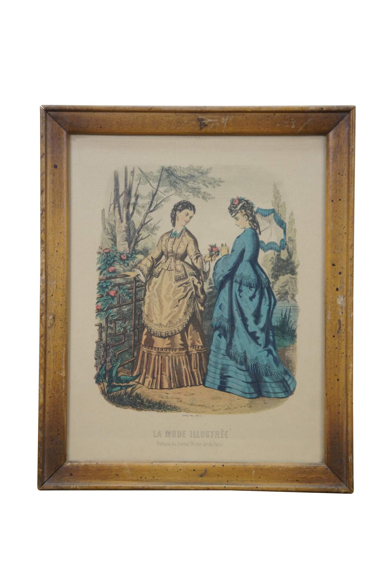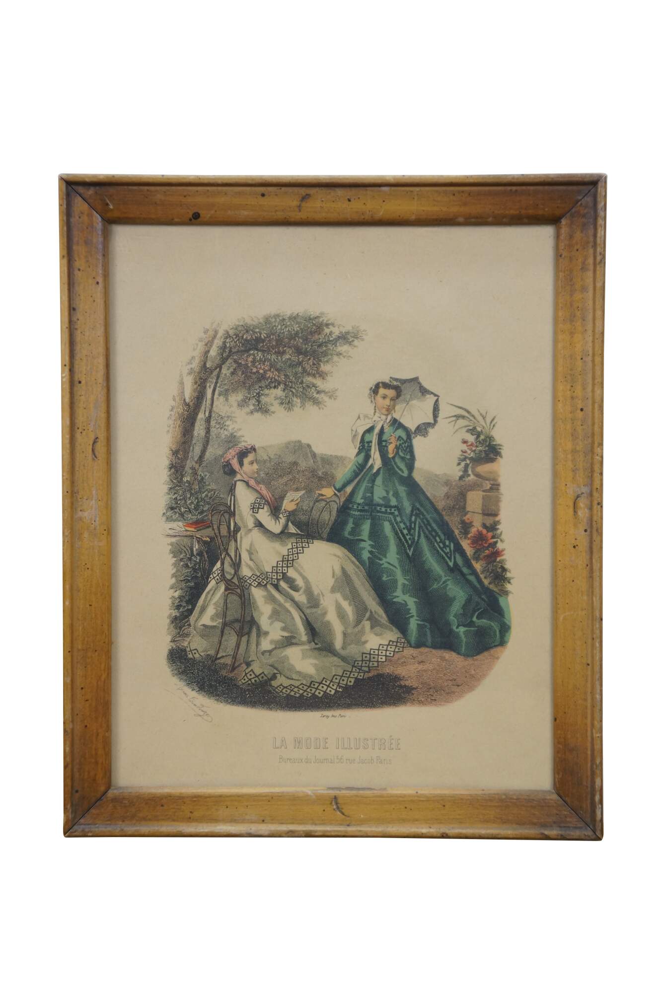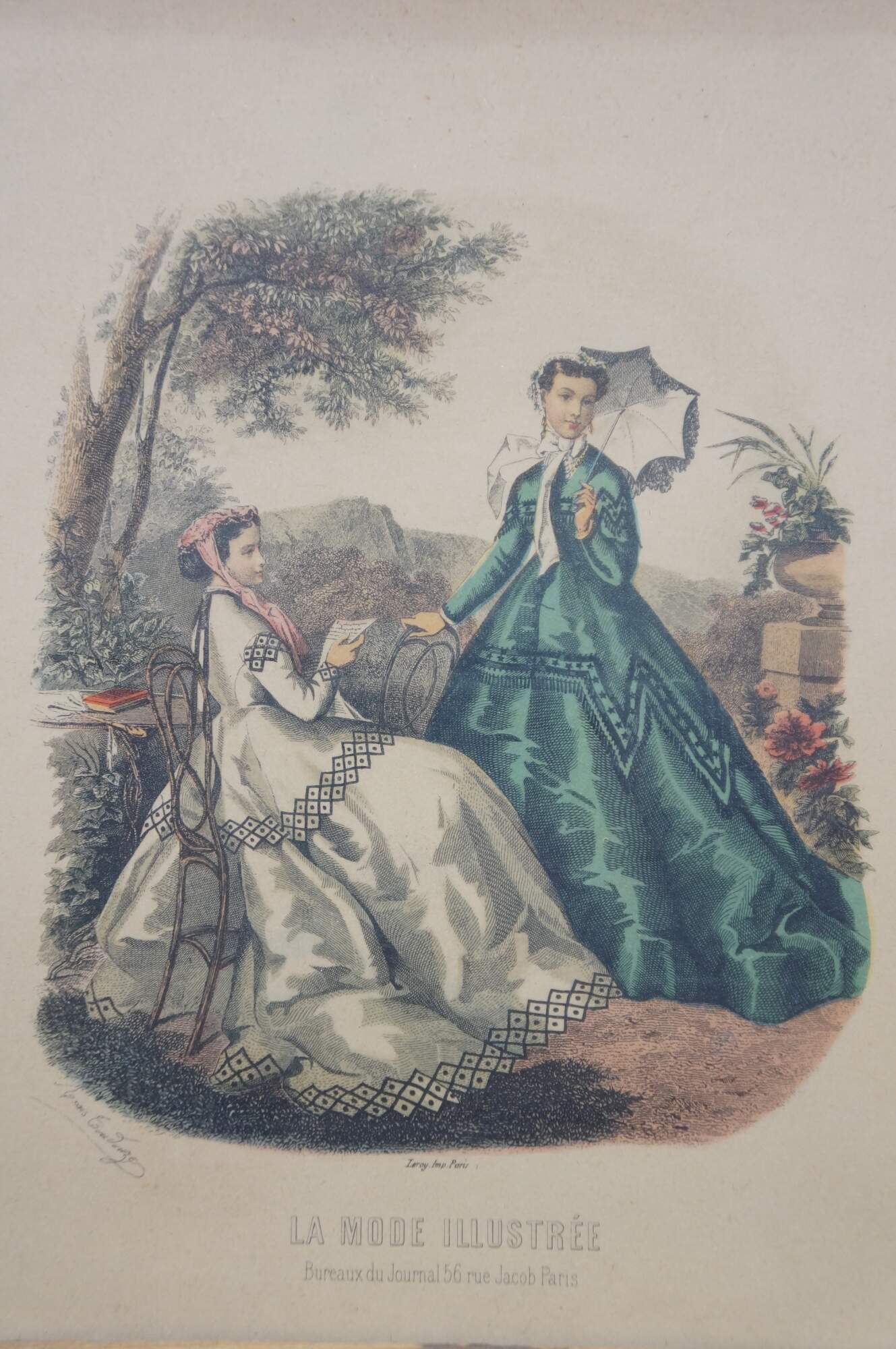 Pair of mid to late 19th century hand colored fashion etchings from Paris' La Mode Illustre magazine. Beveled wood frames.
