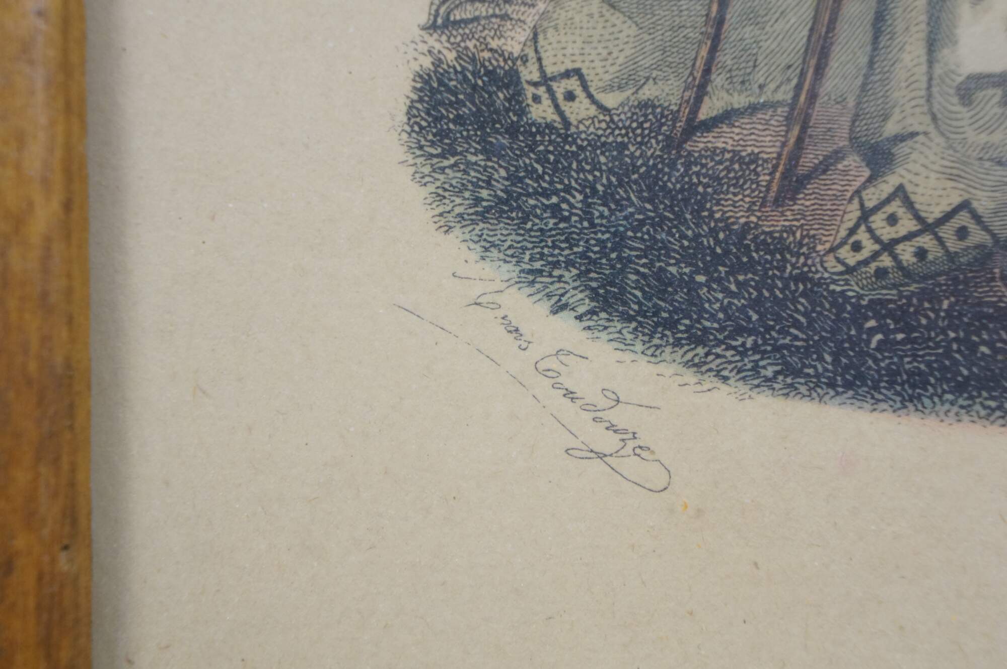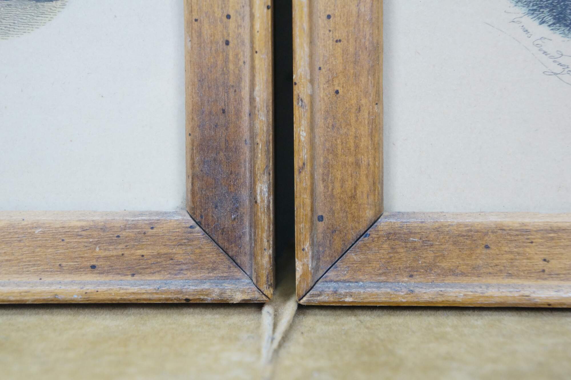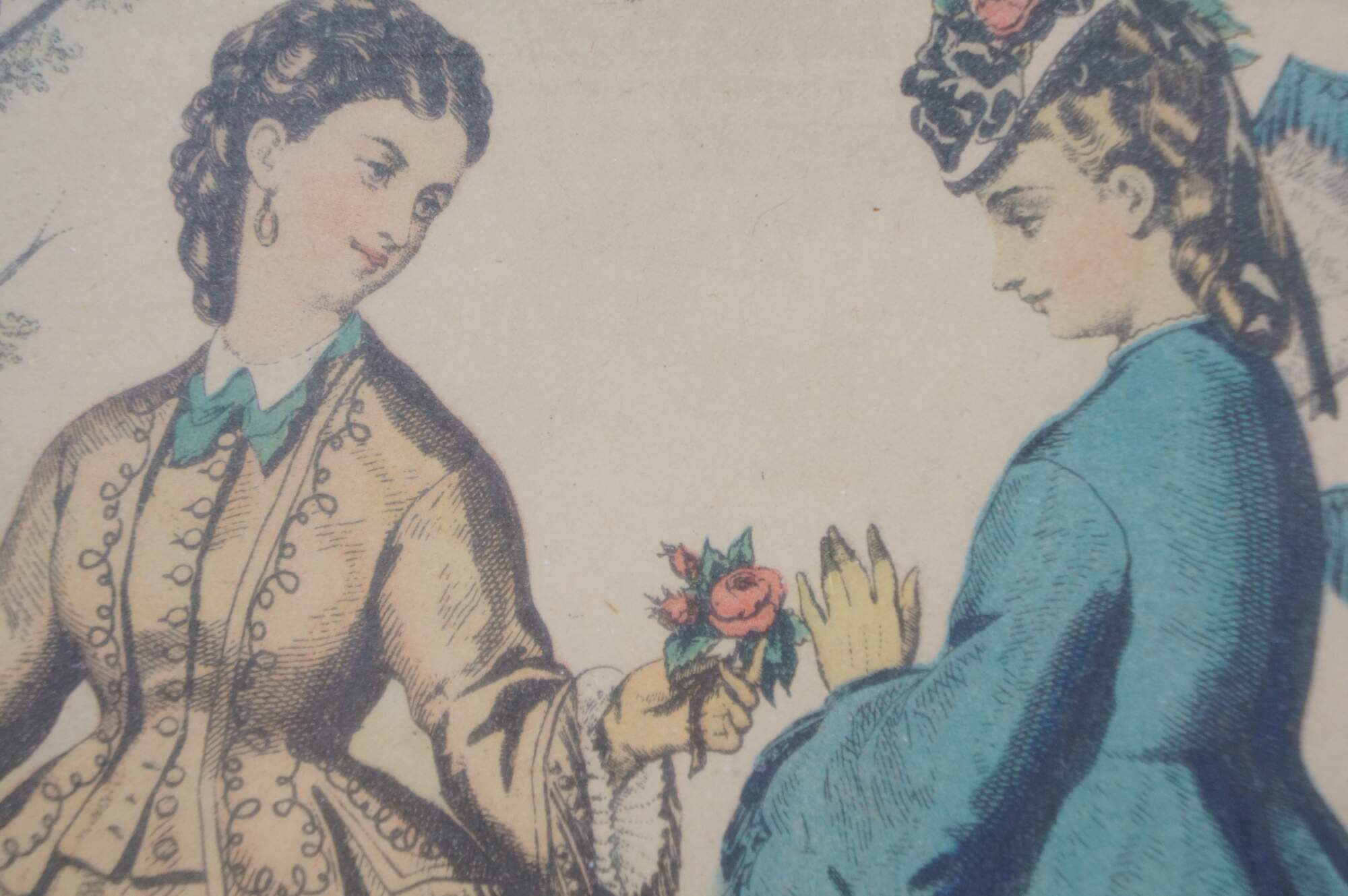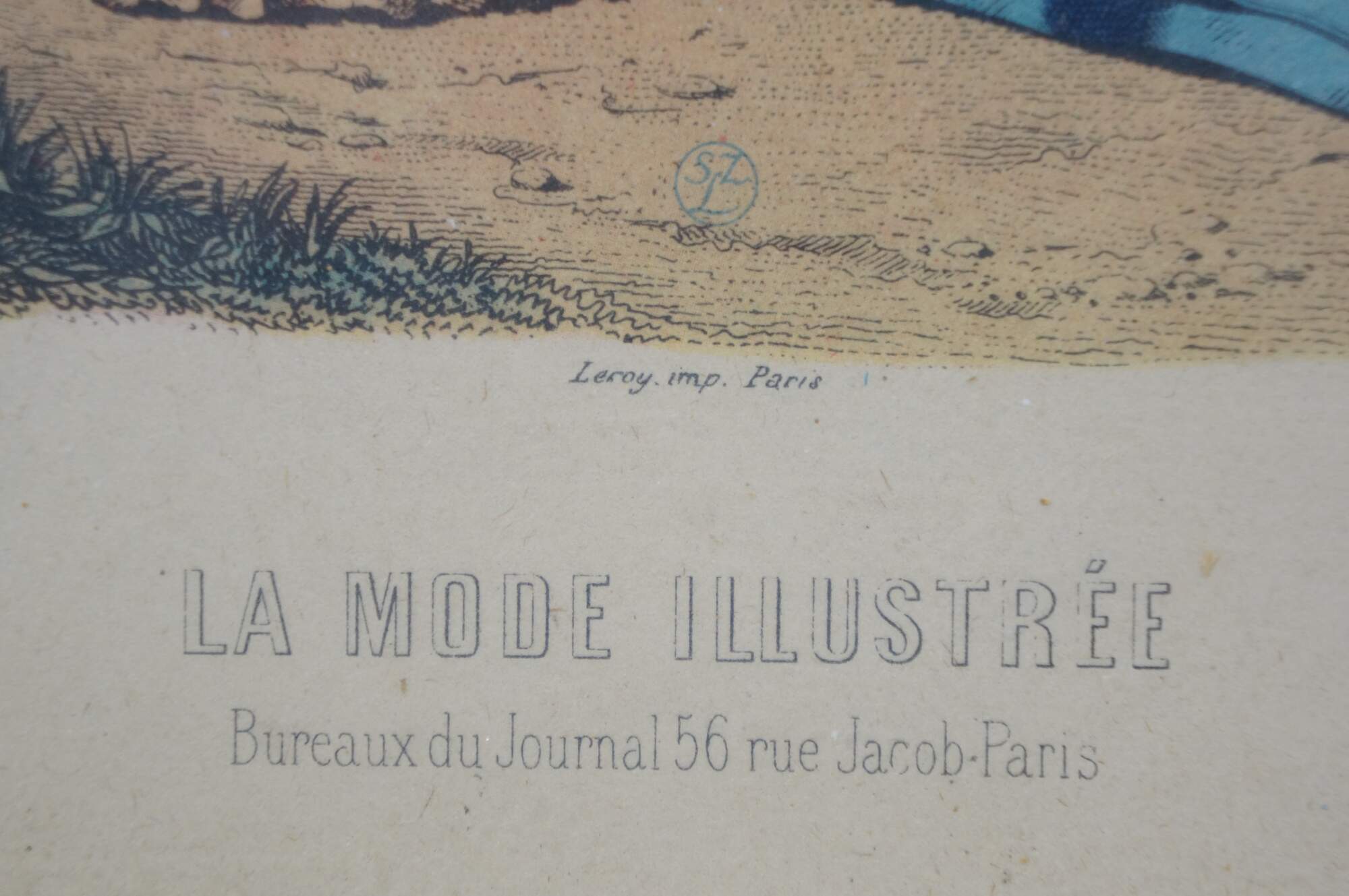 Pair of mid to late 19th century hand colored fashion etchings from Paris' La Mode Illustre magazine. Beveled wood frames.
