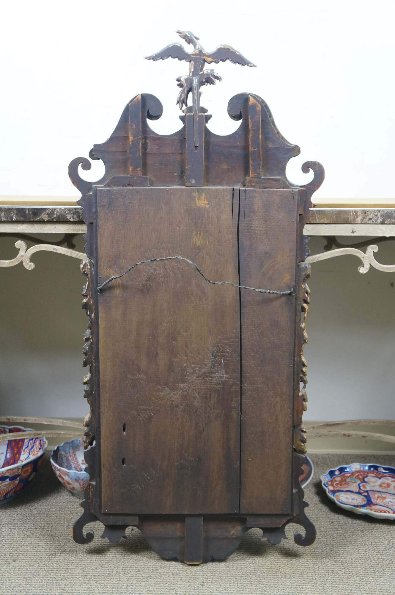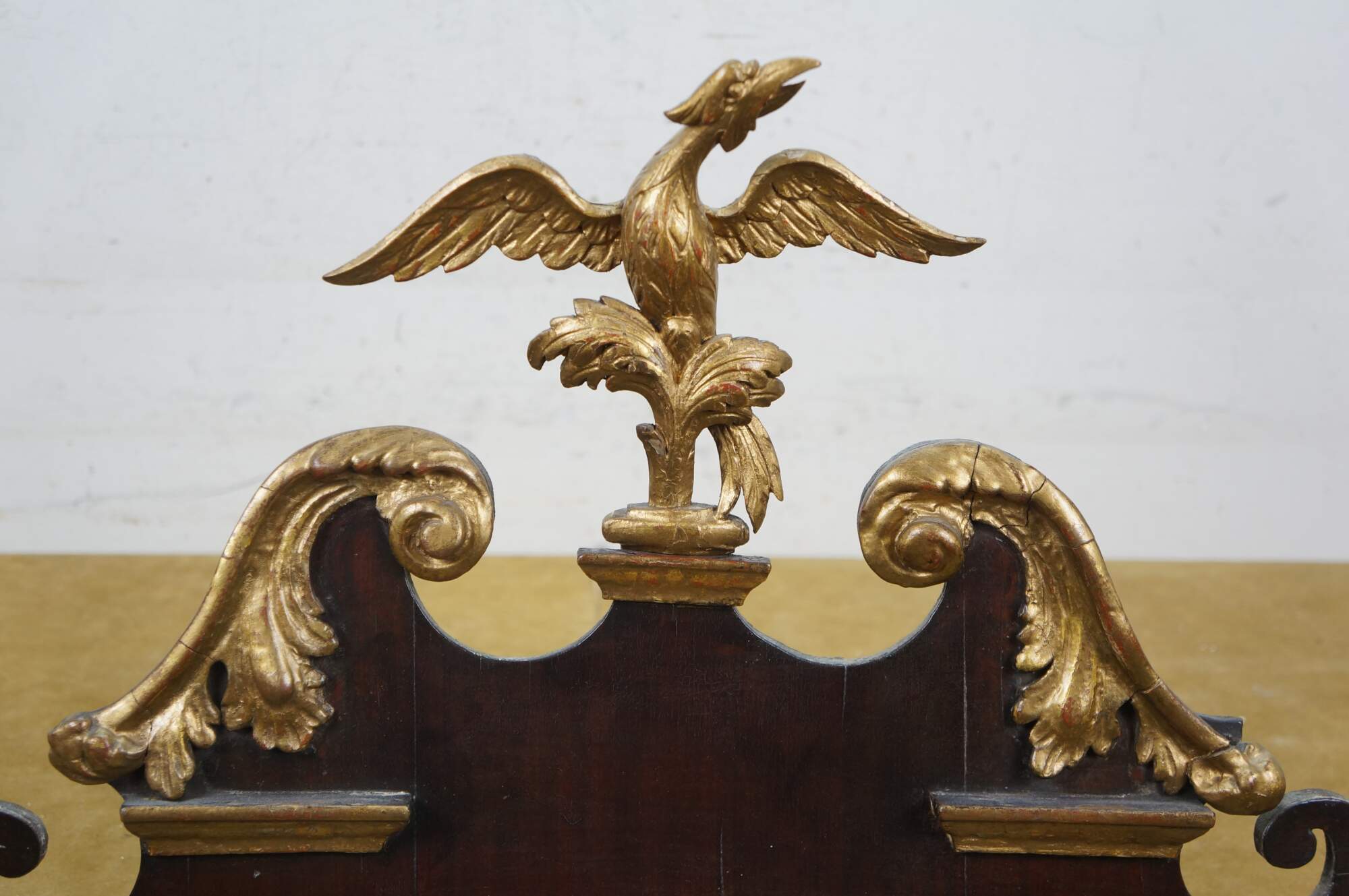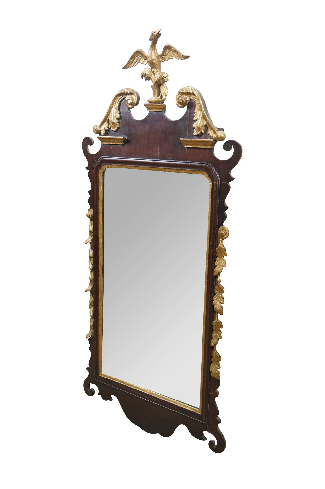 Antique Federal / Chippendale style wall / mantel / vanity / mirror. Rectangular form, framed in mahogany with scrolling fretwork at the top and bottom, gold gilt border around the mirror glass, lines of gilt leaves on each side edge, and topped with grand acanthus leaves and a majestic eagle / phoenix bird.