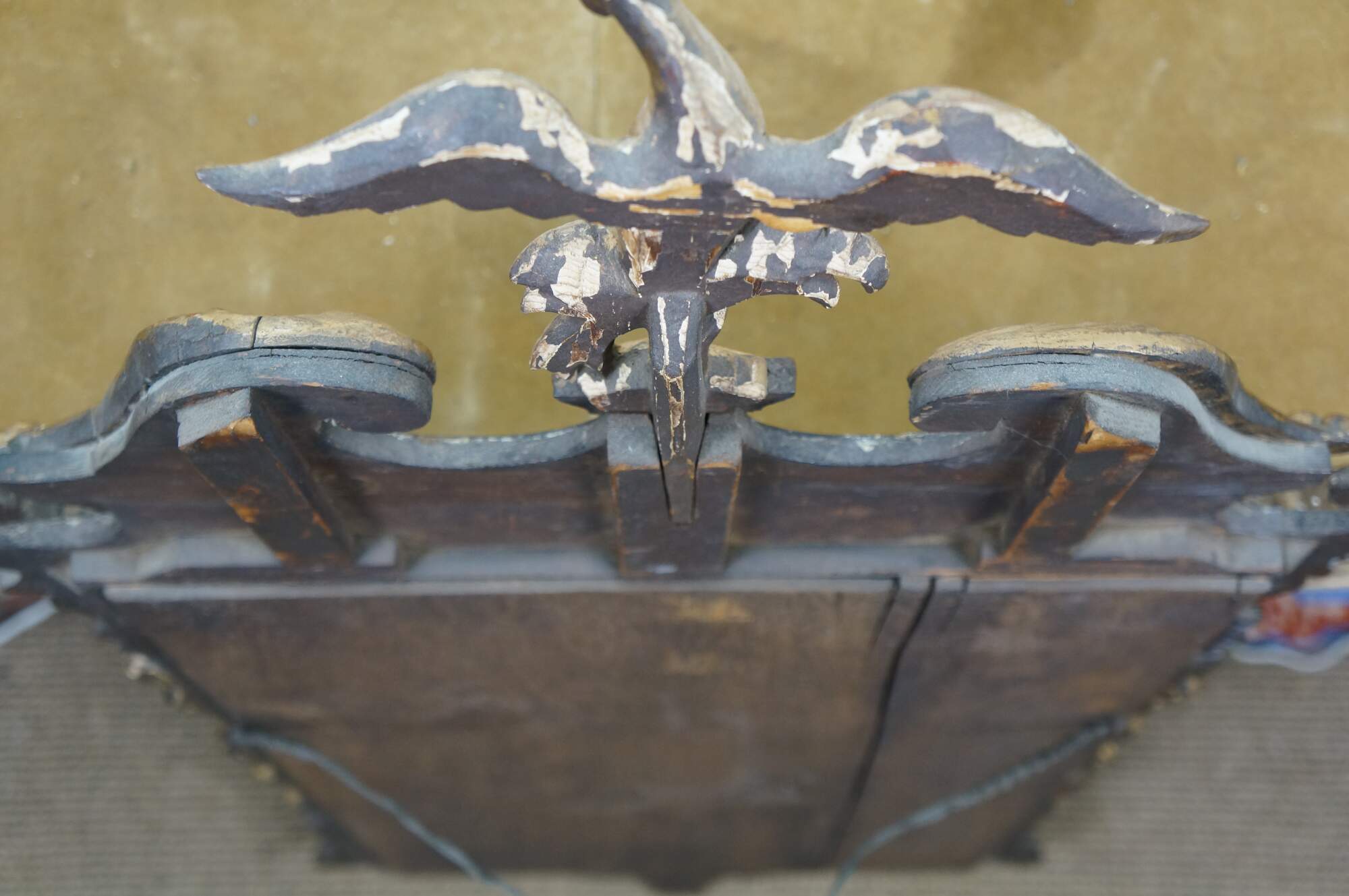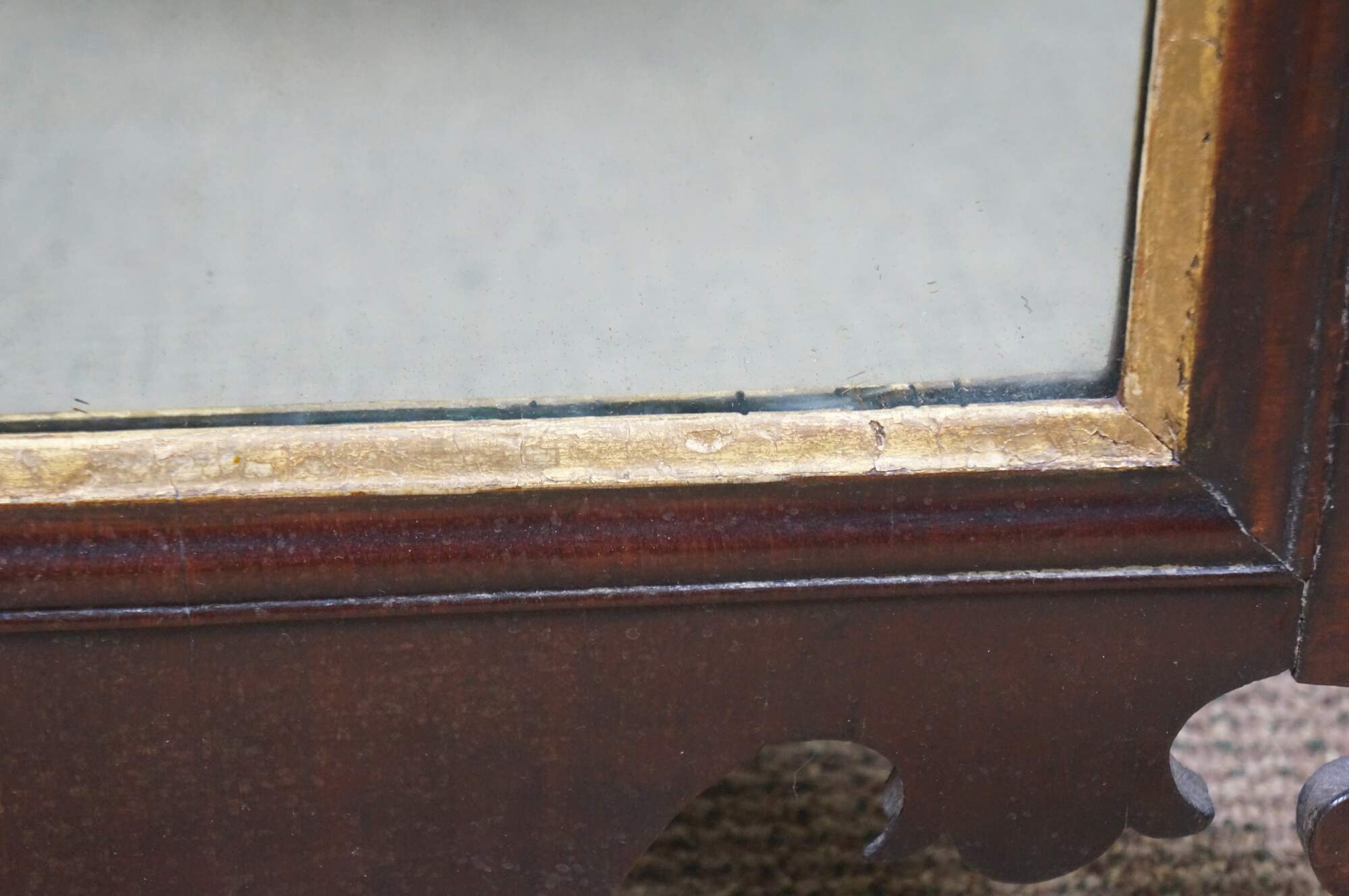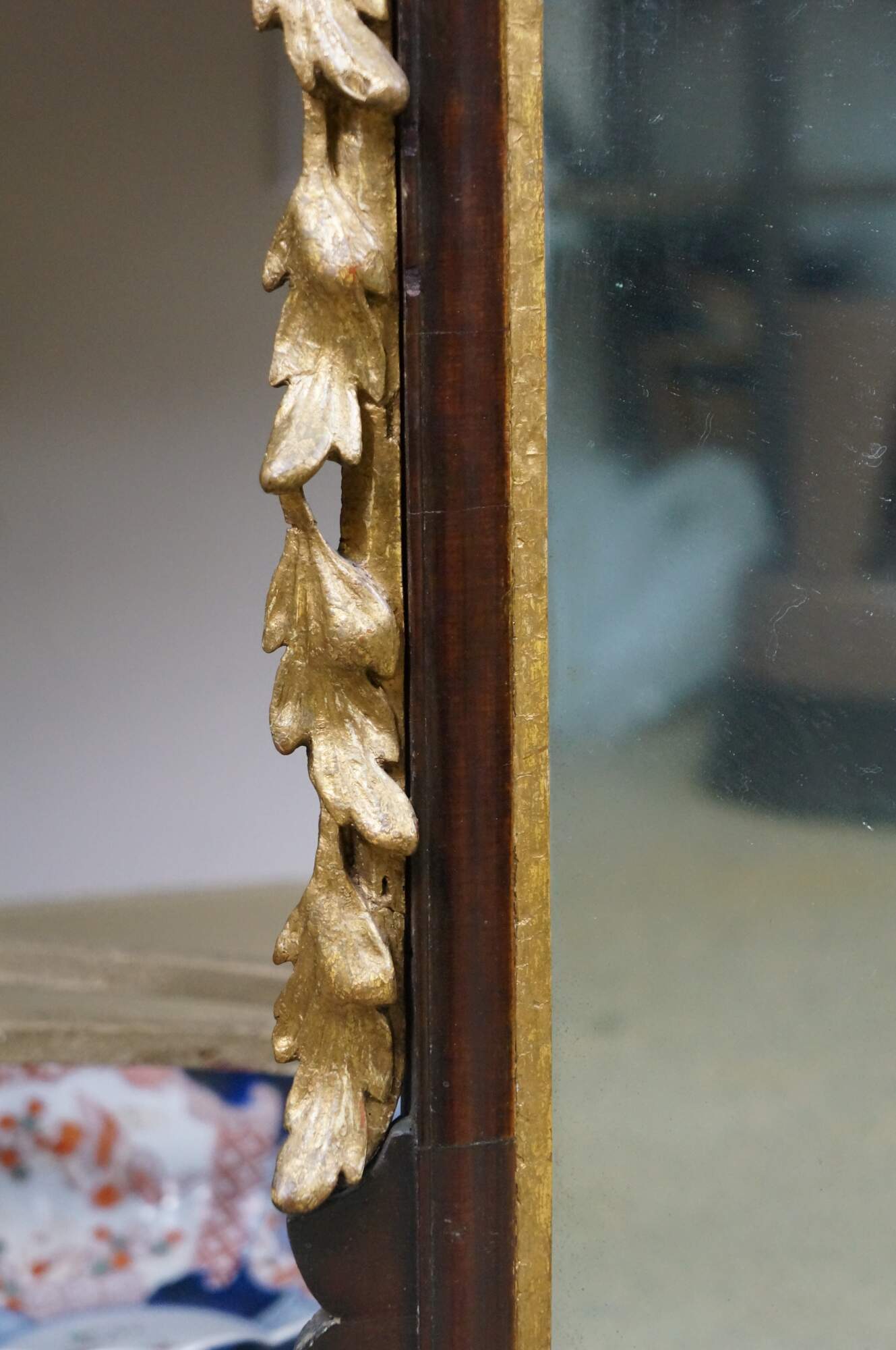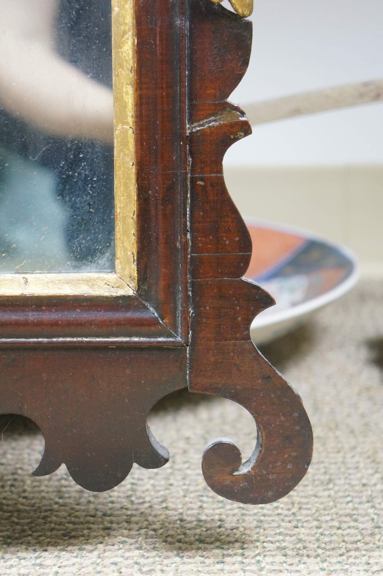 Antique Federal / Chippendale style wall / mantel / vanity / mirror. Rectangular form, framed in mahogany with scrolling fretwork at the top and bottom, gold gilt border around the mirror glass, lines of gilt leaves on each side edge, and topped with grand acanthus leaves and a majestic eagle / phoenix bird.