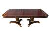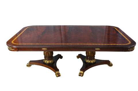 An exquisite English Regency / Neoclassical inspired dining or conference table by Millender Furniture. Features an extendable crotch mahogany cross-banded top with reeded edge over a fluted frieze with oval medallions and Neoclassical carvings along the corners. The table is supported by double pedestal bases. Each base has a graduated support with tulip carved designs over a tripod base with scrolled feet. Includes two large leaves for extension. Extends up to 136"