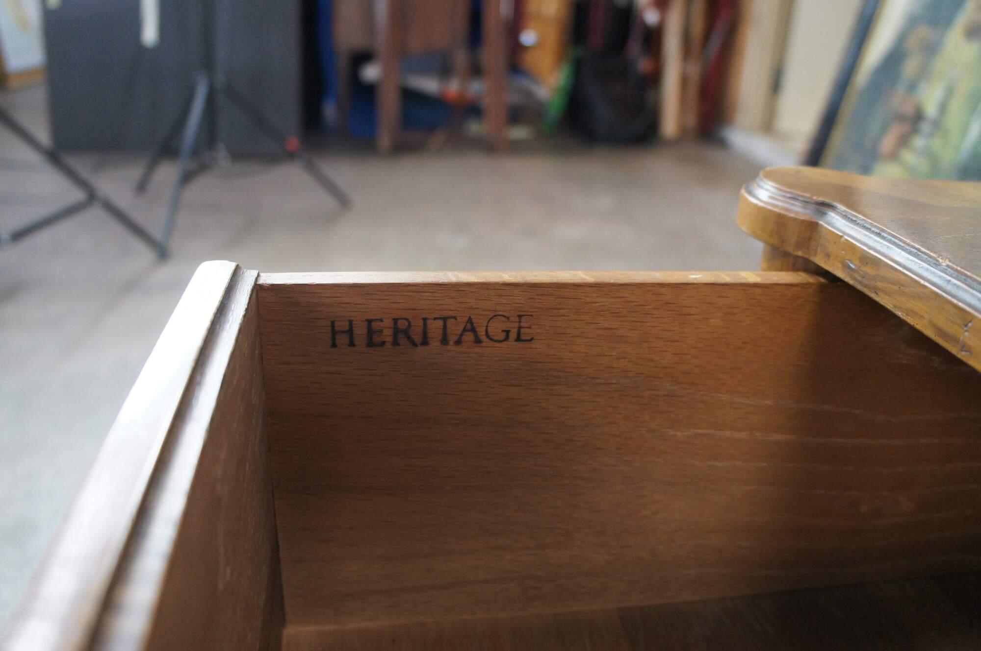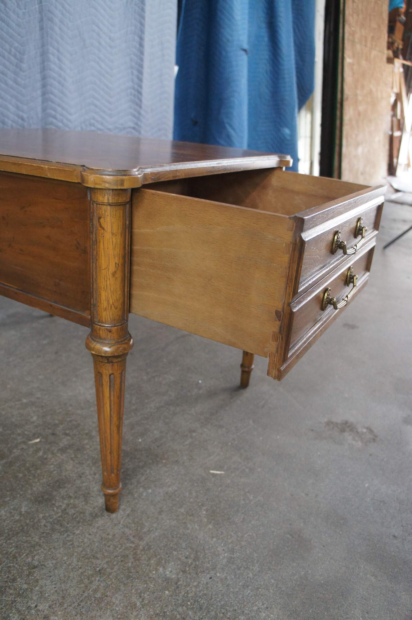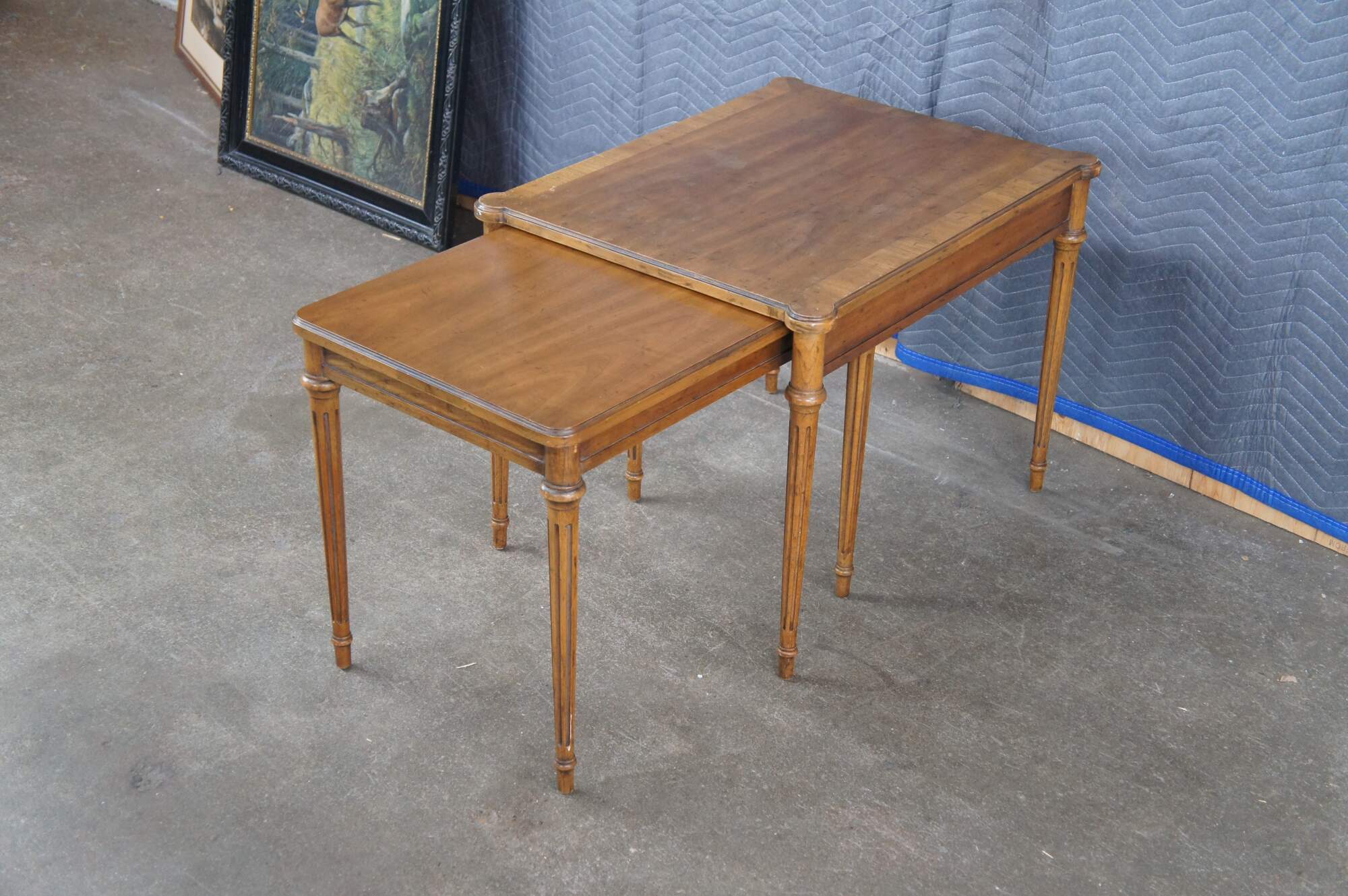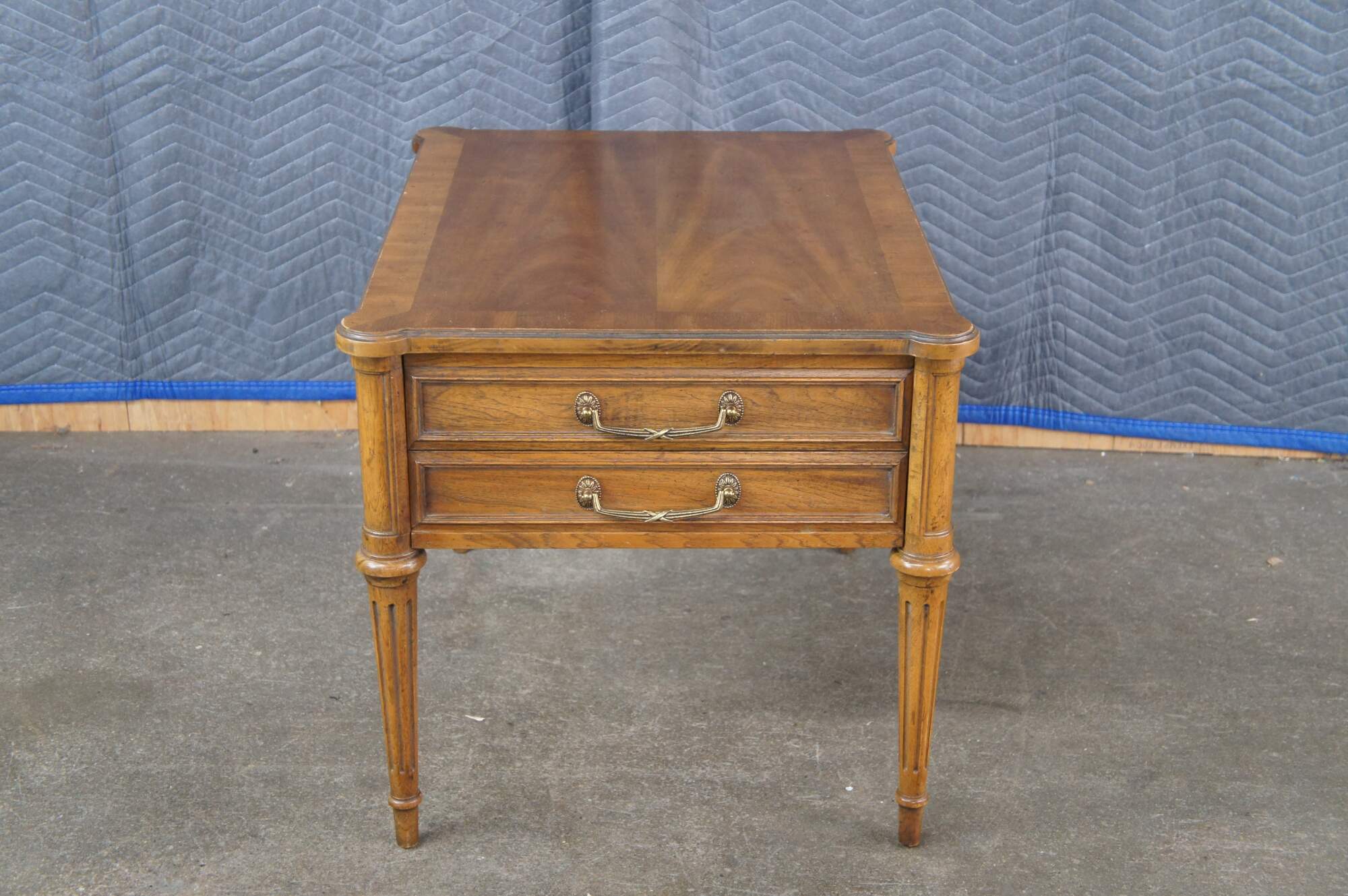 2 mid century French Provincial / Louis XVI style side tables by Drexel Heritage, circa 1968. Features a rectangular form made from walnut with matchbook crossbanded tops. One of the tables has a large dovetailed drawer with neoclassical brass hardware and the other is a nesting table. Each table is supported by turned, tapered and fluted legs with arrow feet. Great for use in a bedroom or living space. 395-205, 10-67, 395-500 4-67