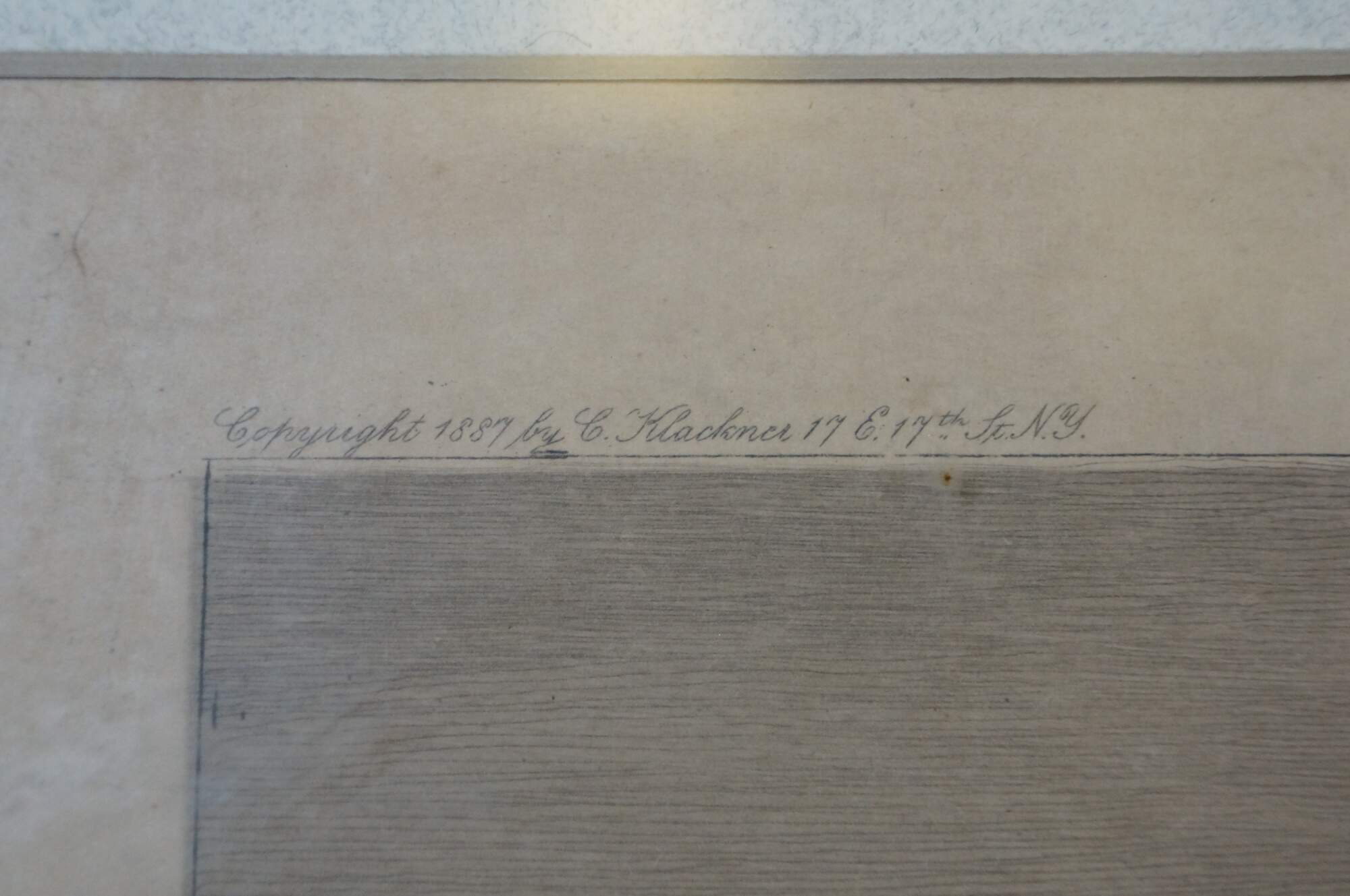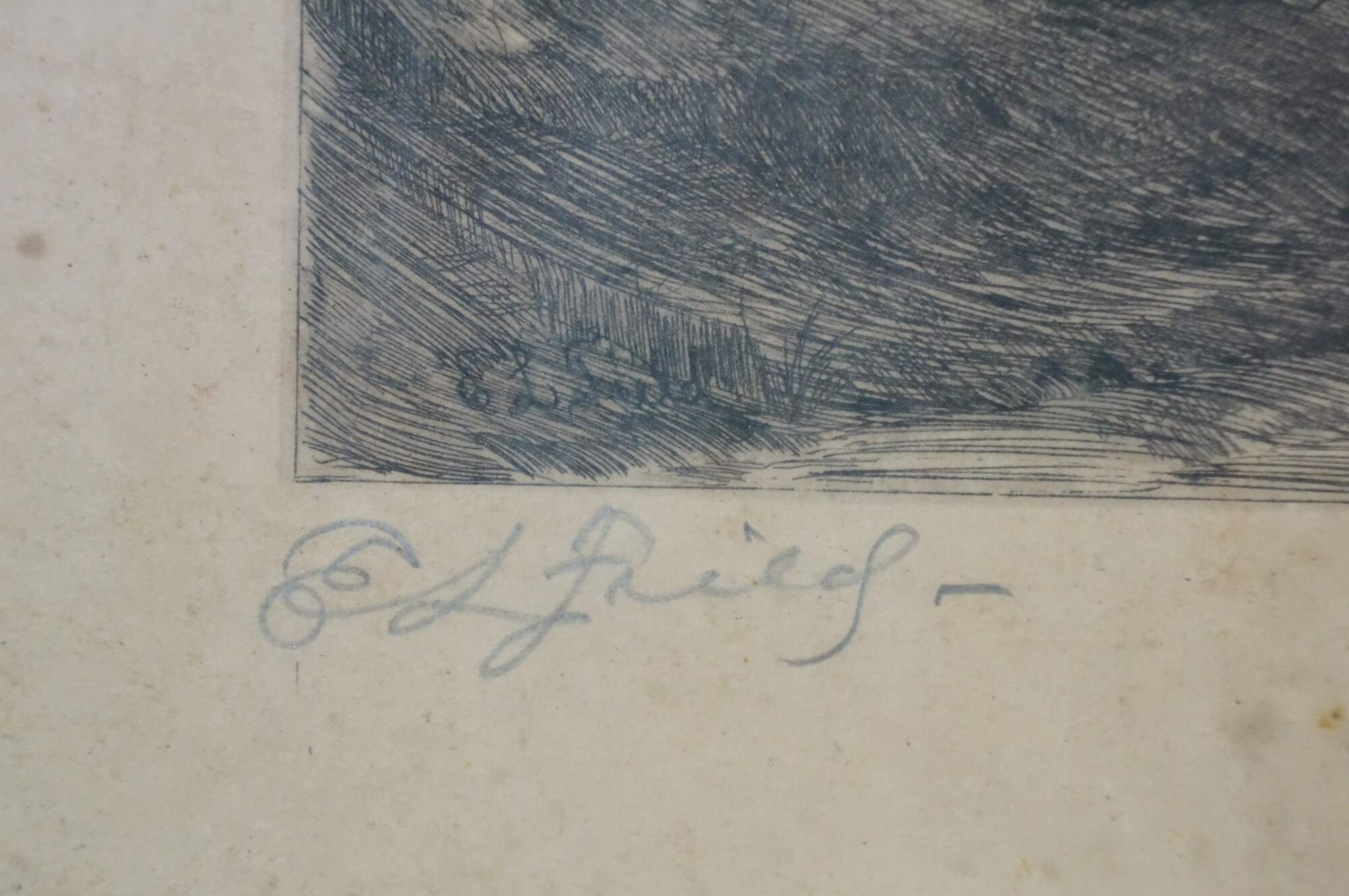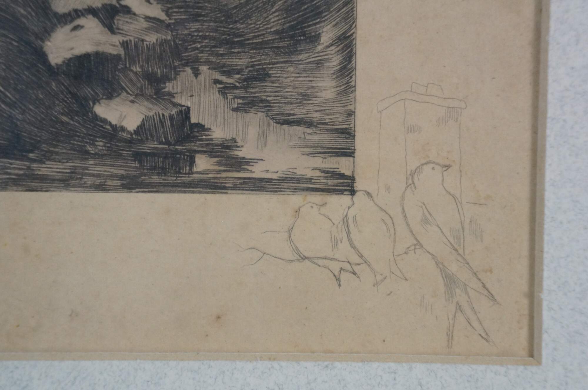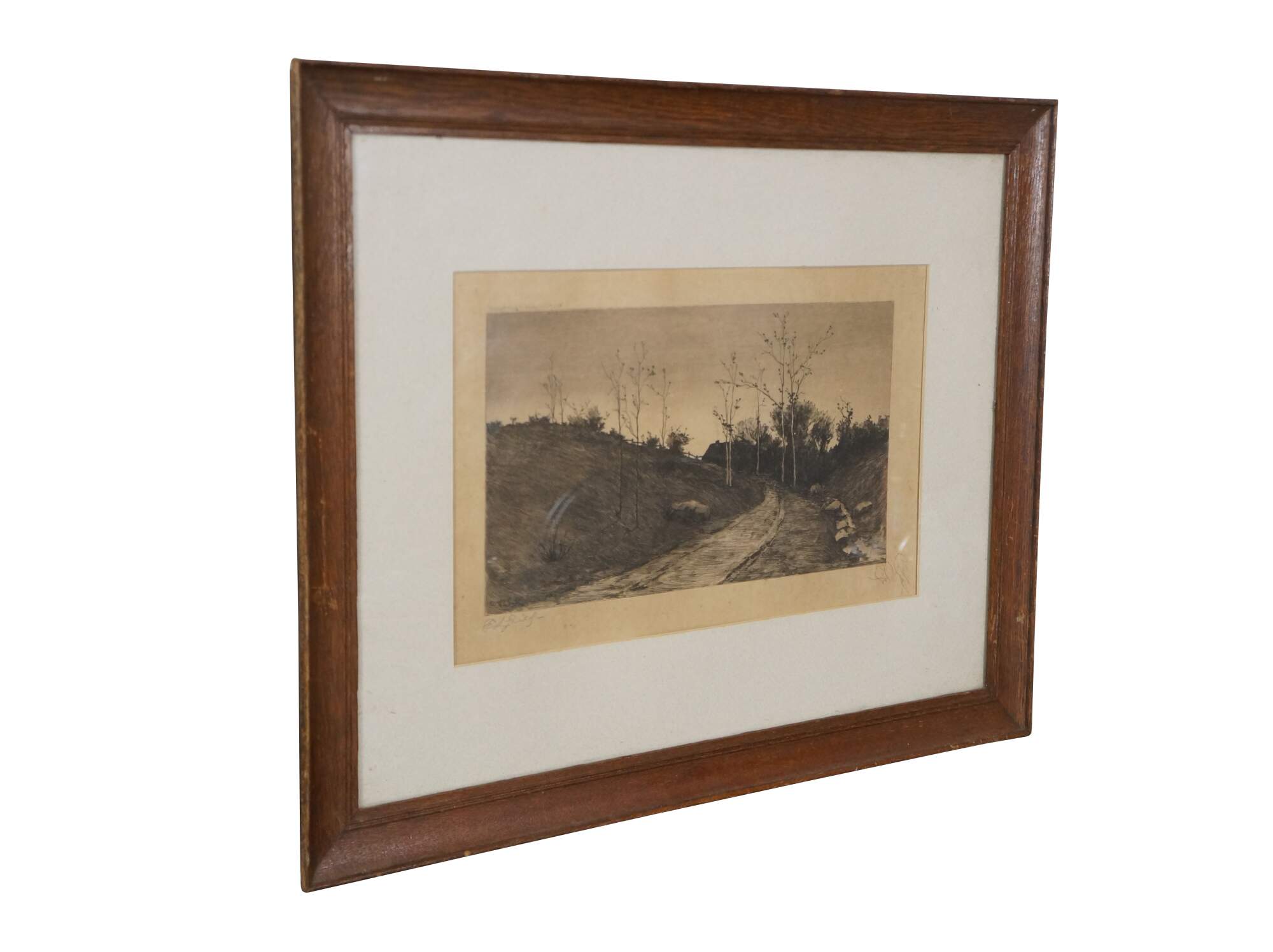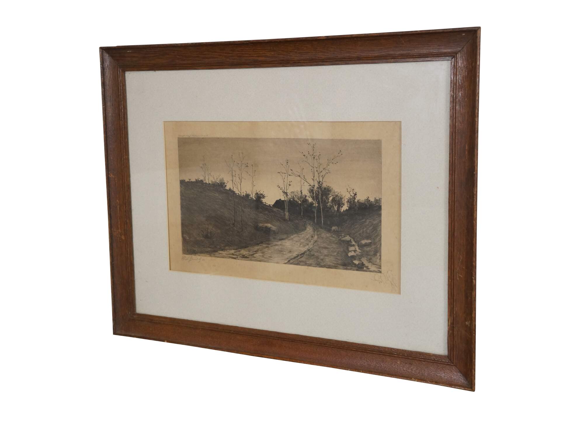 Late 19th century black and white etching by Edward Loyal Field. Landscape showing a country road curving around a hill. Signed in plate EL Field. Pencil signed, lower left. Remarked of birds on a chimney, lower right. Copyright 1887 by C. Klackner 17 E 17th St, NY. Beveled oak frame; white mat.