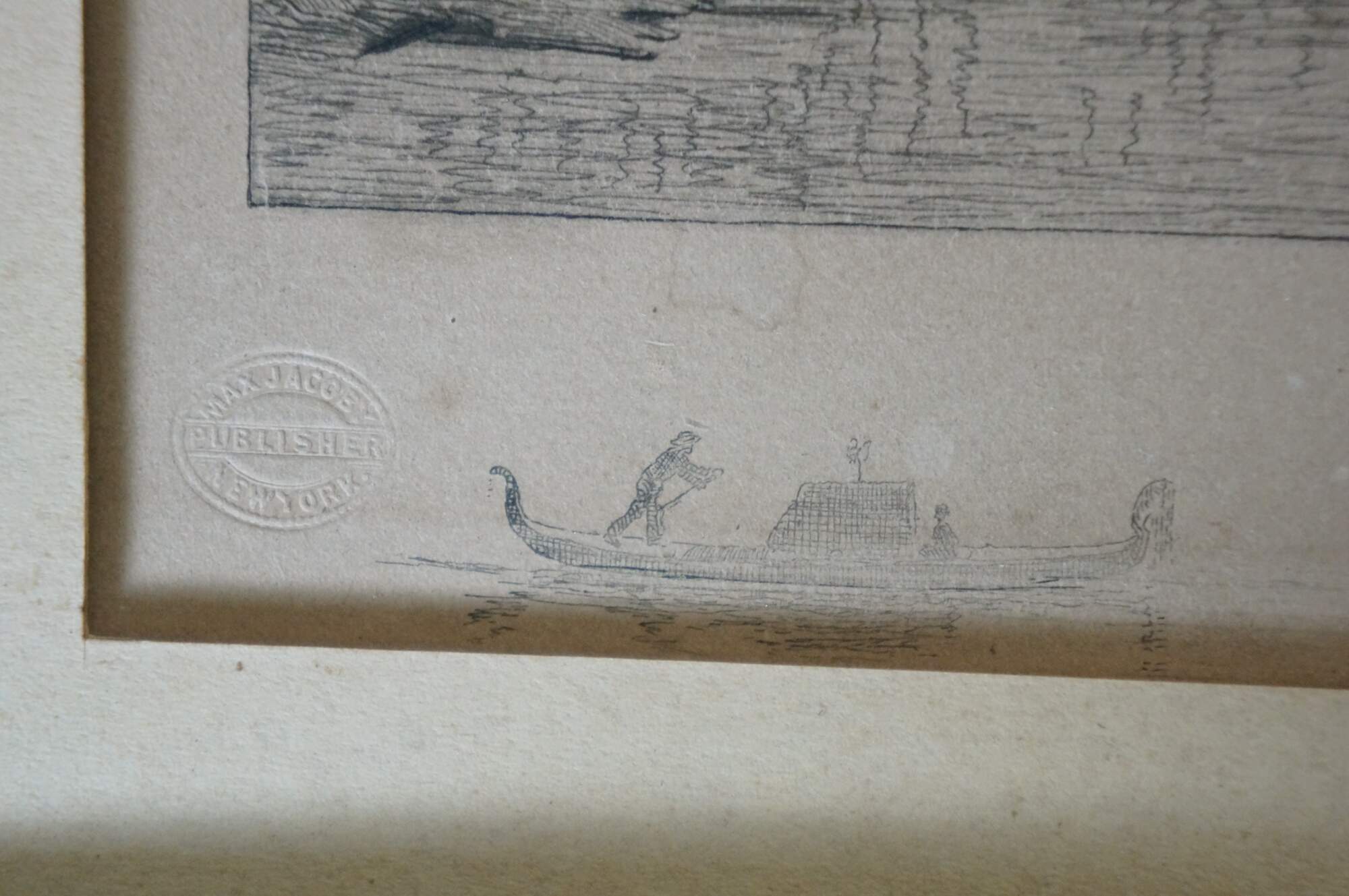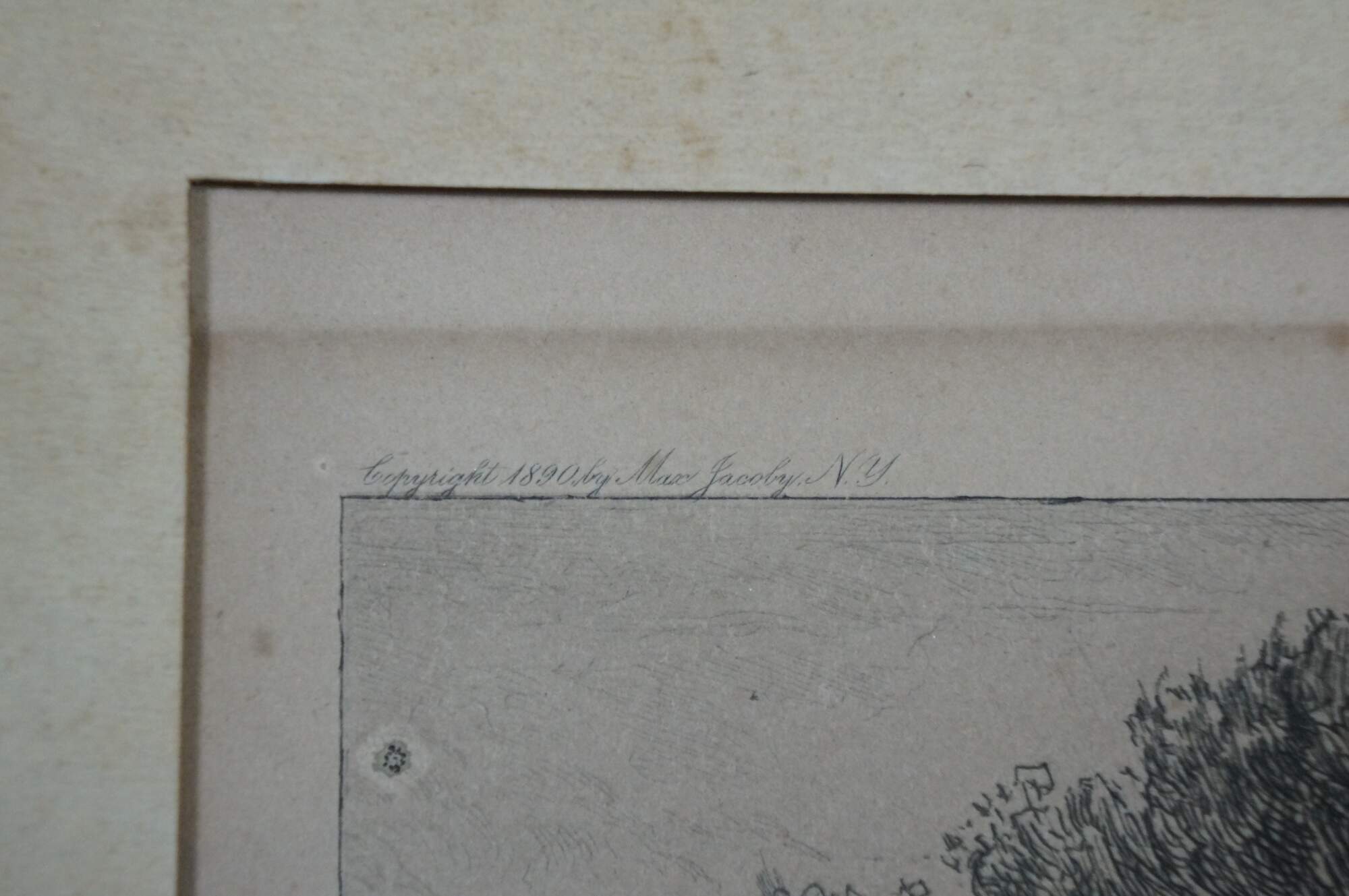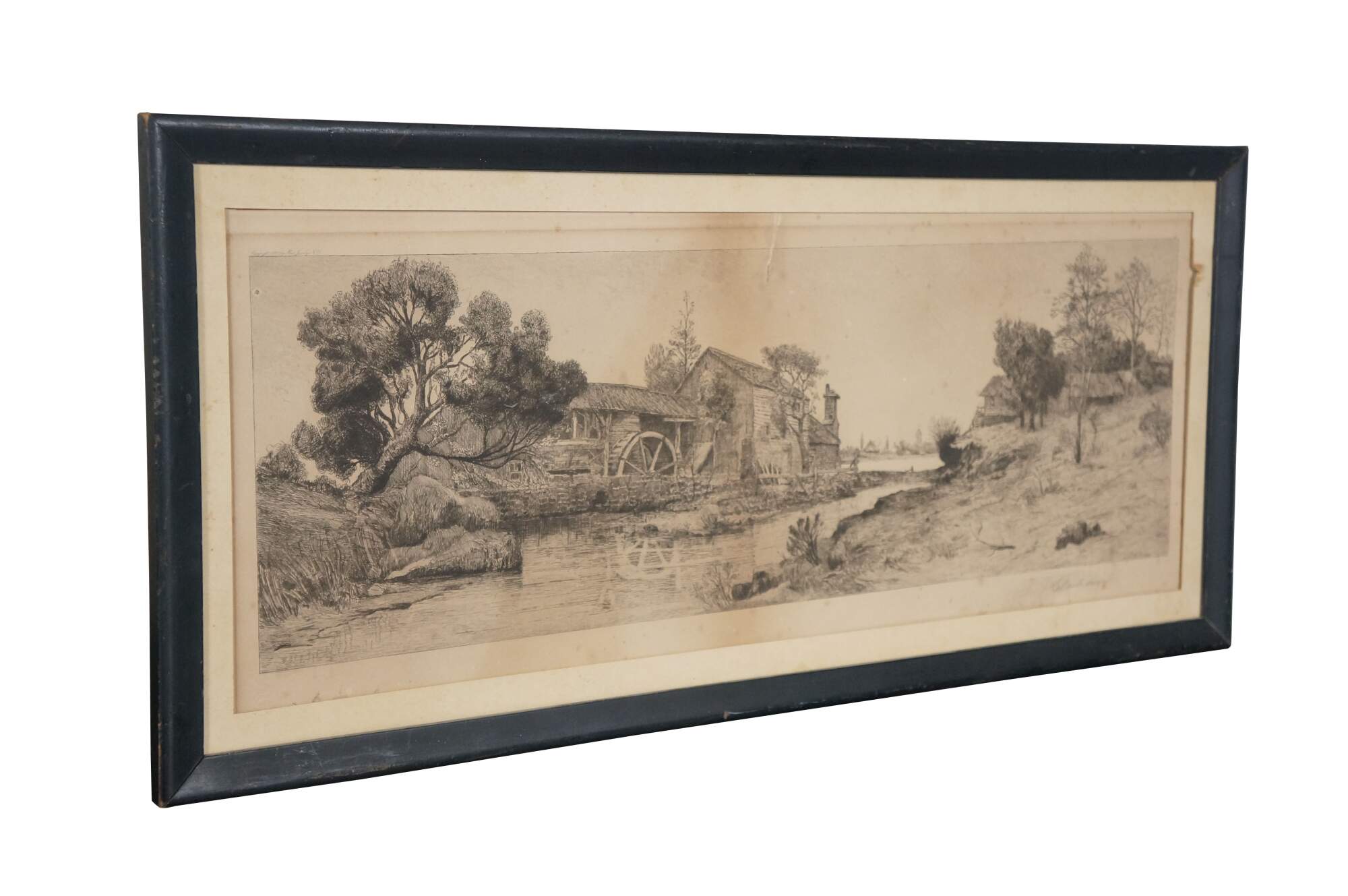 Late 19th century black and white etching by James J. Calahan. A wide country landscape showing a water mill at the edge of a river. Paper embossed "Max Jacoby Publisher New york, lower left. Remarke of figures in a boat, lower left. Pencil signed, lower right. Signed in plate JJ Calahan, lower right. Copyright 1890 by Max Jacoby, NY. Black painted wood frame.