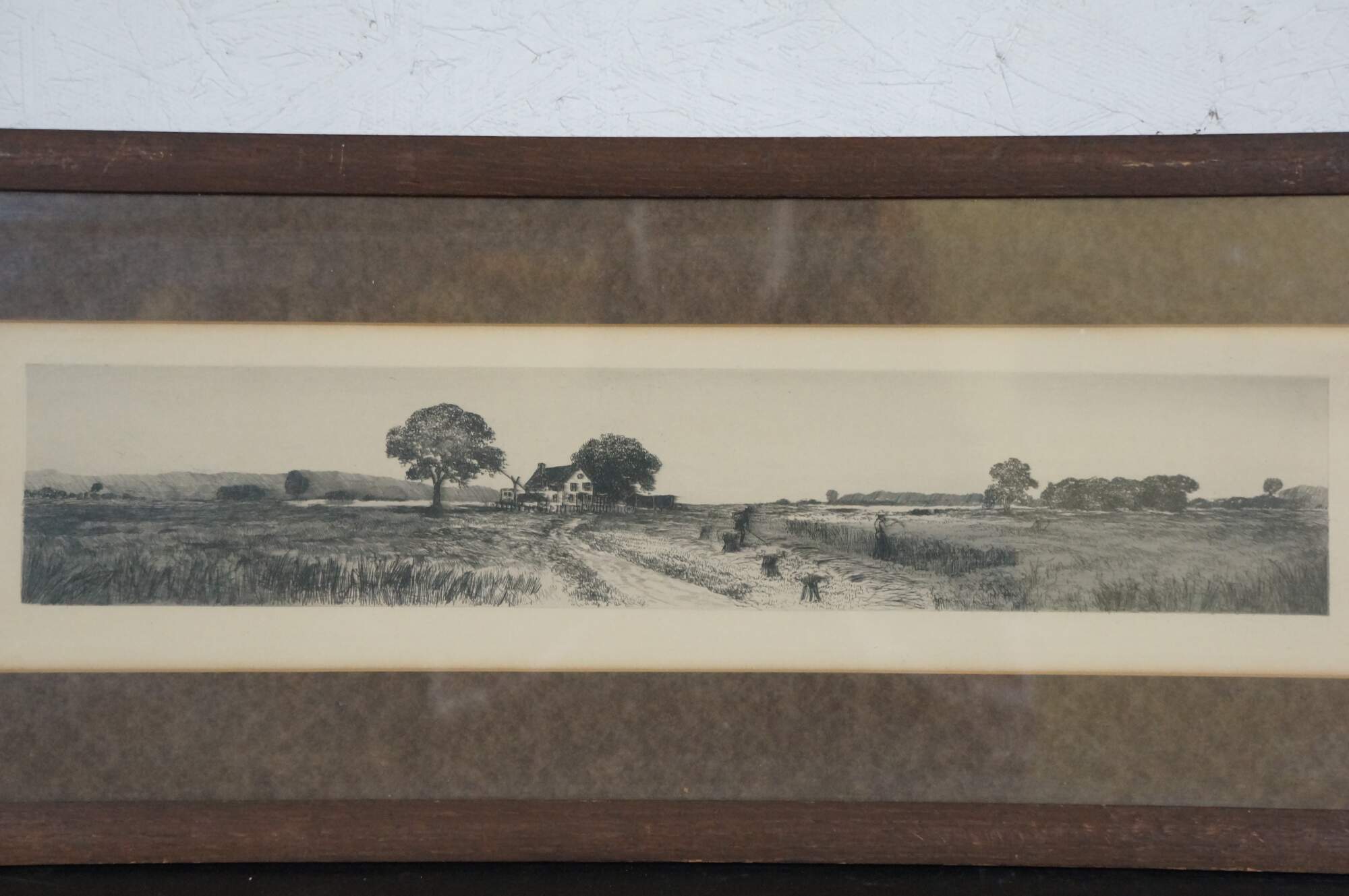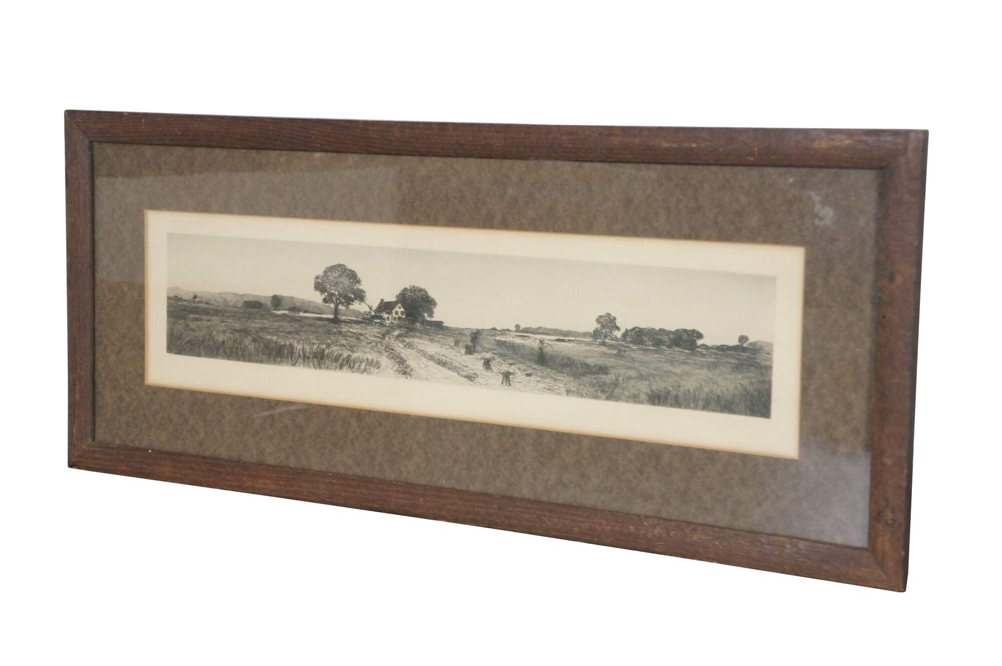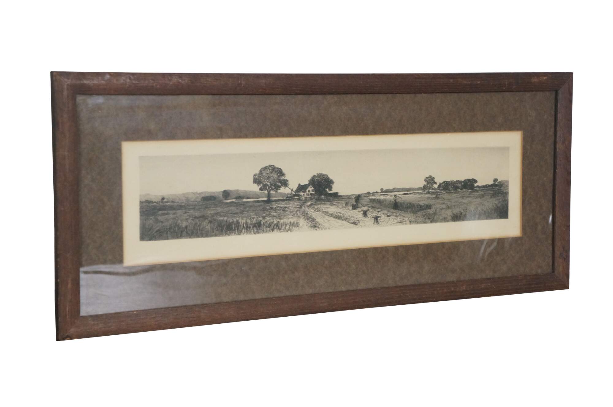 Late 19th century black and white landscape etching showing a panoramic view of figures harvest hay with scythes, with a farmhouse in the background. Plain wood frame; brown mat.