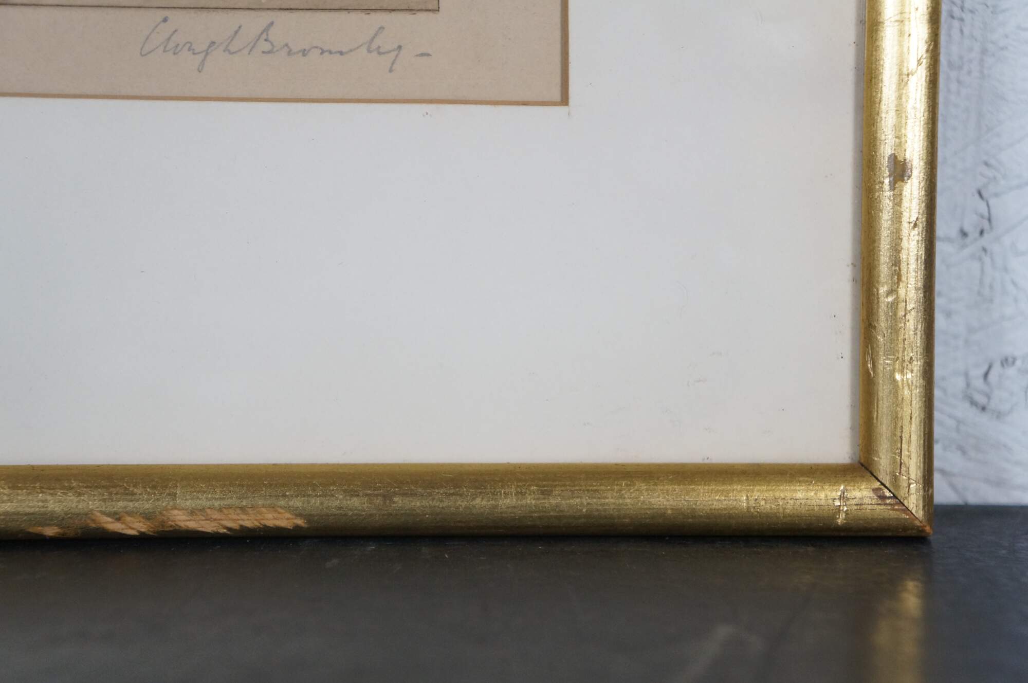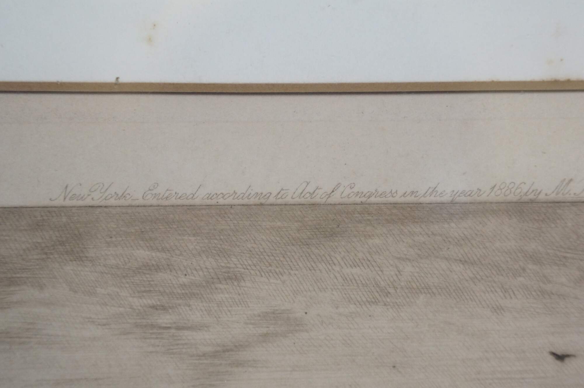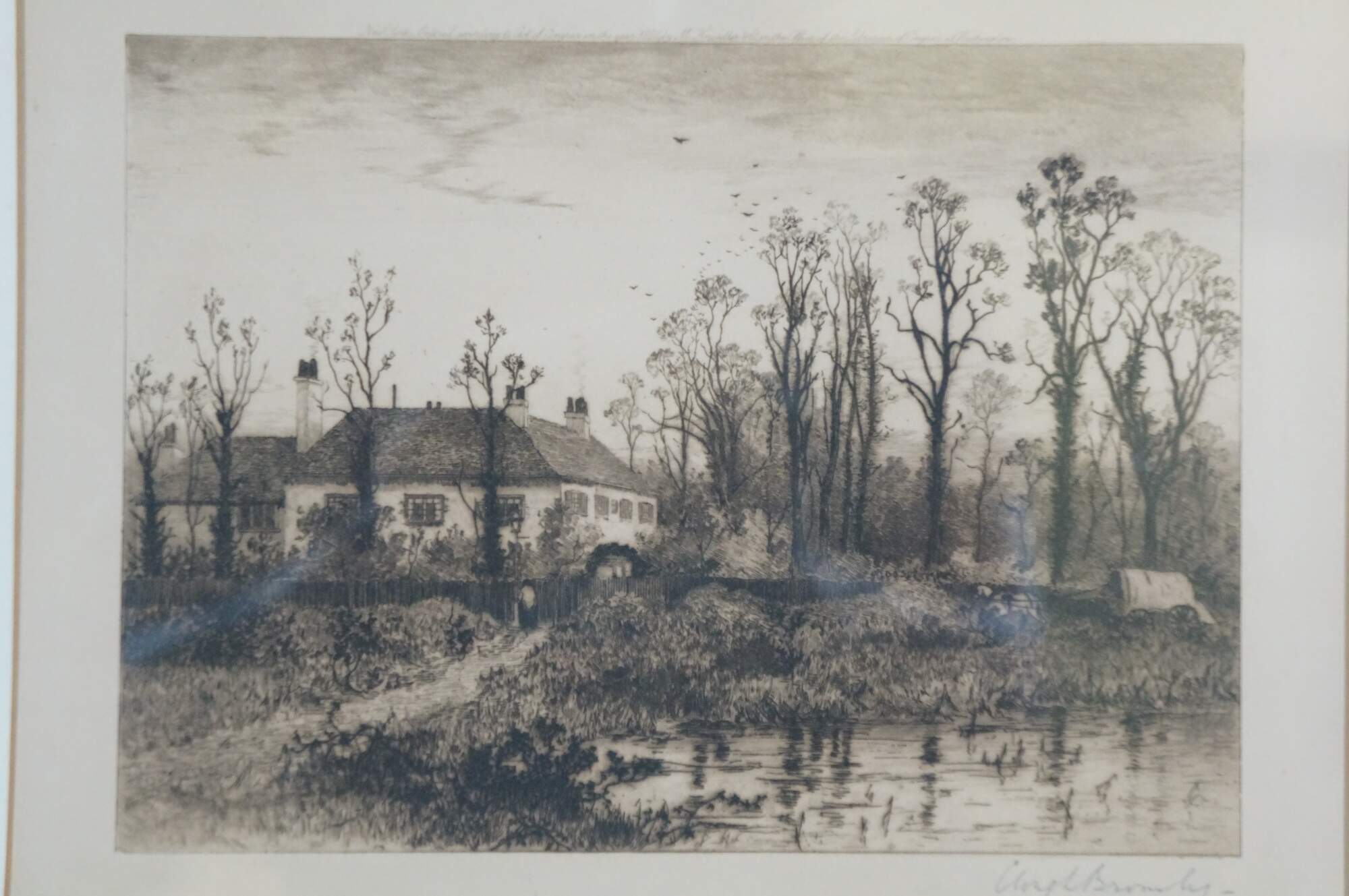 Late 19th century black and white etching titled "The Old Manor House" by Clough Bromley (United Kingdom; active circa 1872-1904). Forested landscape showing a covered wagon drawing up to a large country house. Pencil signed, lower right. New York - Entered according to Act of Congress in the Year 1886 by M. Knoedler H in the Office of the Librarian of Congress at Washington. Giltwood frame; white mat.