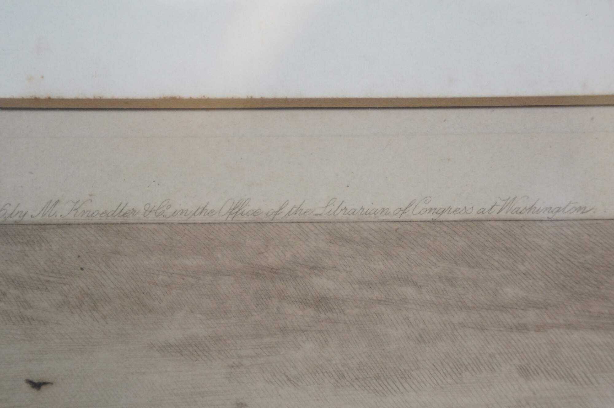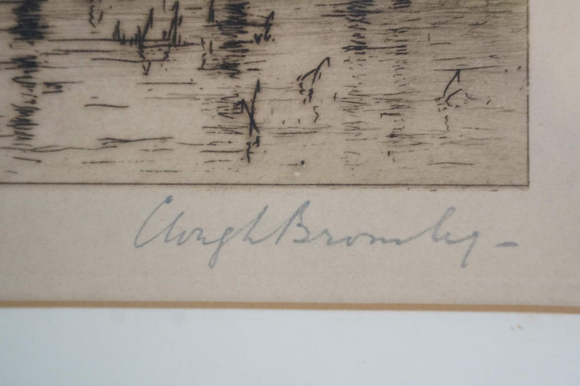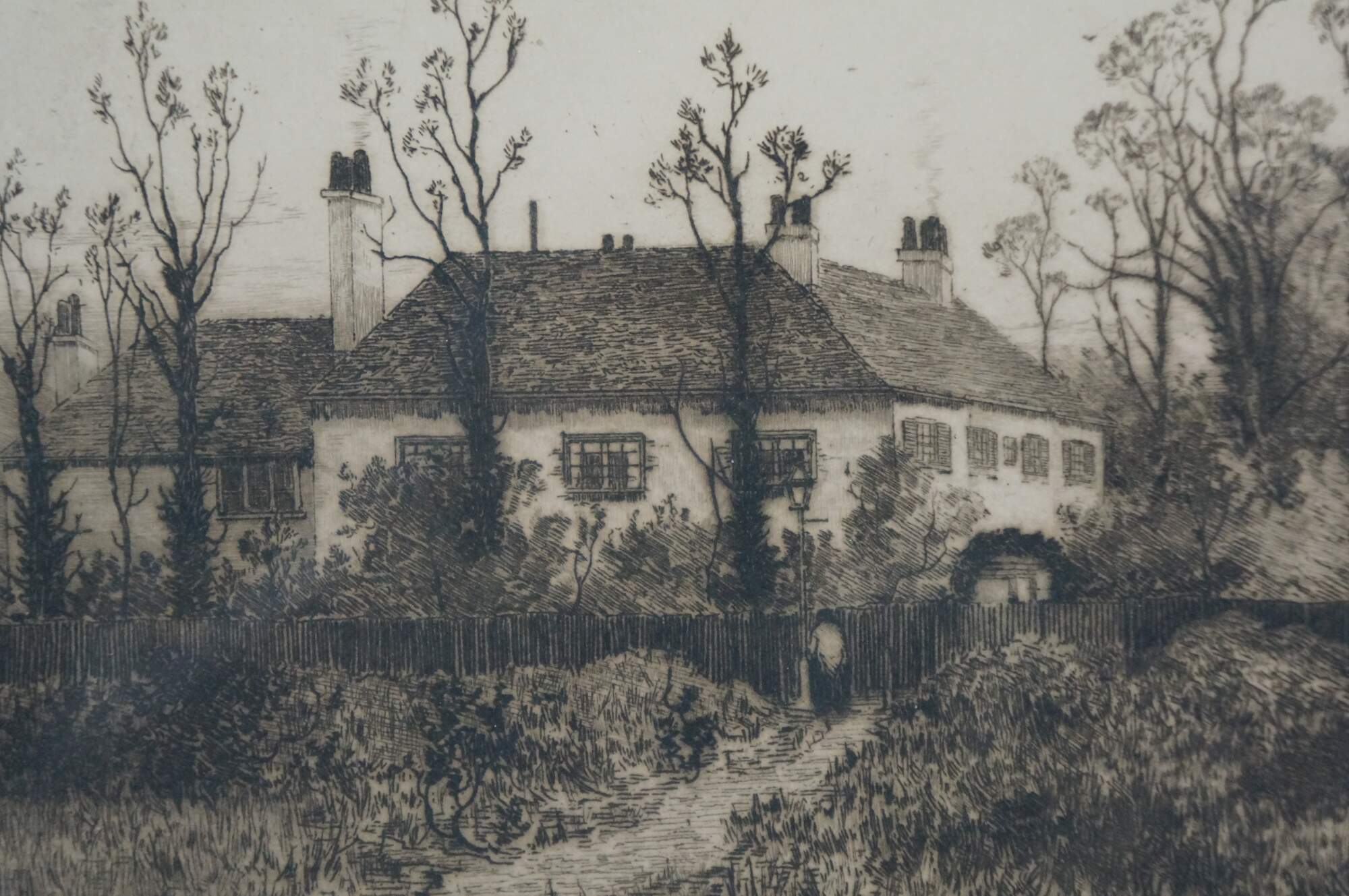 Late 19th century black and white etching titled "The Old Manor House" by Clough Bromley (United Kingdom; active circa 1872-1904). Forested landscape showing a covered wagon drawing up to a large country house. Pencil signed, lower right. New York - Entered according to Act of Congress in the Year 1886 by M. Knoedler H in the Office of the Librarian of Congress at Washington. Giltwood frame; white mat.