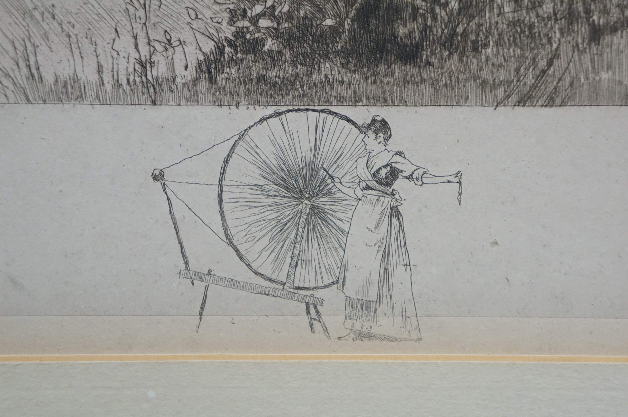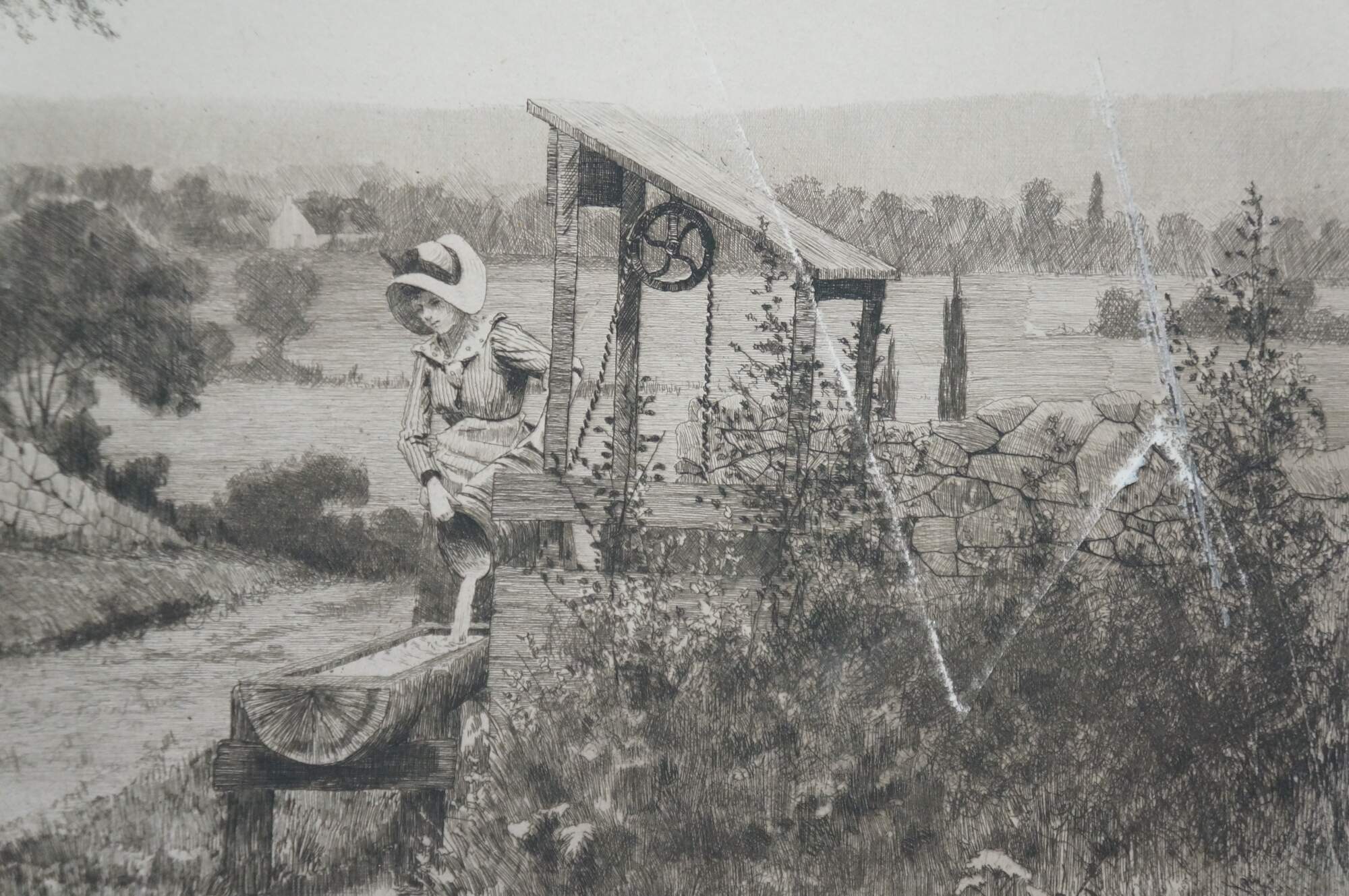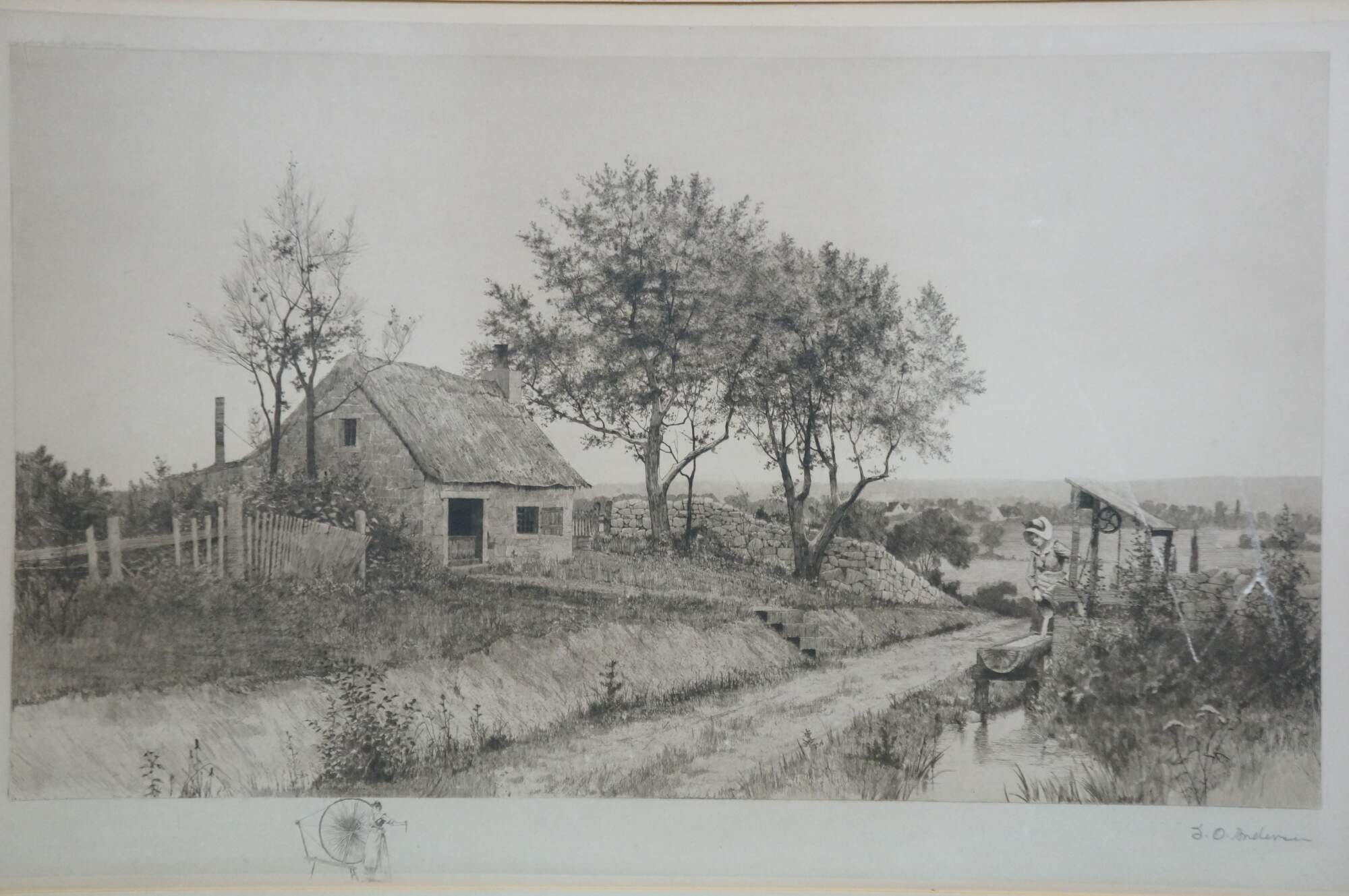Late 19th century black and white etching titled Dear, Sweet, Spot-Home by John Octavius Anderson. Country landscape showing a female figure drawing water from a well and into a horse trough, near a small farmhouse. Remarke of a woman at a spinning wheel, lower edge. Pencil signed, lower right. Copyrighted by Radtke, Lauckner & Co, NY, 1891. Beveled giltwood frame; white mat.