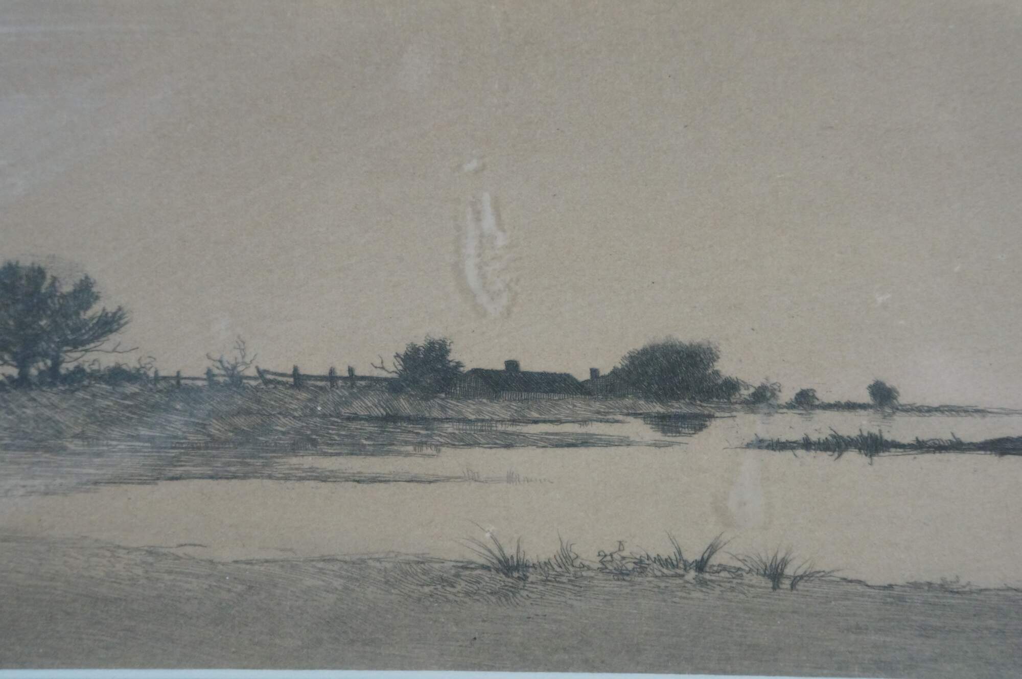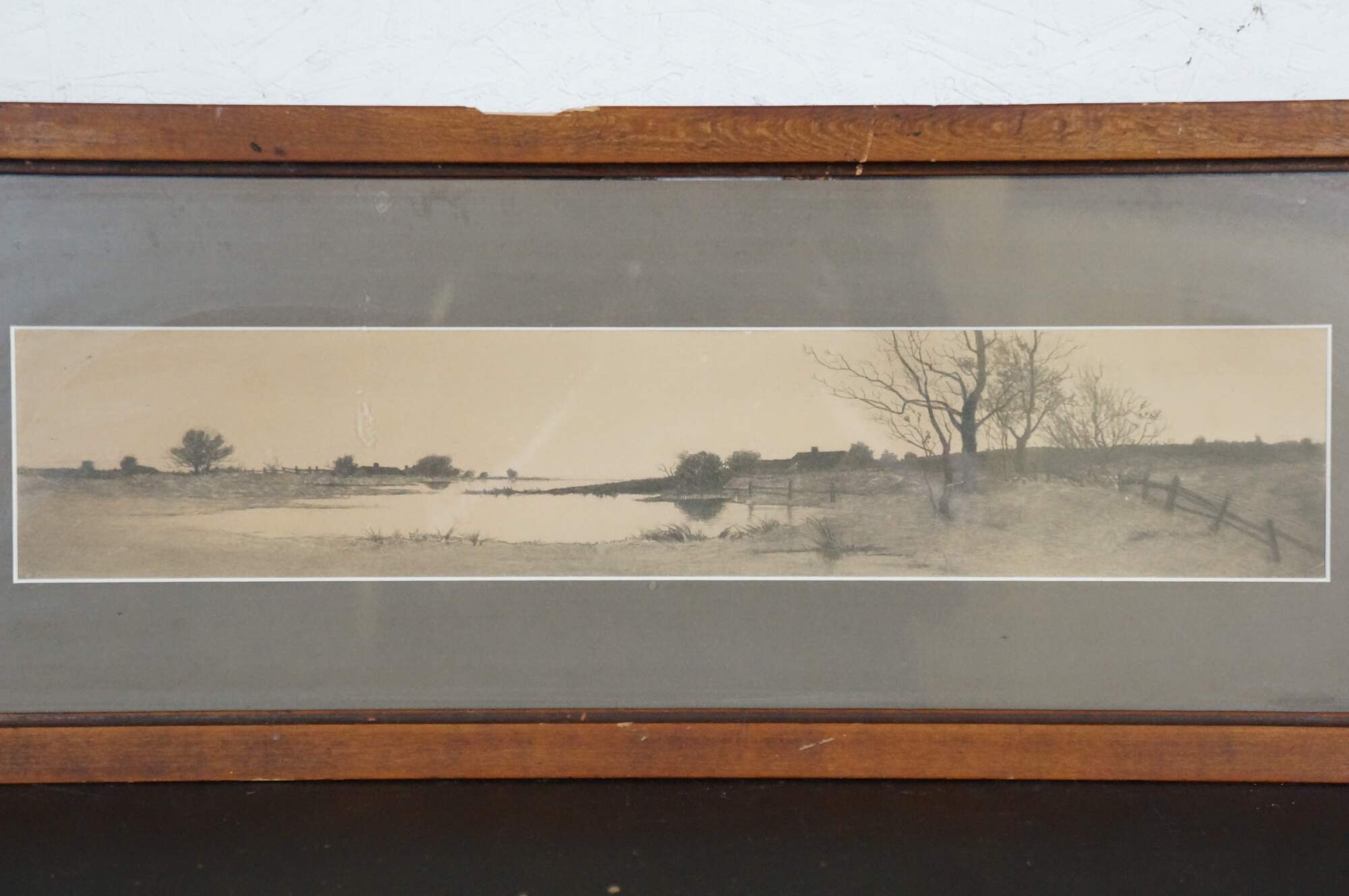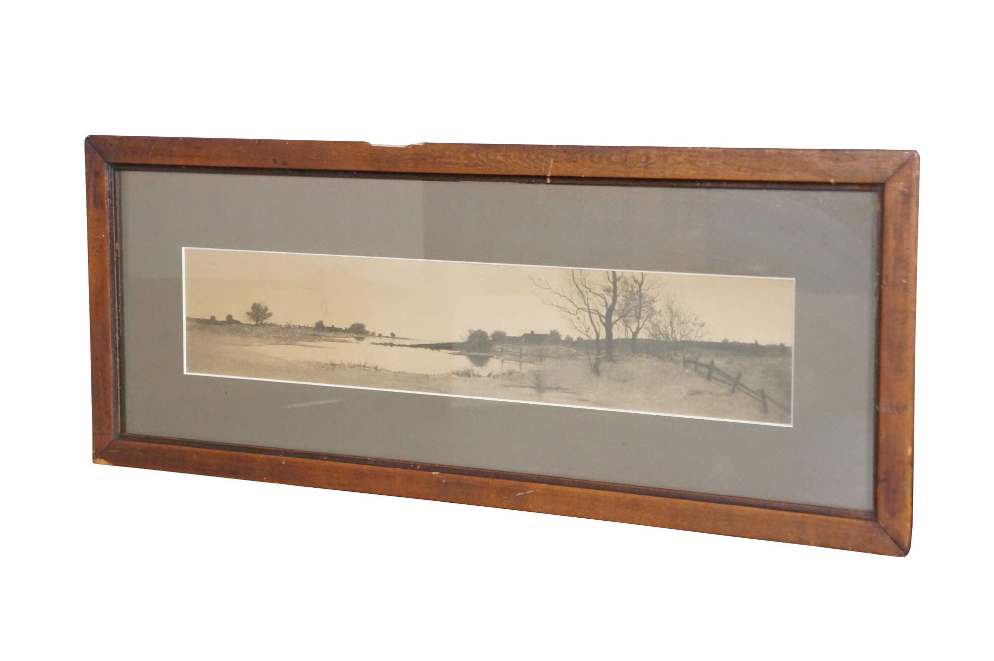 Late 19th century black and white etching. A panoramic country landscape with a large pond, rail fence, and distant farmhouse. Some information concealed by mat: Upper right, Copyrighted by Radtke, Lauckner & Co, New York, 1890. Attributed to J.N. Allen. Signed lower right in pencil. Plain wood frame; gray mat.