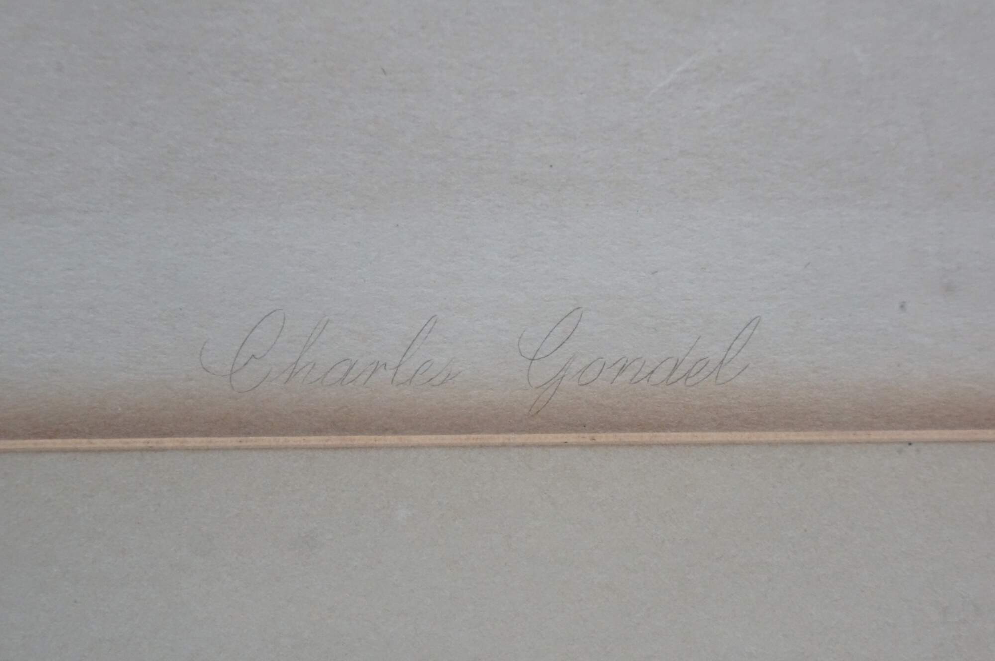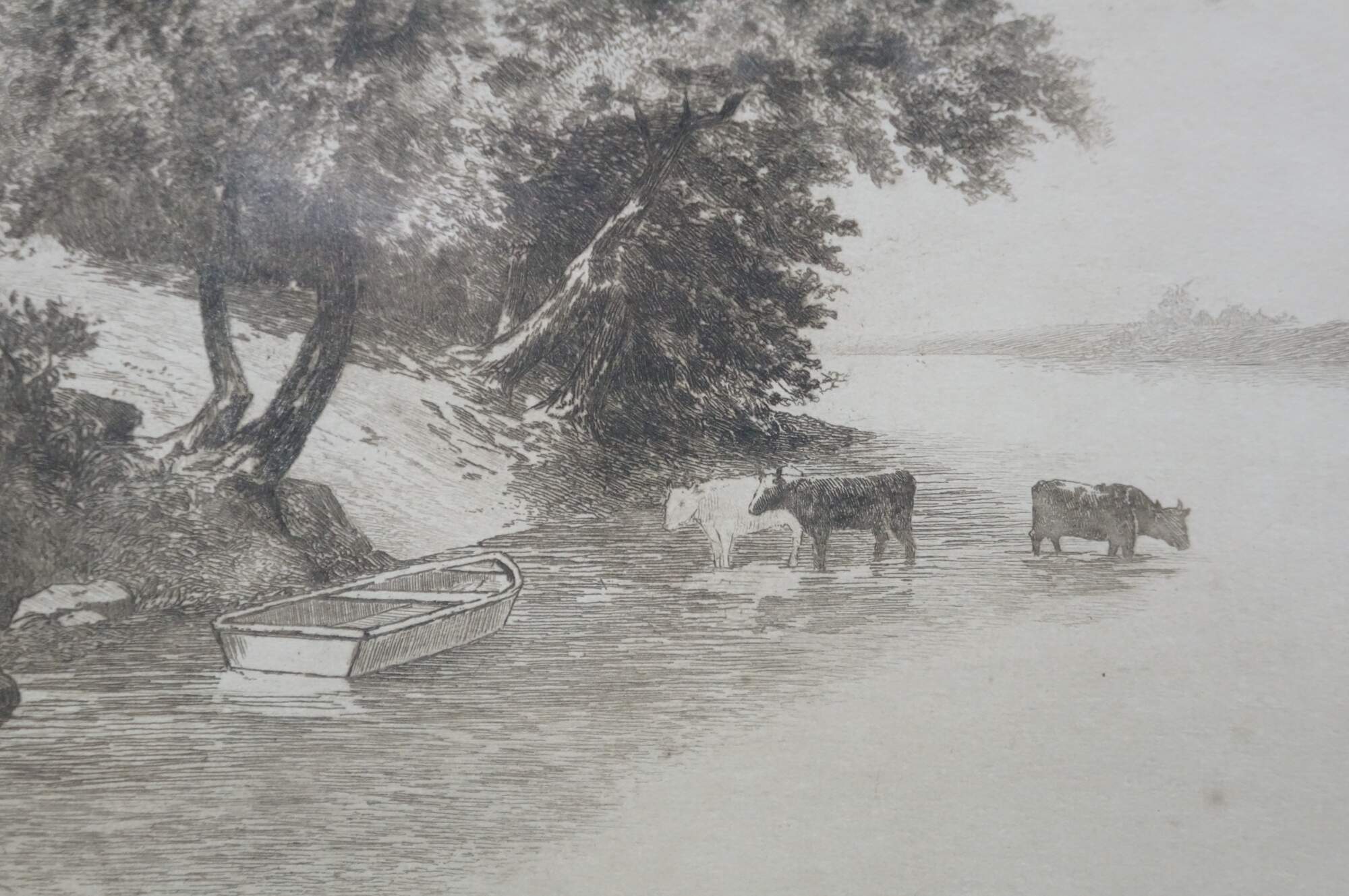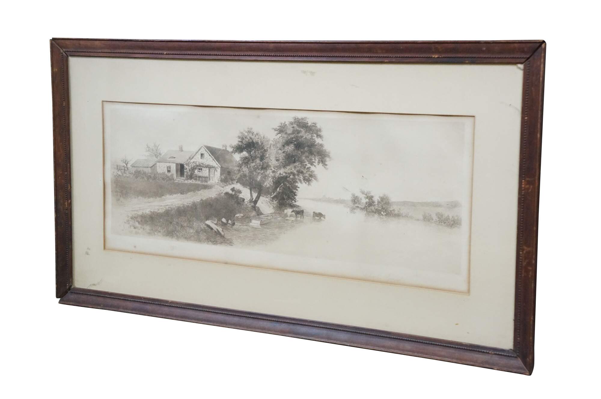 Late 19th century black and white etching by Charles Gondel. Country landscape showing a stone farmhouse and a group of cows in a river. Remarke landscape, lower edge. "Charles Gondel" printed, lower edge. Copyrighted 1895 by BT Babbitt. Beveled wood frame with beaded detail; white mat.