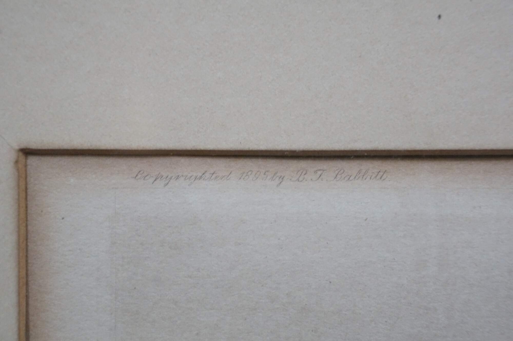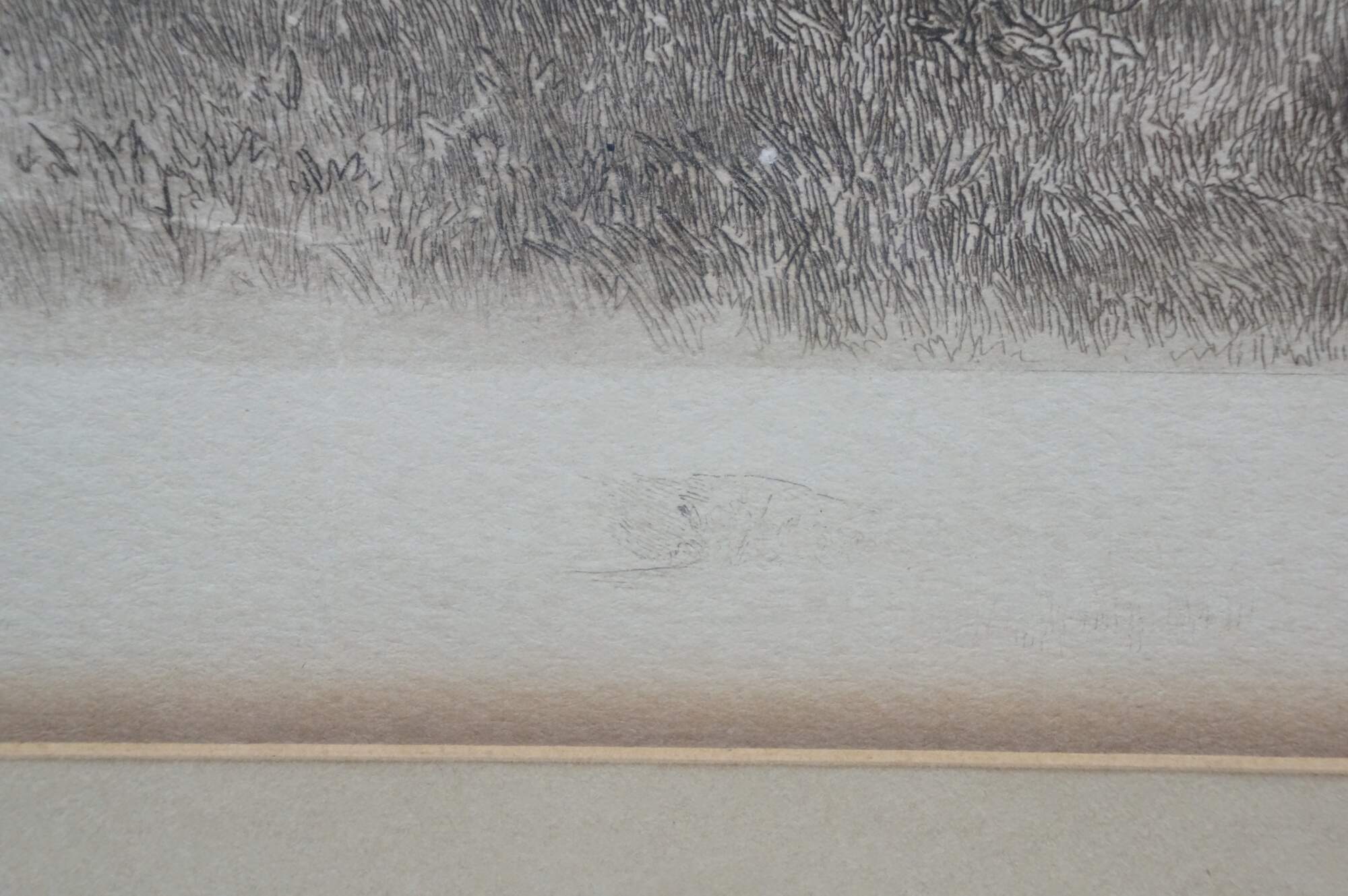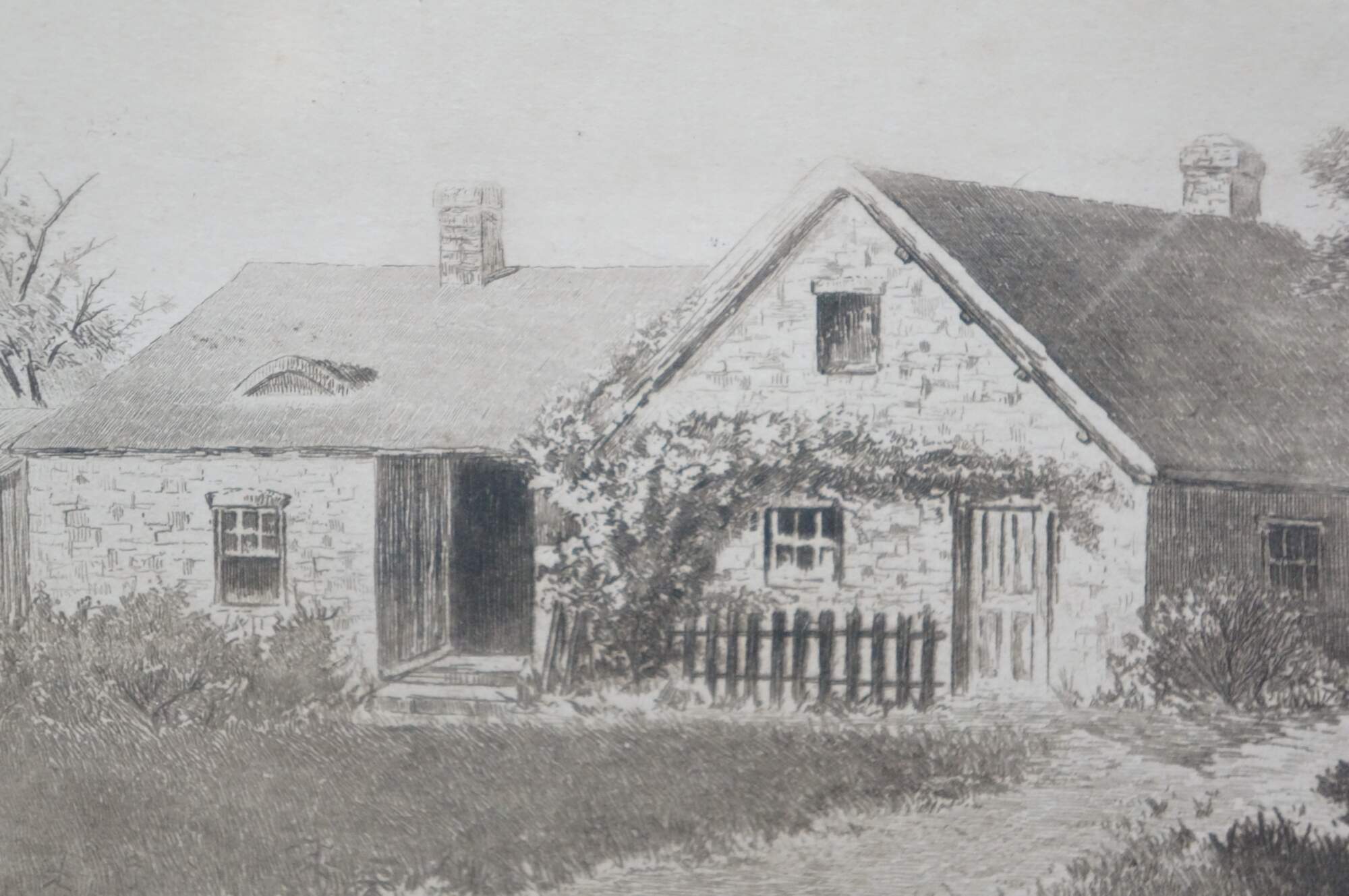 Late 19th century black and white etching by Charles Gondel. Country landscape showing a stone farmhouse and a group of cows in a river. Remarke landscape, lower edge. "Charles Gondel" printed, lower edge. Copyrighted 1895 by BT Babbitt. Beveled wood frame with beaded detail; white mat.