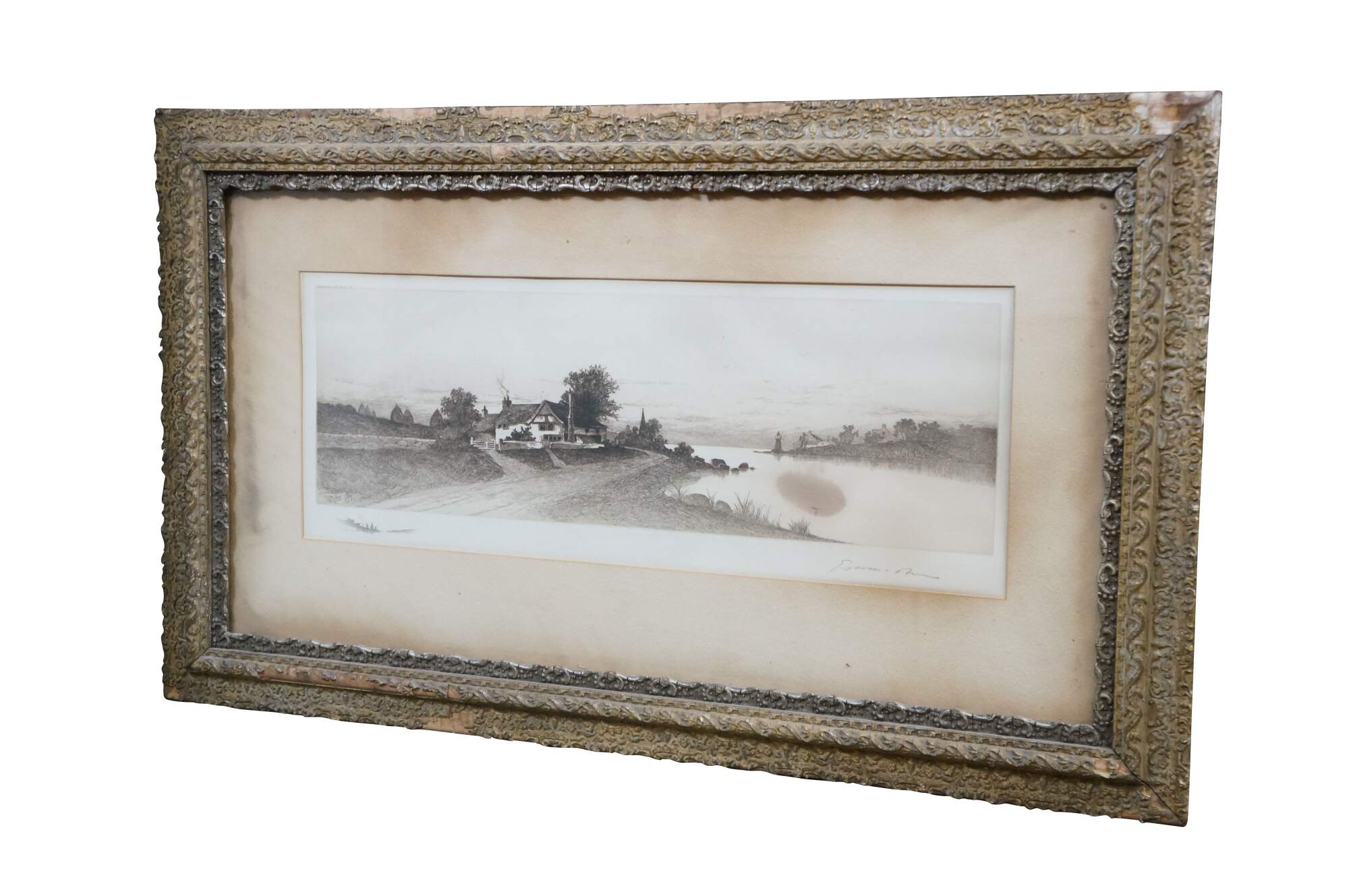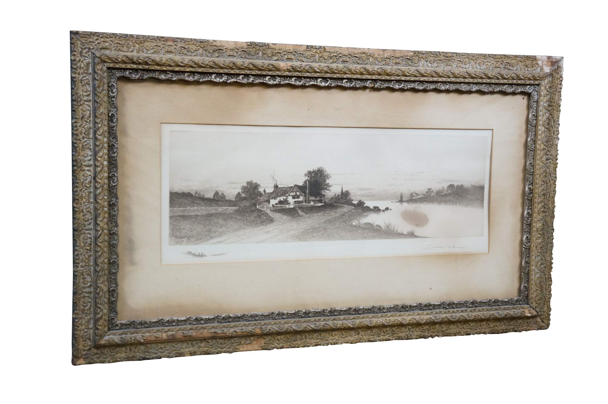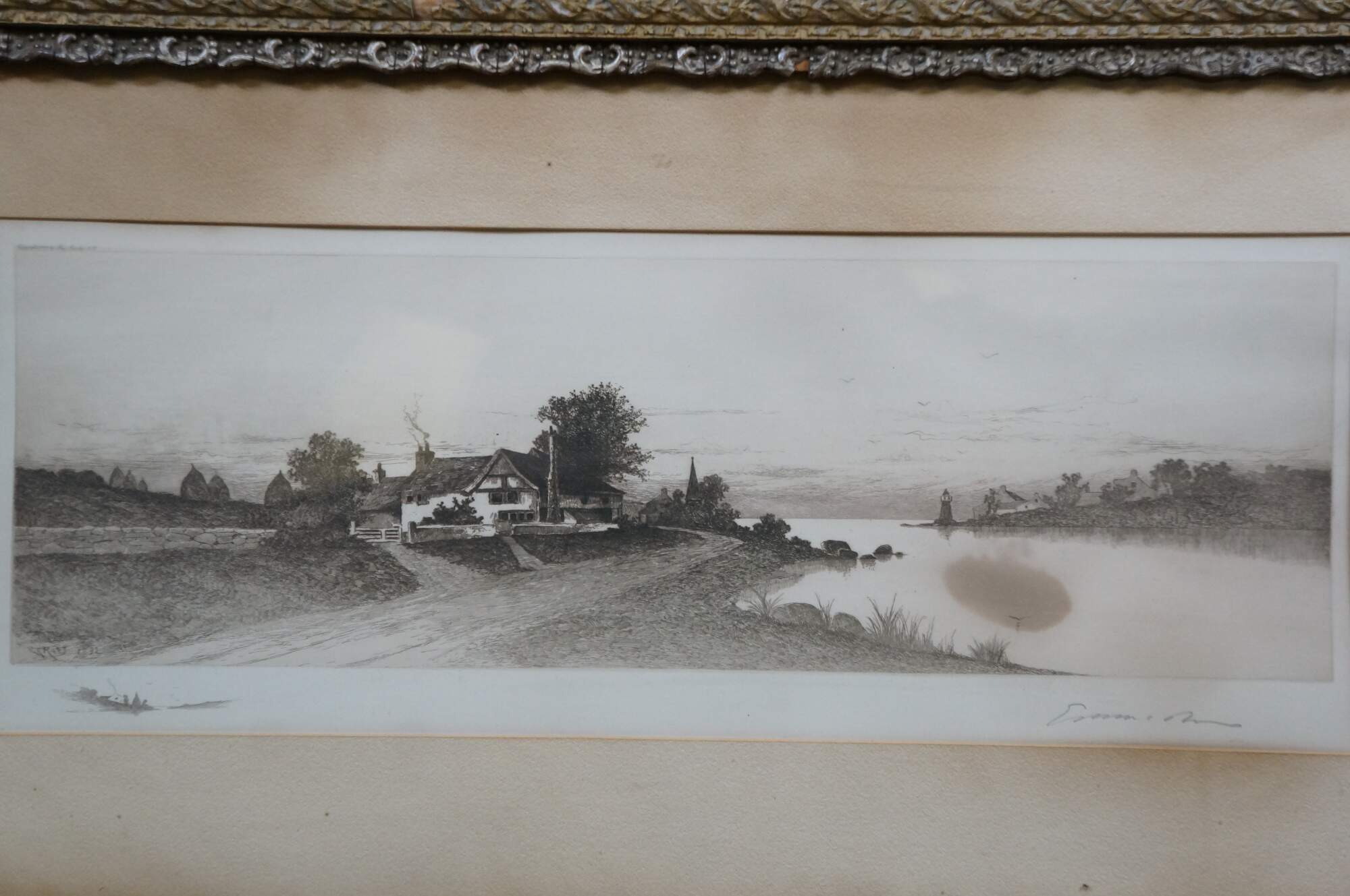 Late 19th century black and white etching by Ernest Christian Rost. A panoramic landscape / riverscape showing a farmhouse at the edge of a waterway with a small lighthouse in the distance. Signed in plate EC Rost 1892. Remarke of a riverscape, lower left. Pencil signed, lower edge. Ornate foliate carved wood and gesso frame; white mat.