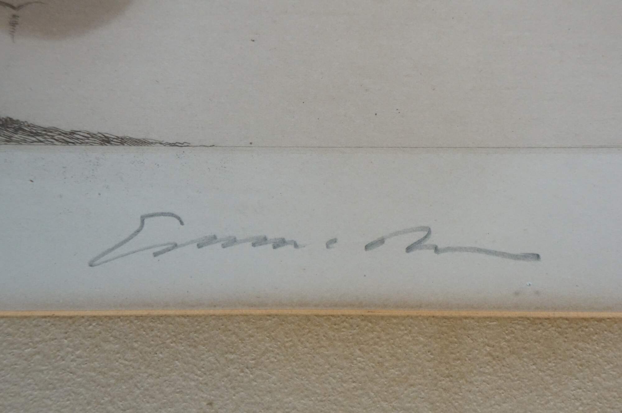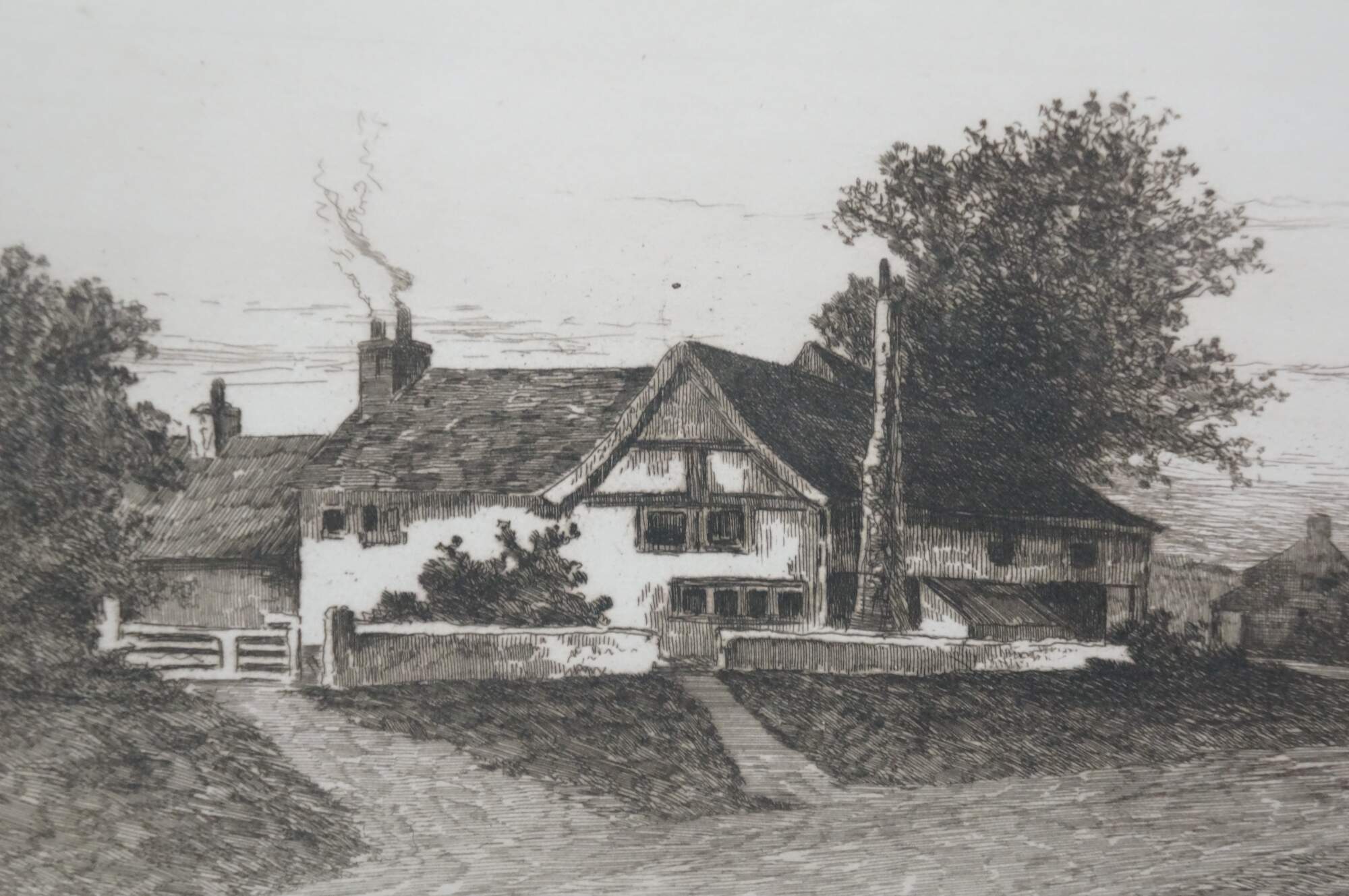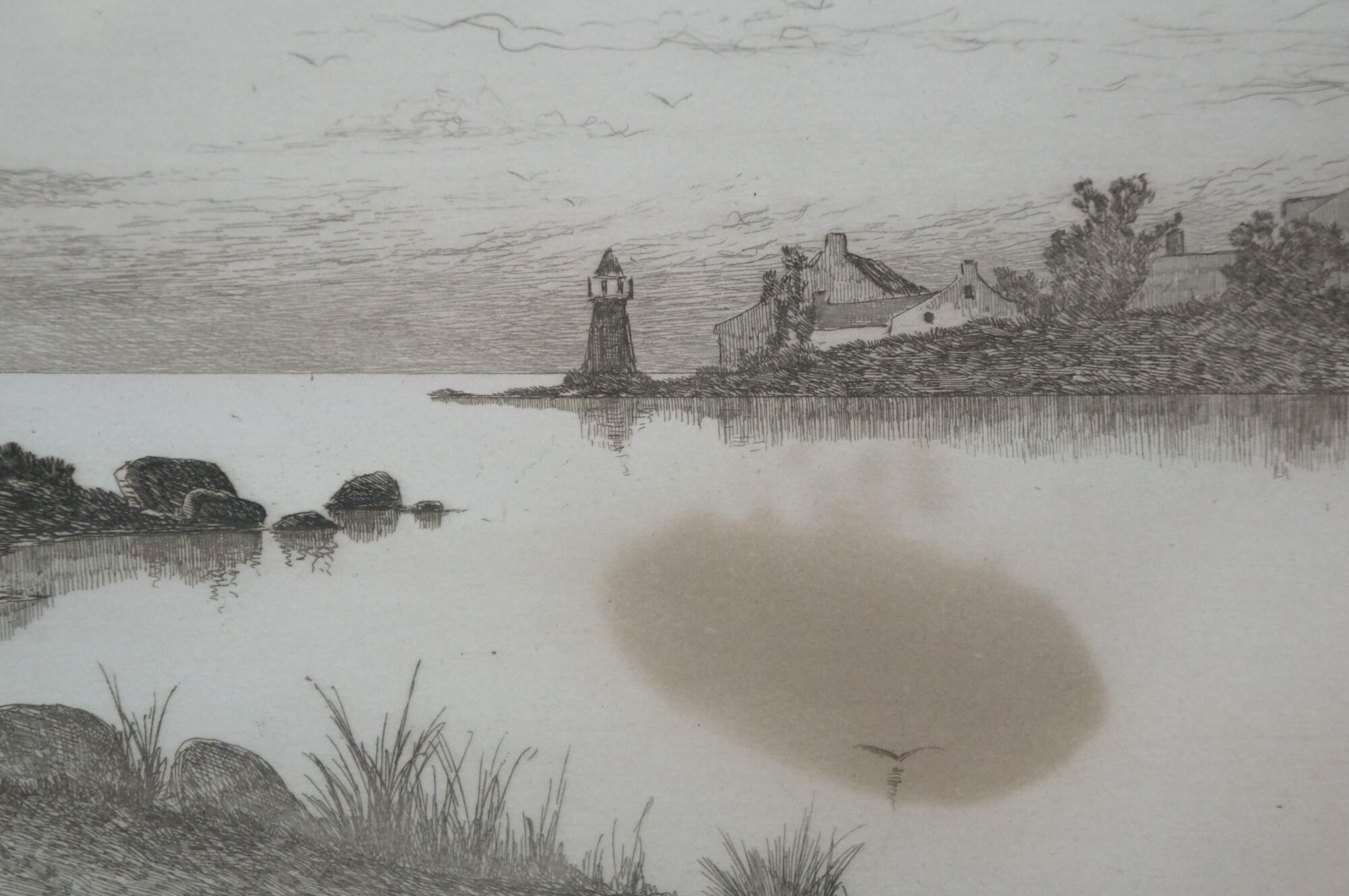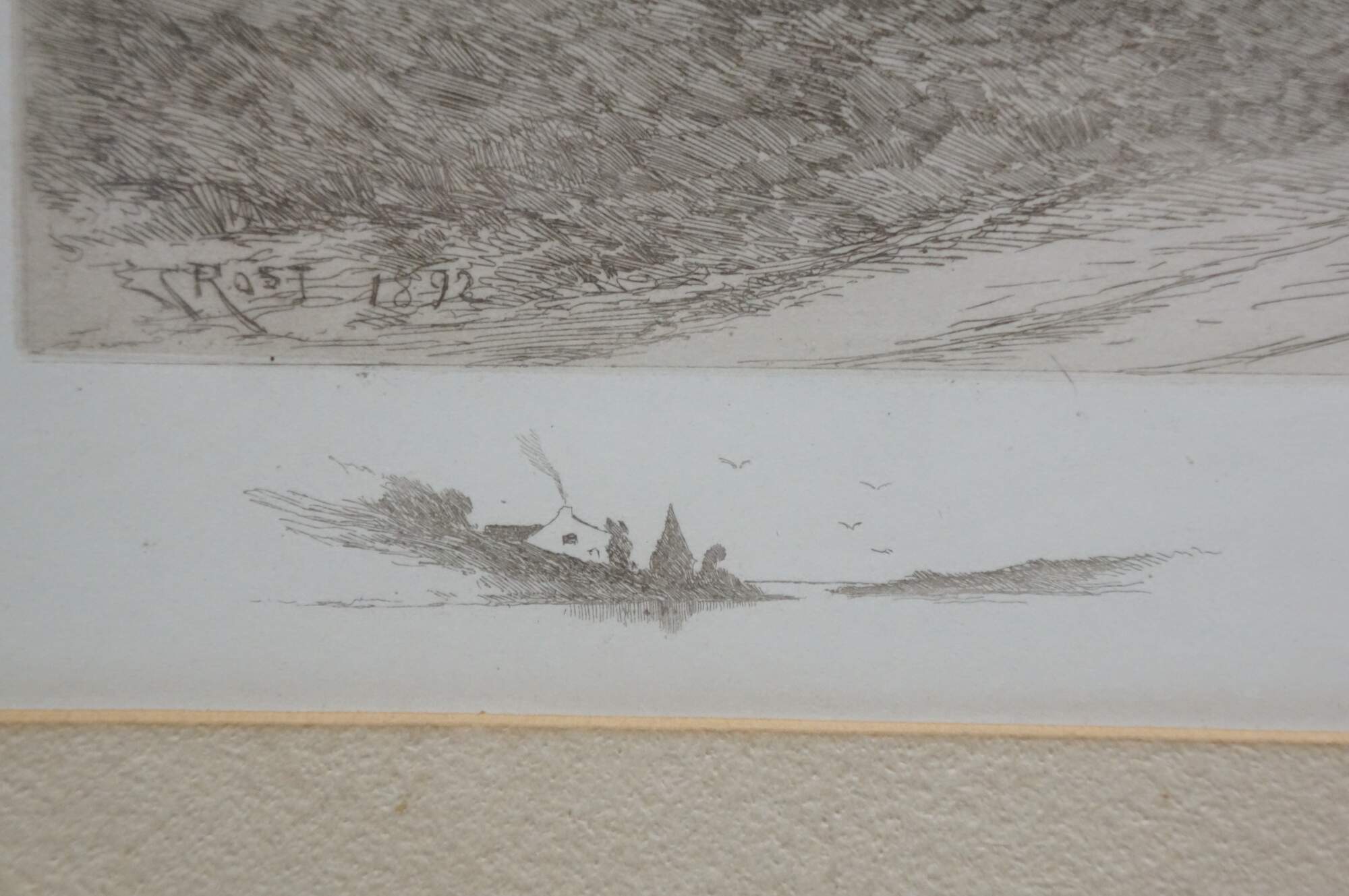 Late 19th century black and white etching by Ernest Christian Rost. A panoramic landscape / riverscape showing a farmhouse at the edge of a waterway with a small lighthouse in the distance. Signed in plate EC Rost 1892. Remarke of a riverscape, lower left. Pencil signed, lower edge. Ornate foliate carved wood and gesso frame; white mat.