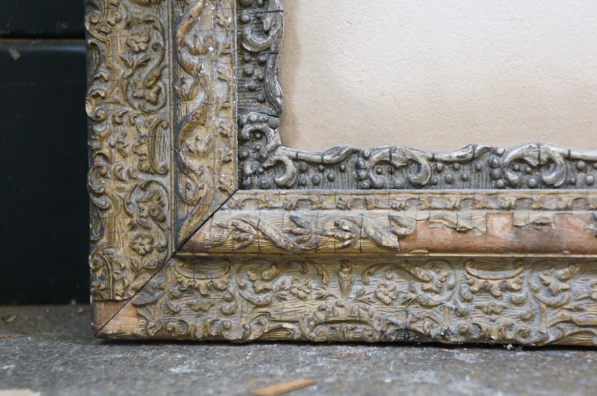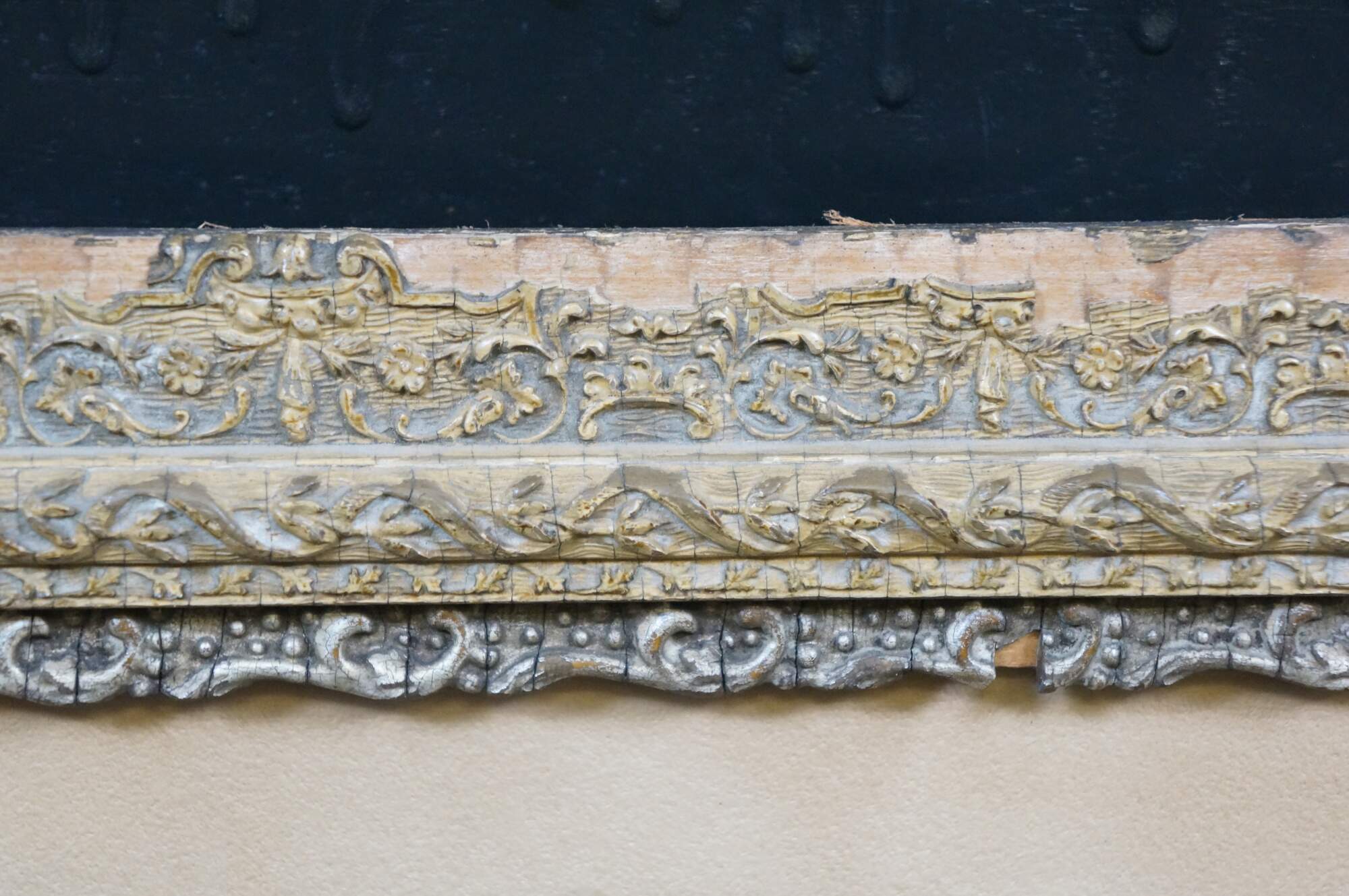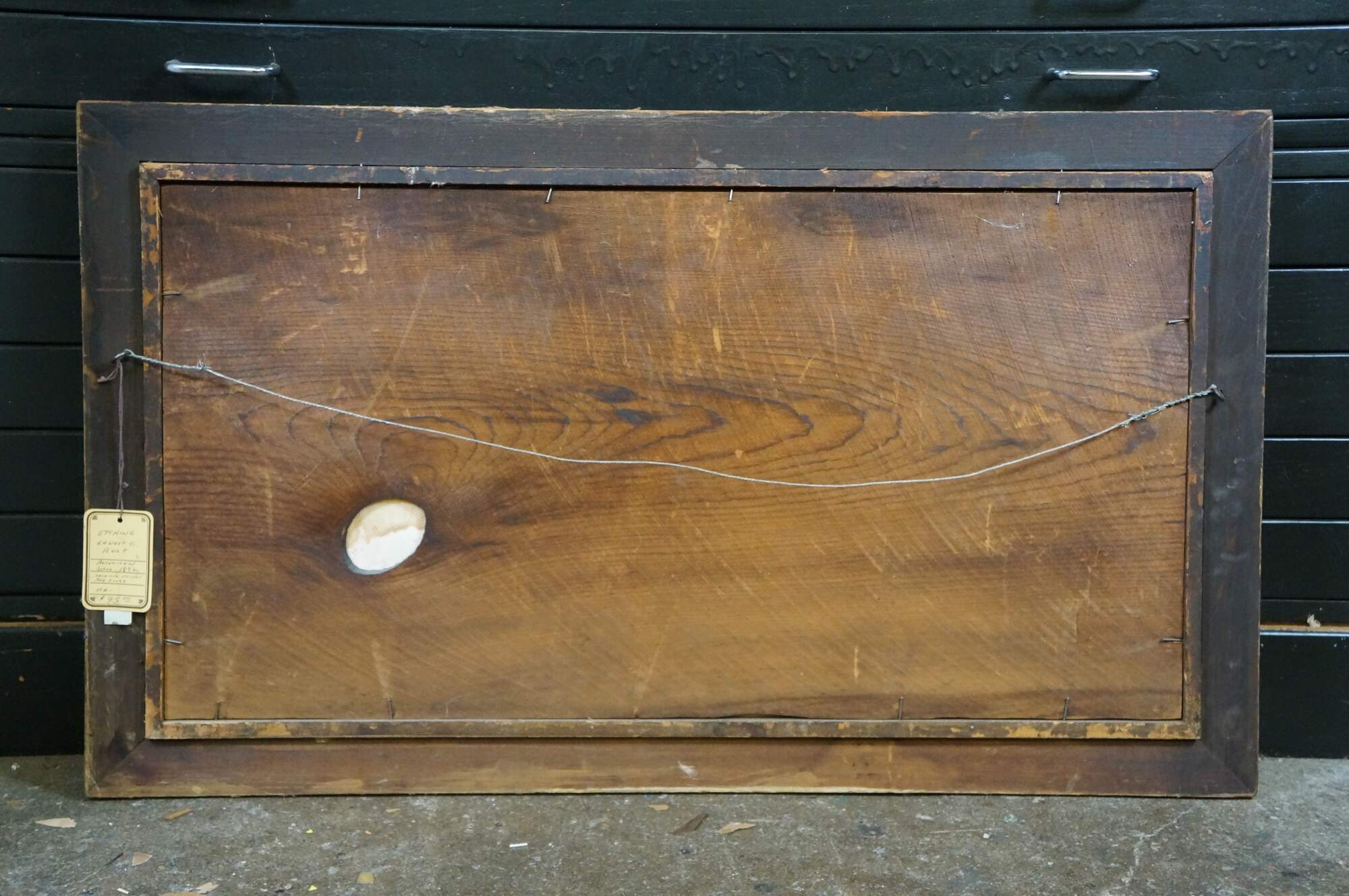 Heavy wear / chipping / crazing / finish loss to frame; discoloration / foxing to print/mat; no glass