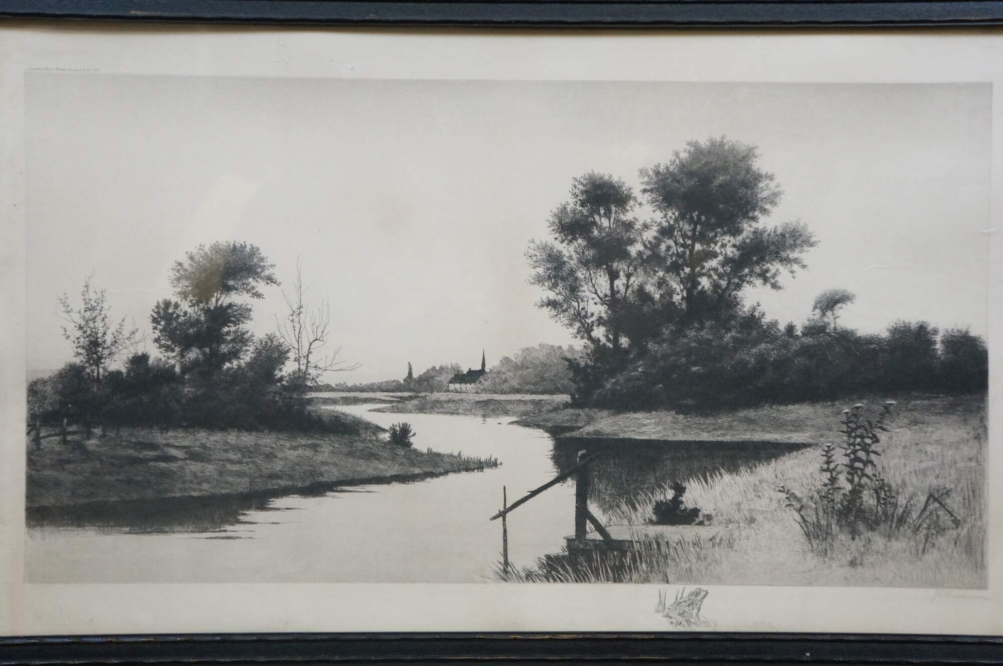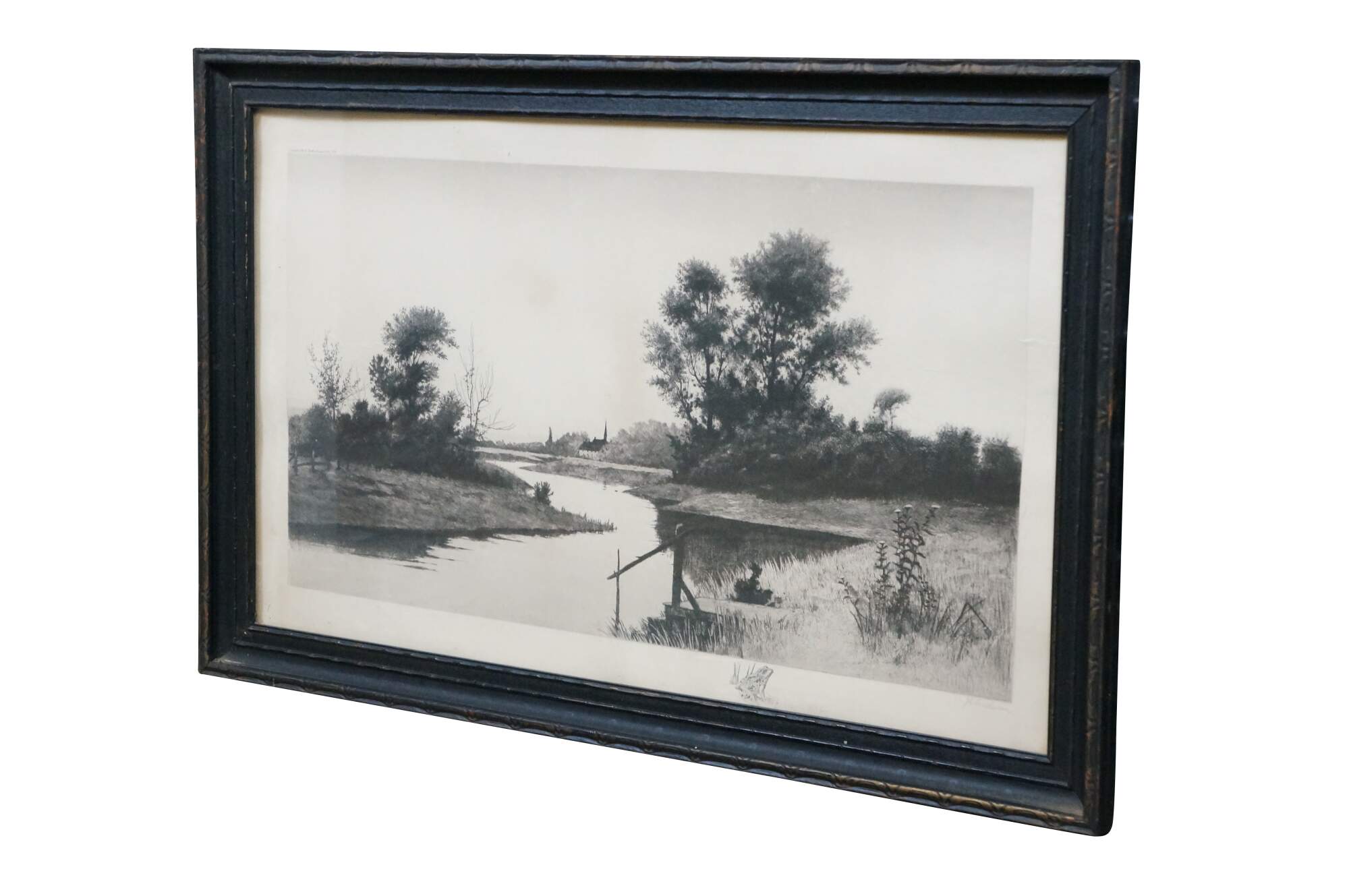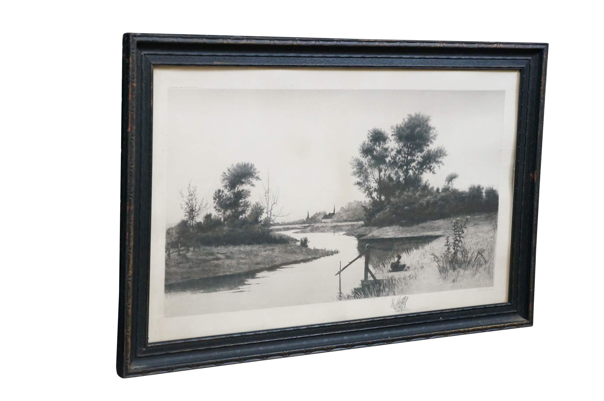 Late 19th century black and white etching by John Octavius Anderson. Country landscape featuring a small dock at the edge of a winding river with a church steeple in the distance.. Copyright 1891 by Radtke, Lauckner & Co, NY. Remarke of a frog, lower edge. Pencil signed, lower right. Beveled, black painted wood frame with carved detail at the edges.