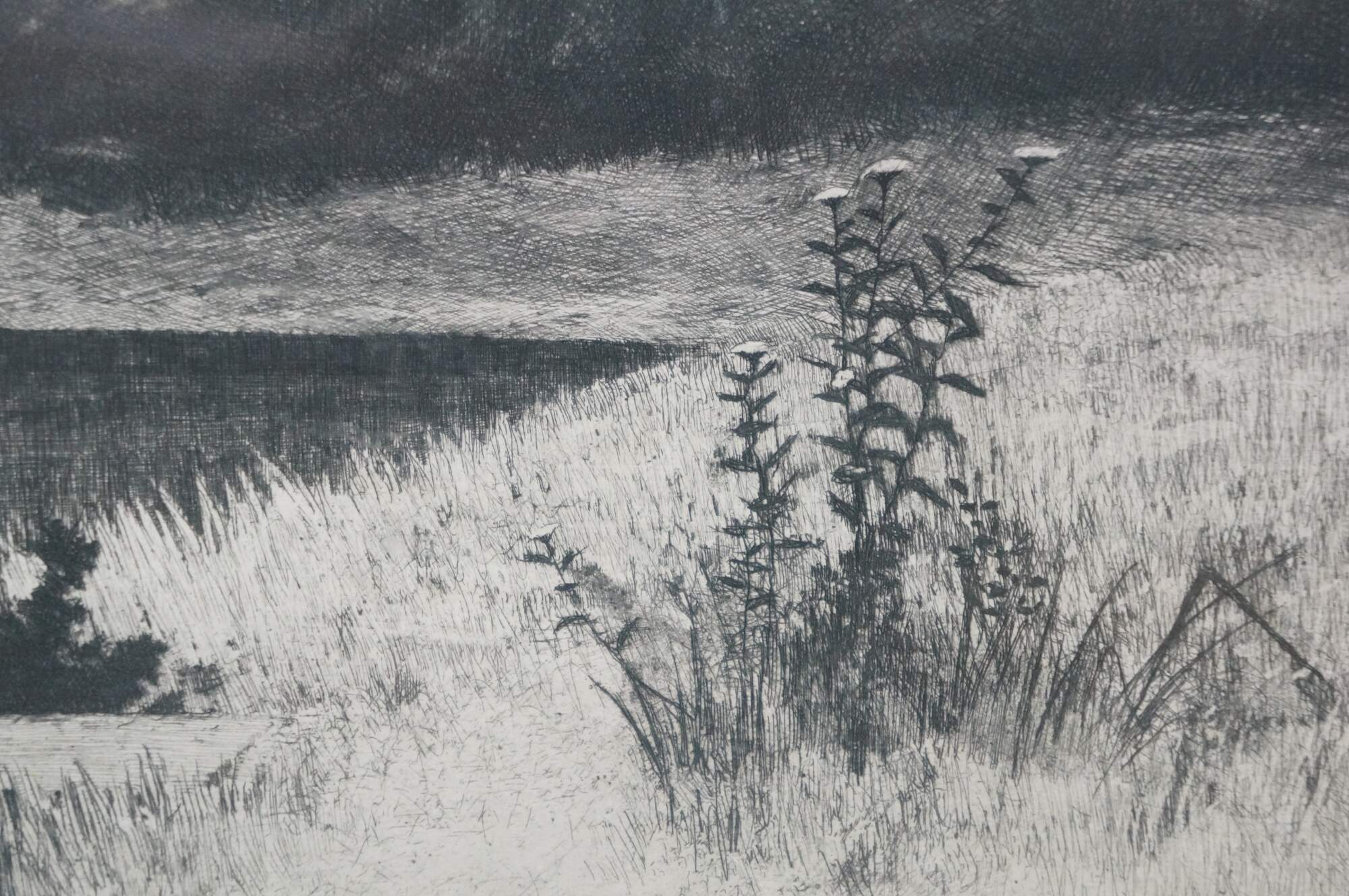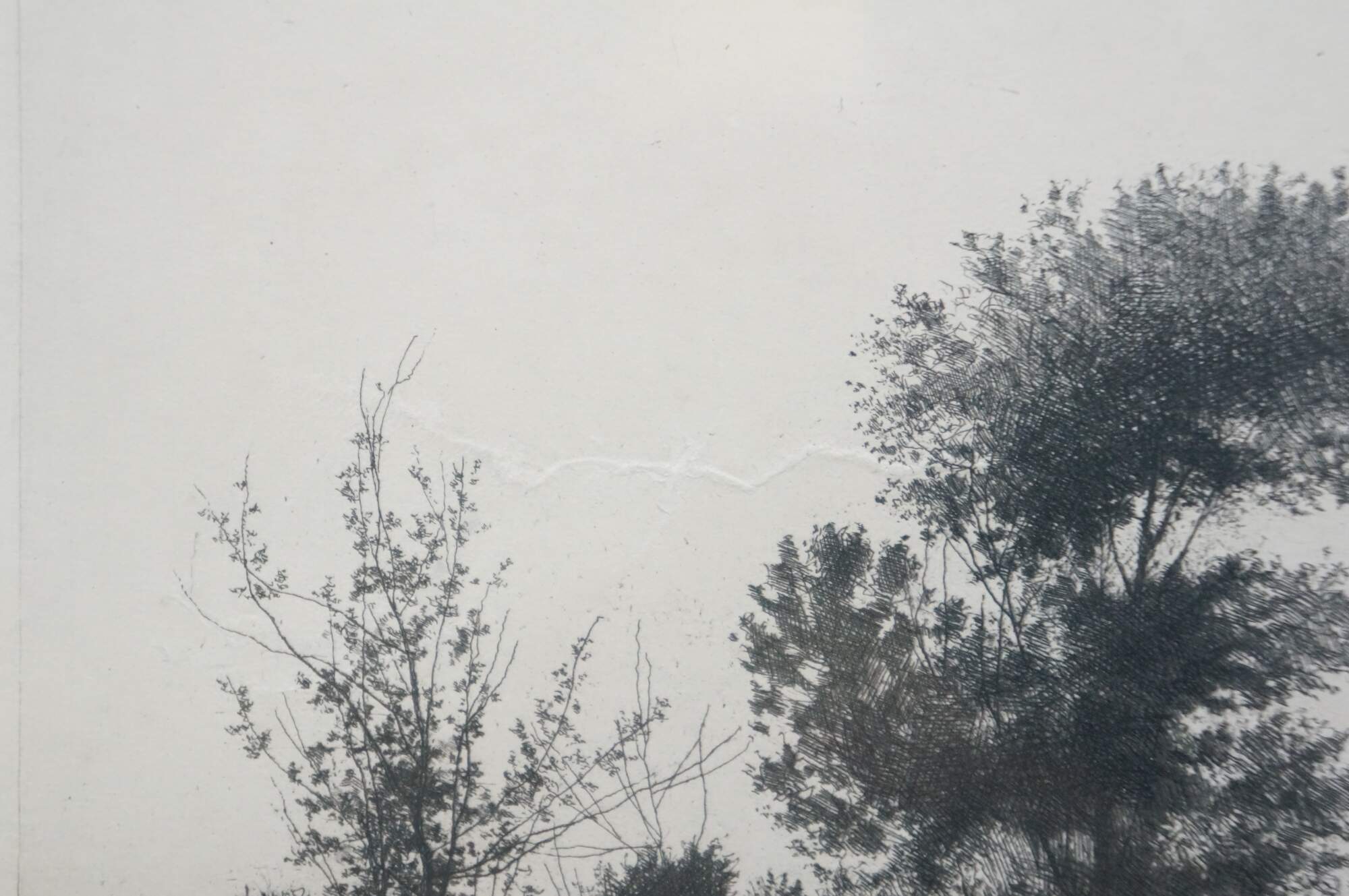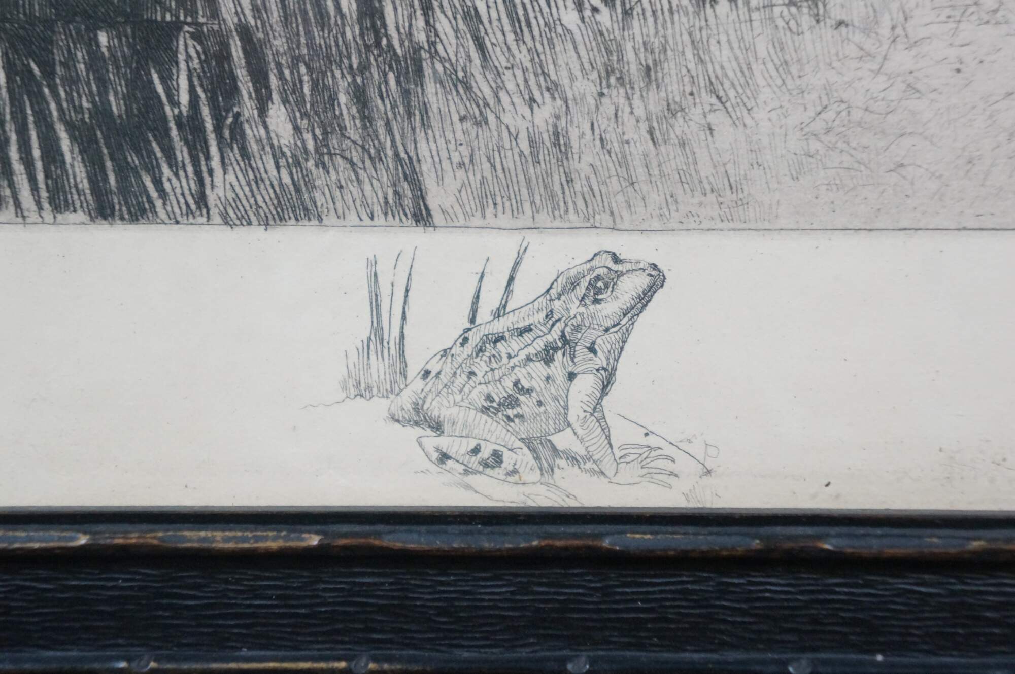 Late 19th century black and white etching by John Octavius Anderson. Country landscape featuring a small dock at the edge of a winding river with a church steeple in the distance.. Copyright 1891 by Radtke, Lauckner & Co, NY. Remarke of a frog, lower edge. Pencil signed, lower right. Beveled, black painted wood frame with carved detail at the edges.