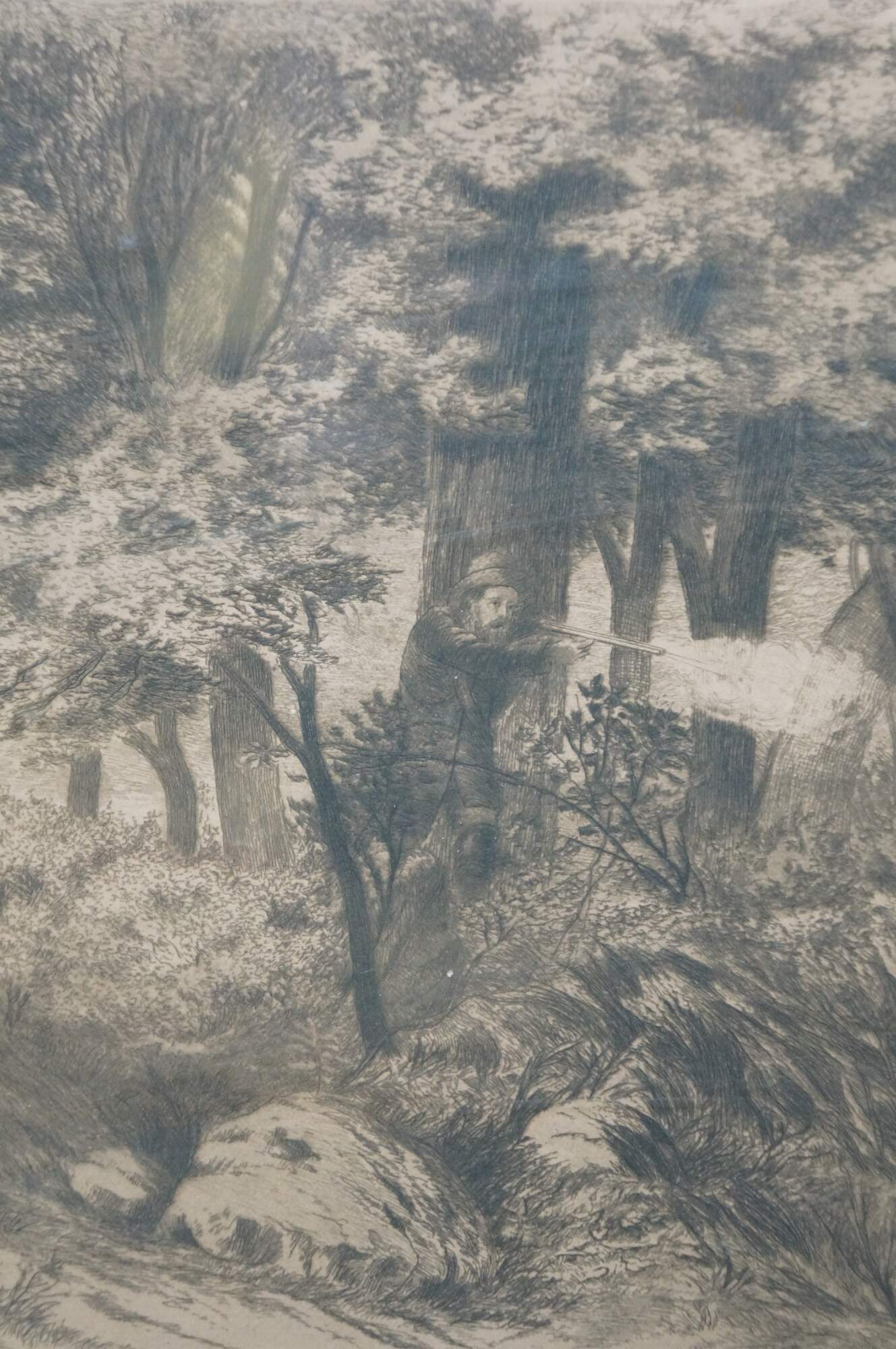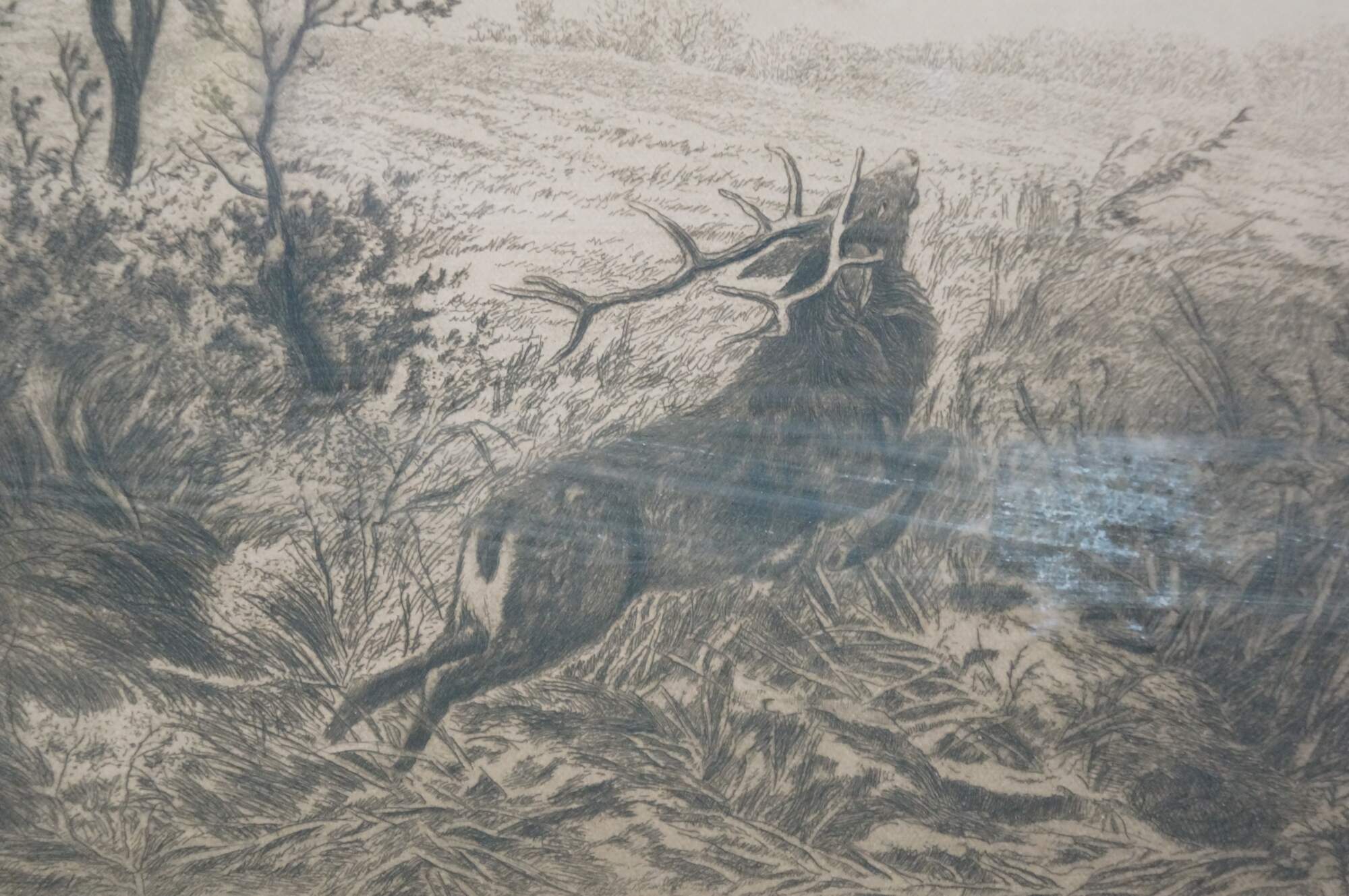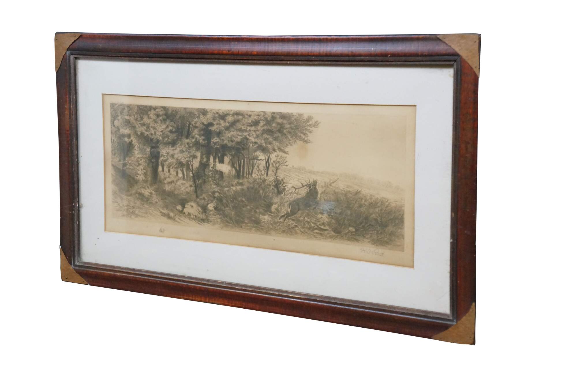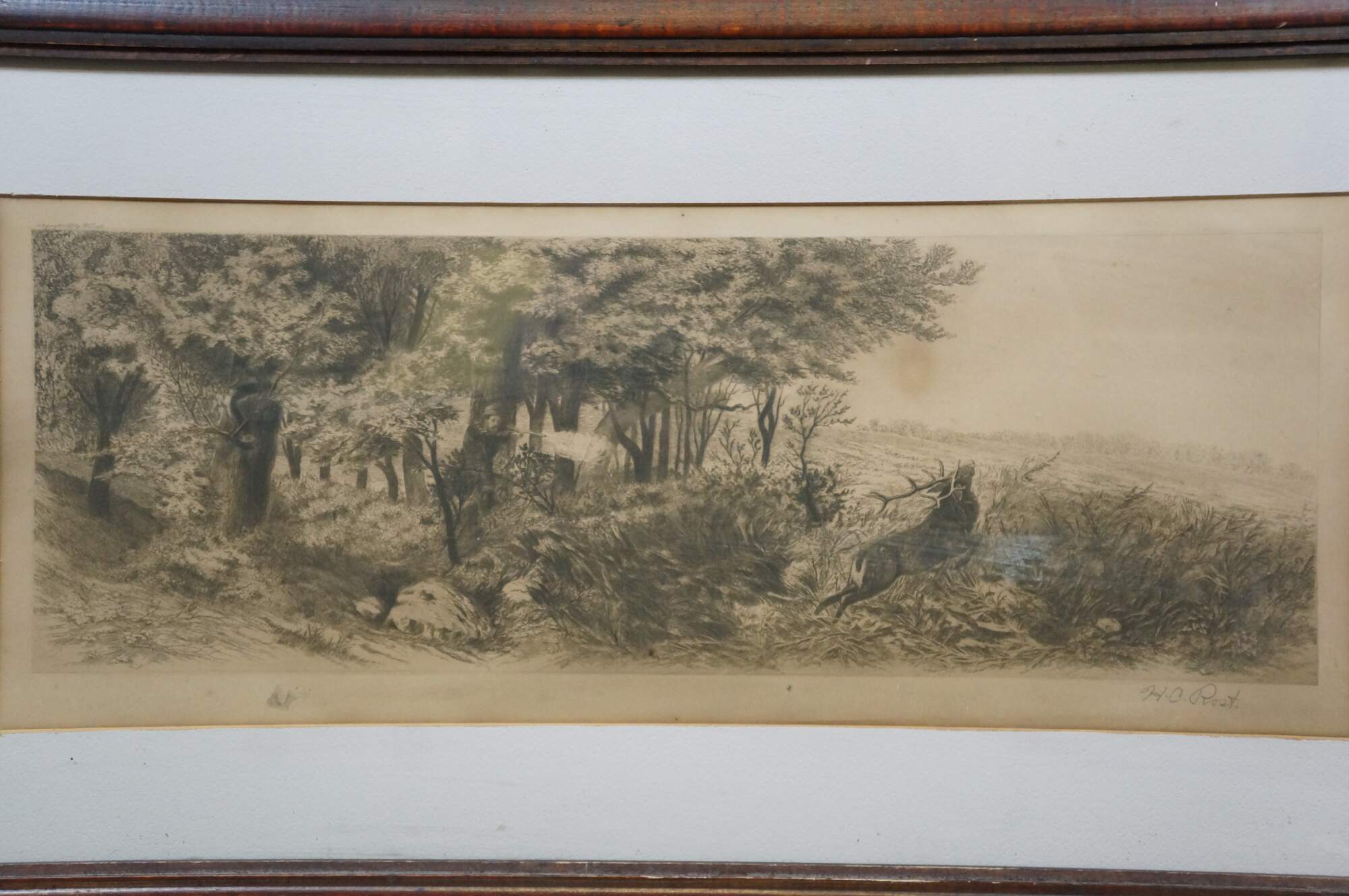 Late 19th century black and white etching by H.C. Rost. Panoramic forest landscape featuring a hunter firing at a leaping elk / deer. Copyright 1895 by HC Rost. Remarke of a dog's head, lower edge. Pencil signed, lower right. Beveled wood frame with copper corners; white mat.