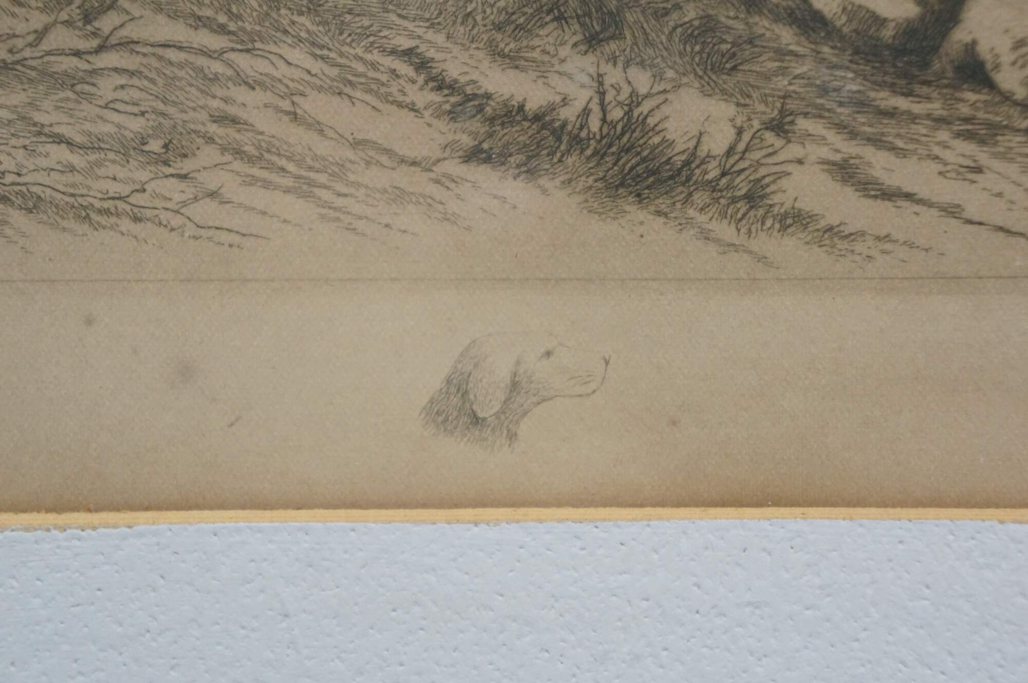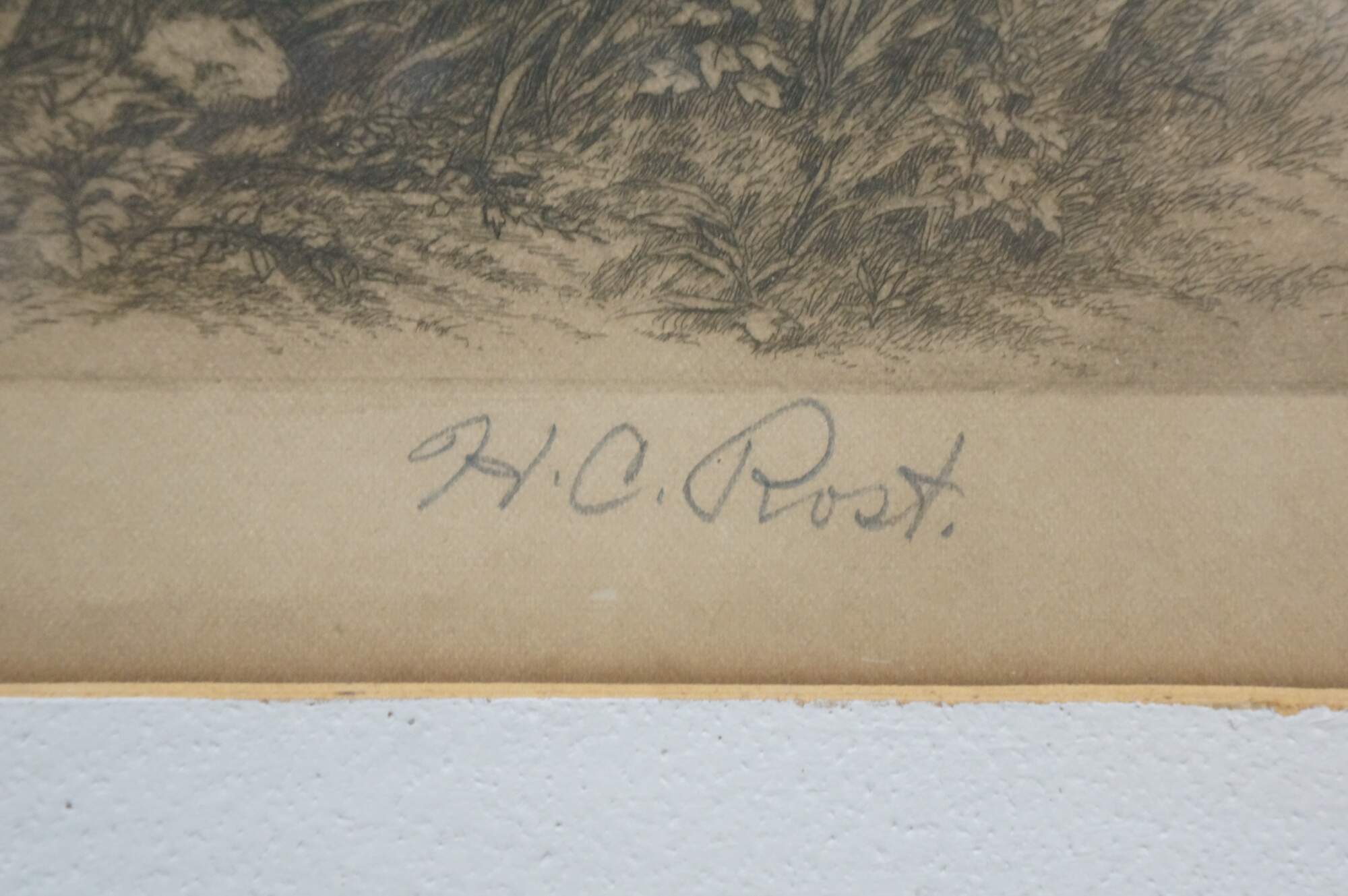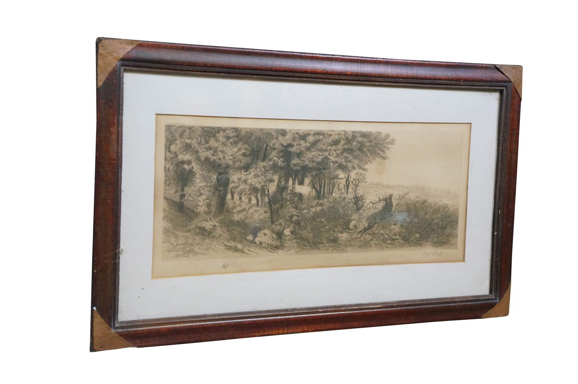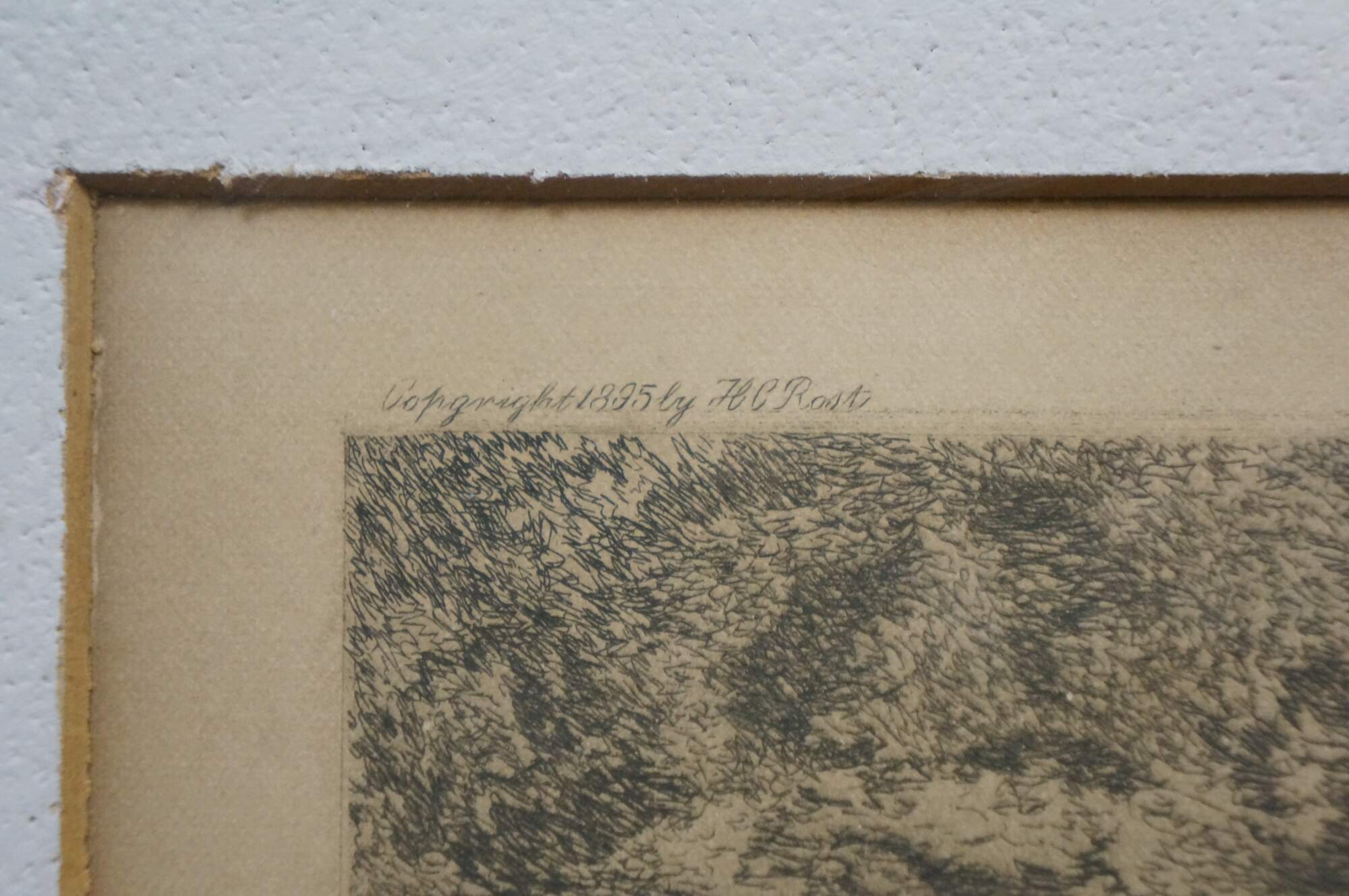 Late 19th century black and white etching by H.C. Rost. Panoramic forest landscape featuring a hunter firing at a leaping elk / deer. Copyright 1895 by HC Rost. Remarke of a dog's head, lower edge. Pencil signed, lower right. Beveled wood frame with copper corners; white mat.