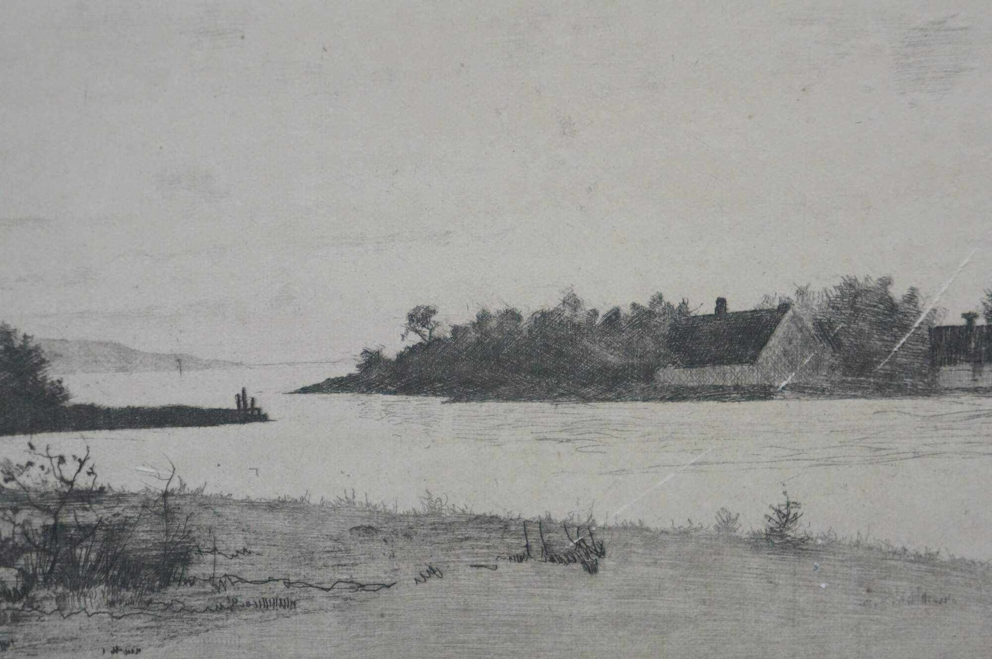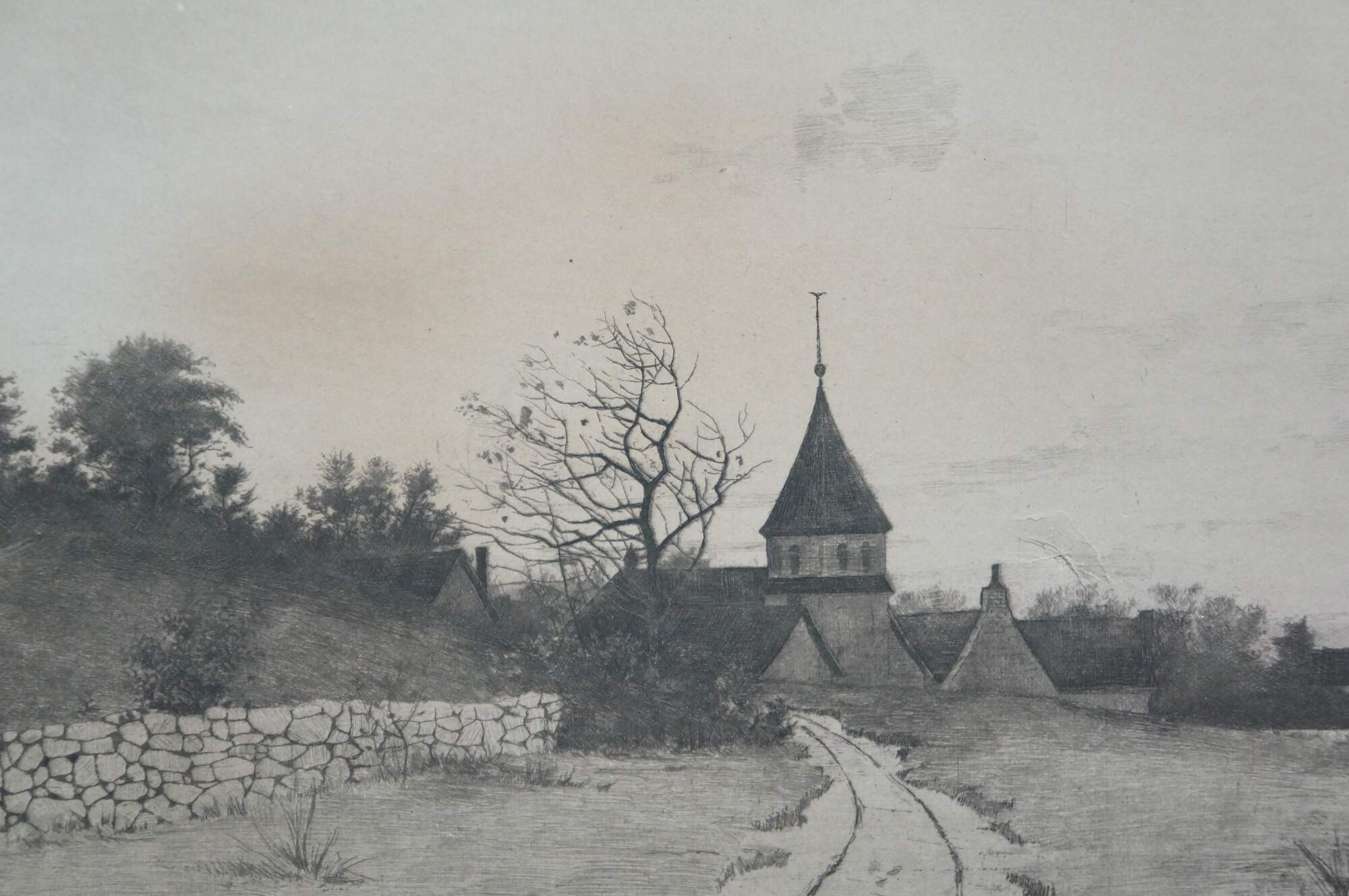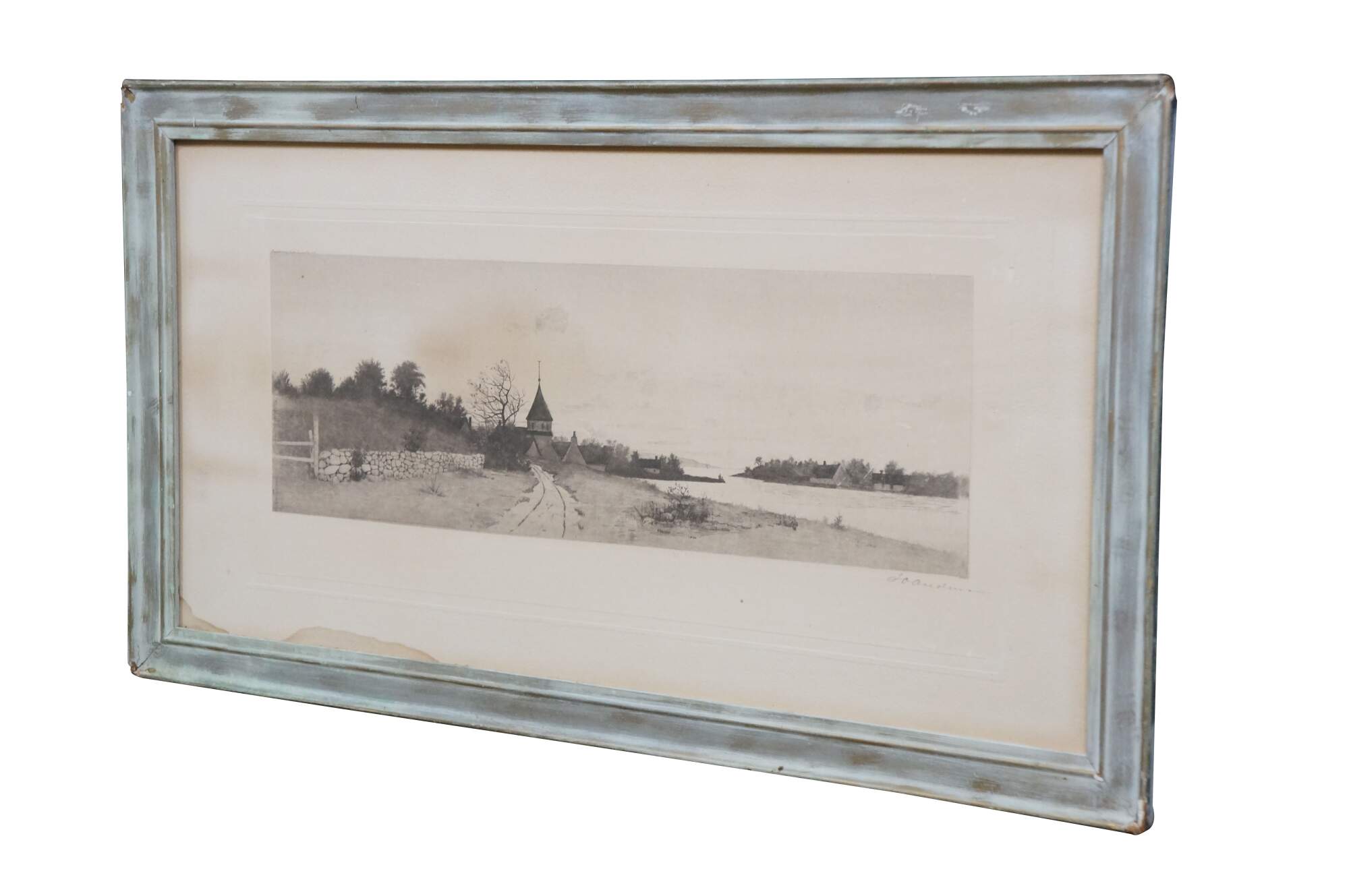 Late 19th century black and white etching by John Octavius Anderson. A panoramic landscape showing a dirt road leading to a riverside village. Copyright 1890 by Radtke, Lauckner & Co, NY. Pencil signed, lower right. Blue painted beveled wood frame; no mat.