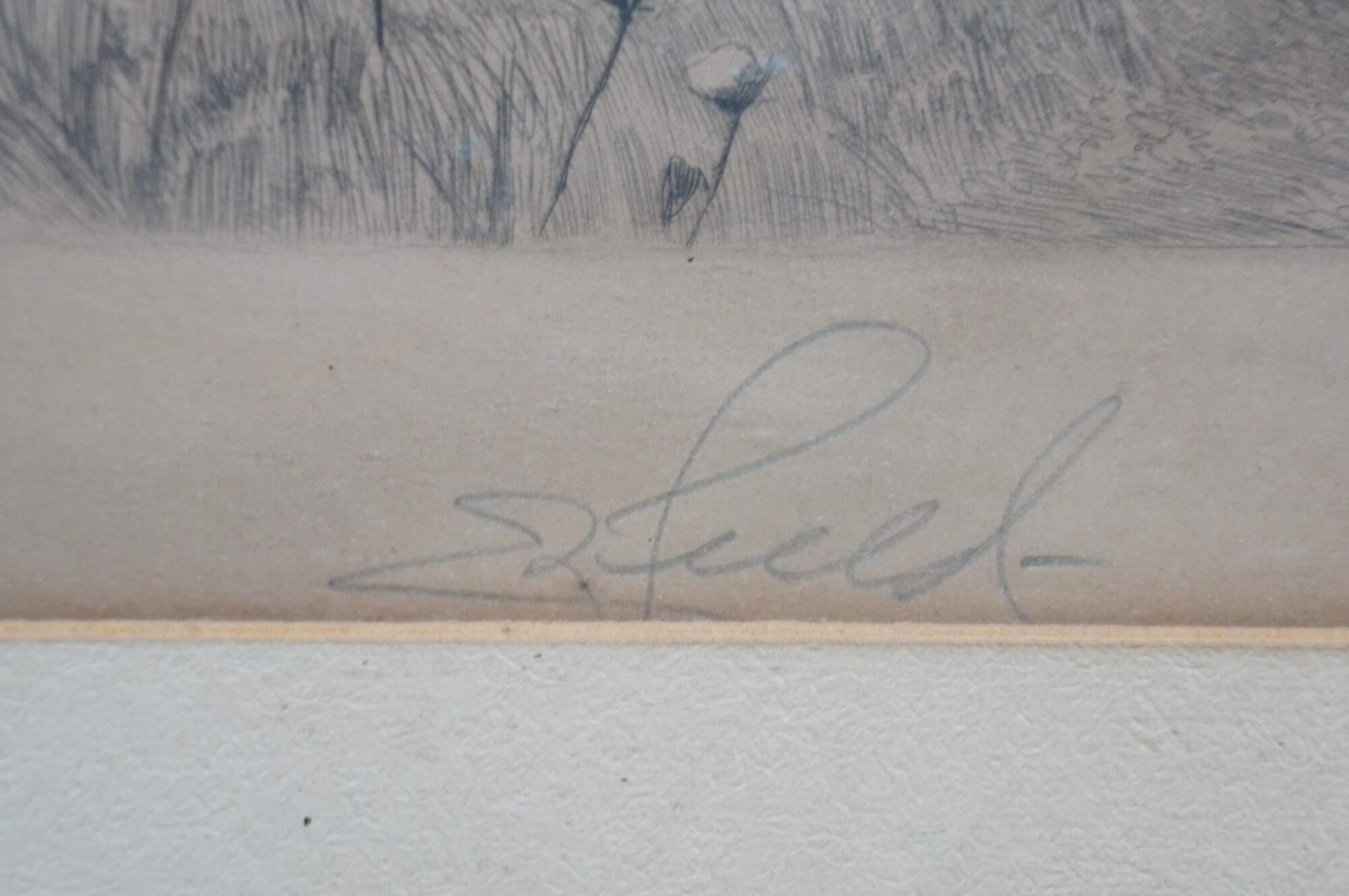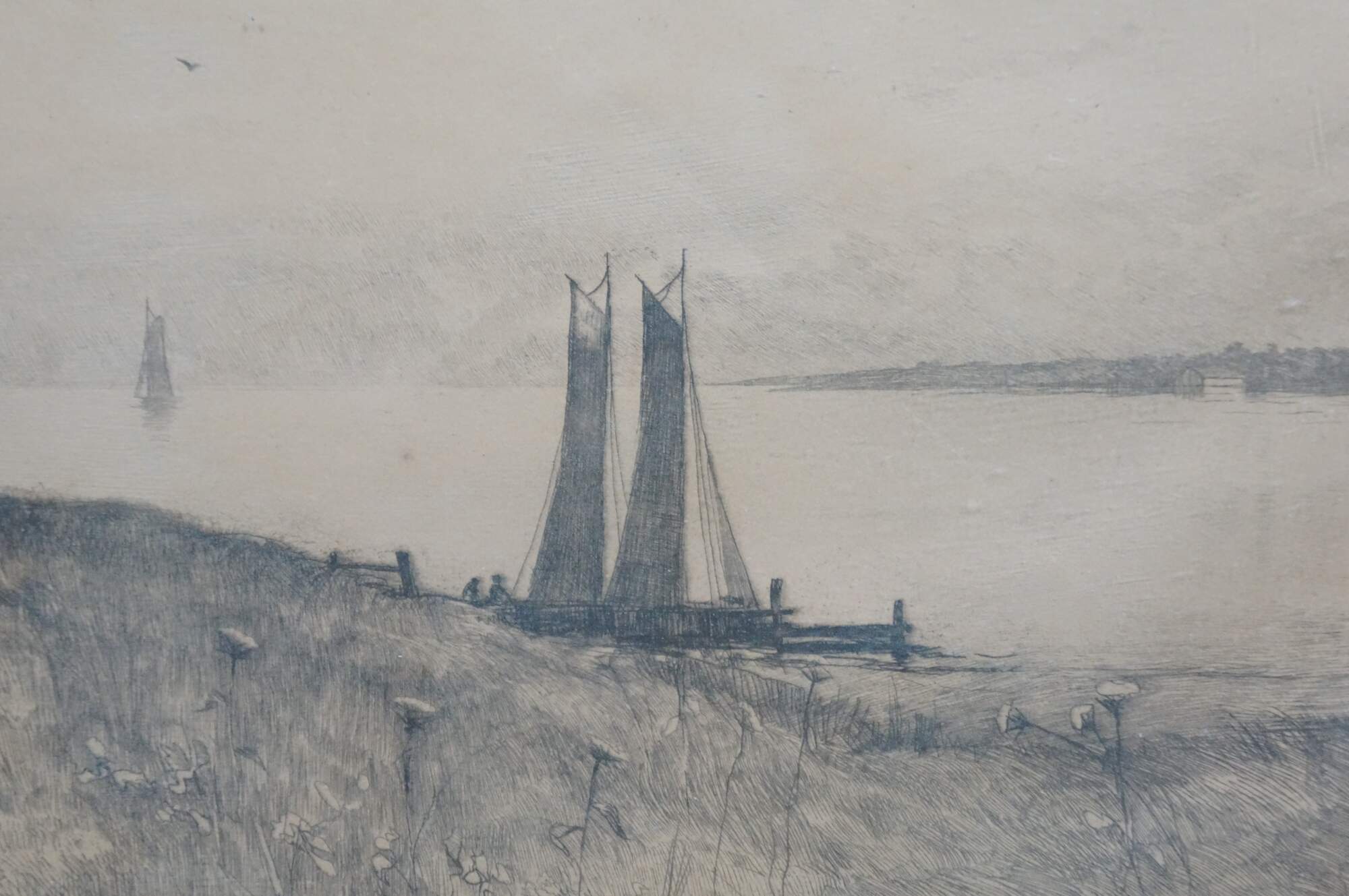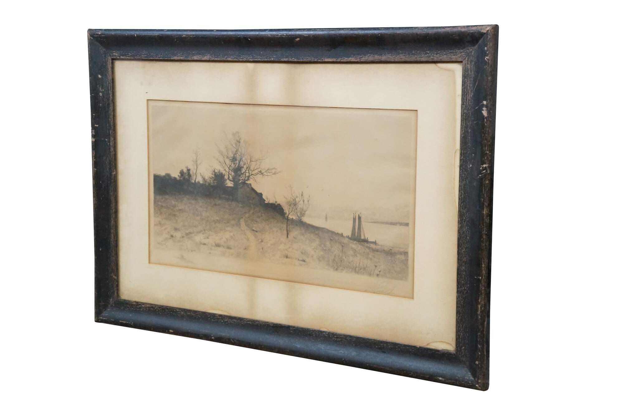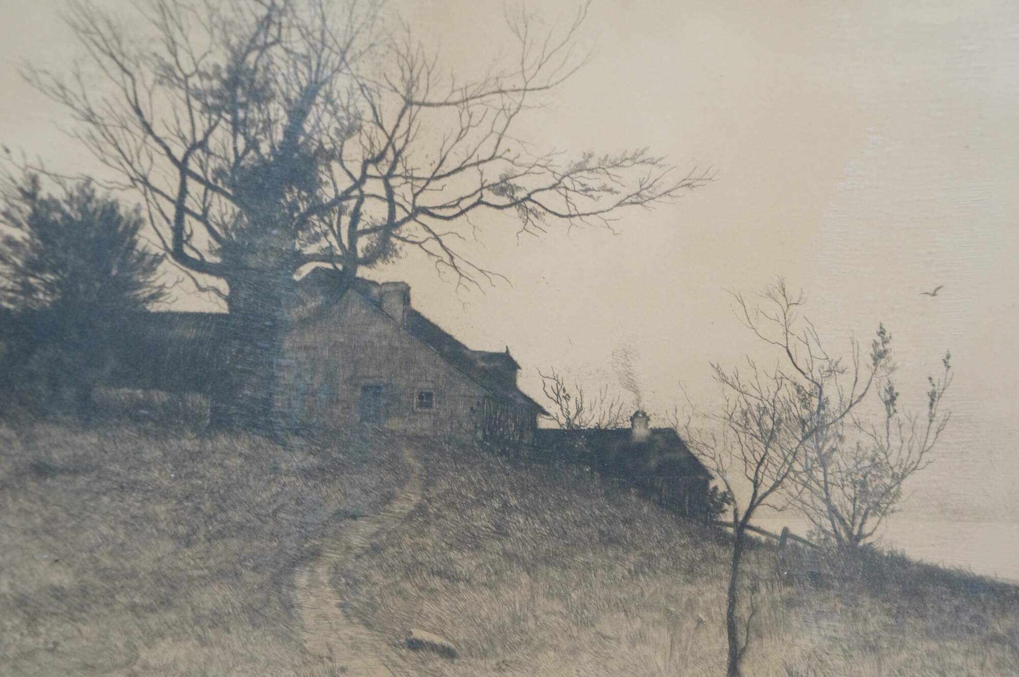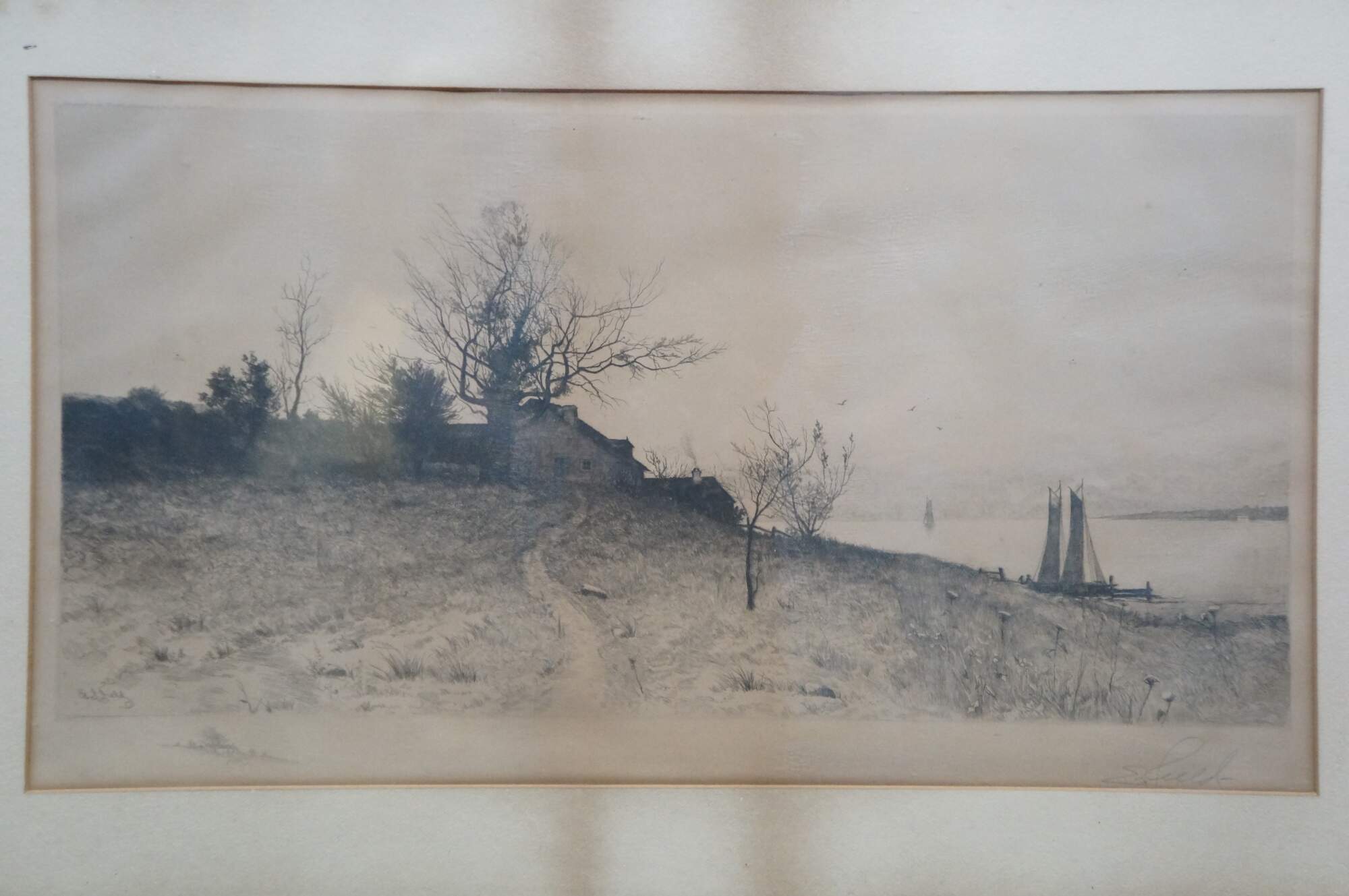 Late 19th century black and white etching by Edward Loyal Field. Landscape showing a house on a small hill, leading down to a half obscured boat dock. Possibly a view of Lake Champlain. Copyrighted by Radtke, Lauckner & Co, New York, 1890. Signed in plate EL Field. Remarke of a cottage, lower left. Pencil signed, lower right. Black painted, beveled wood frame; white mat.