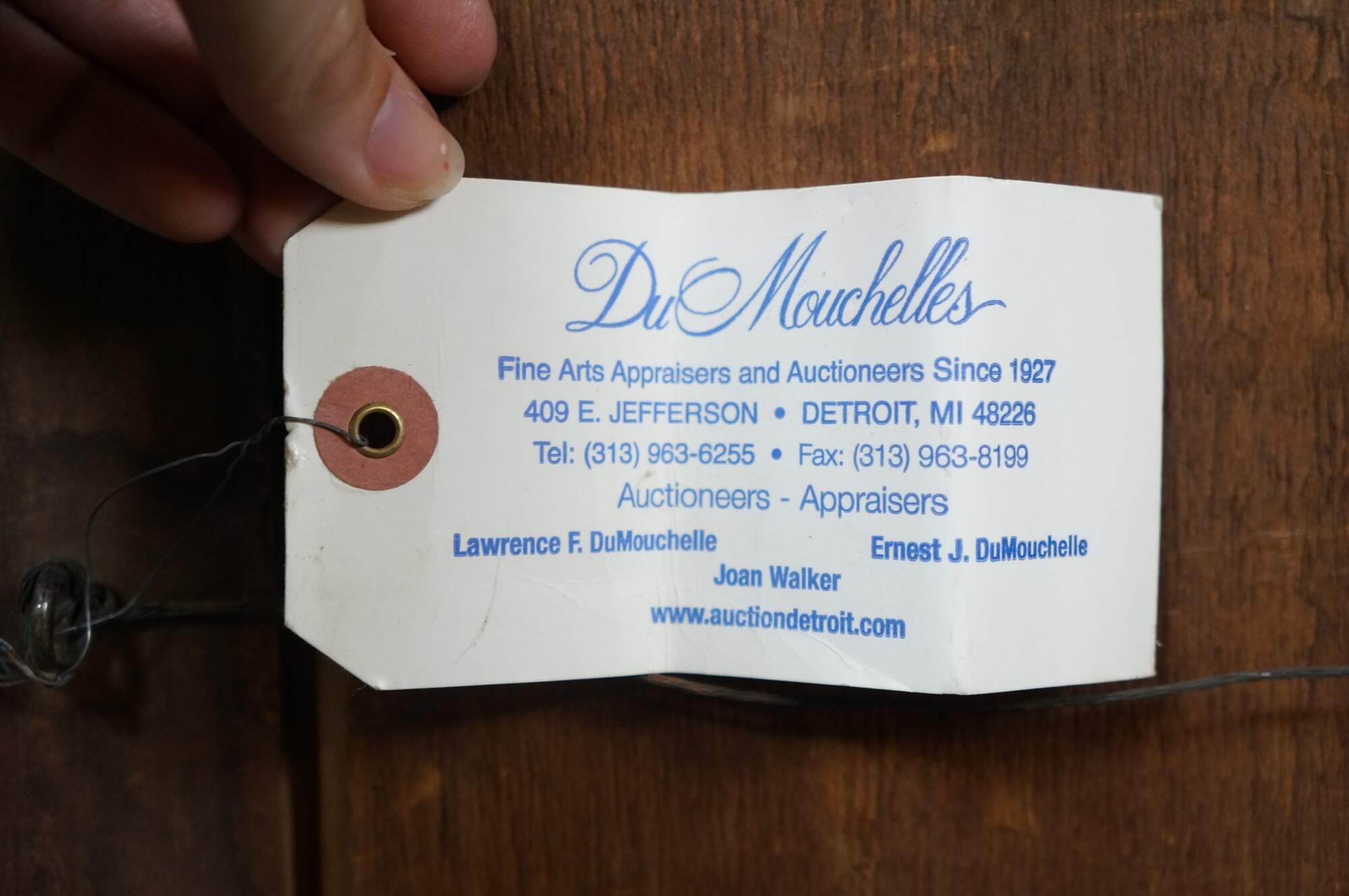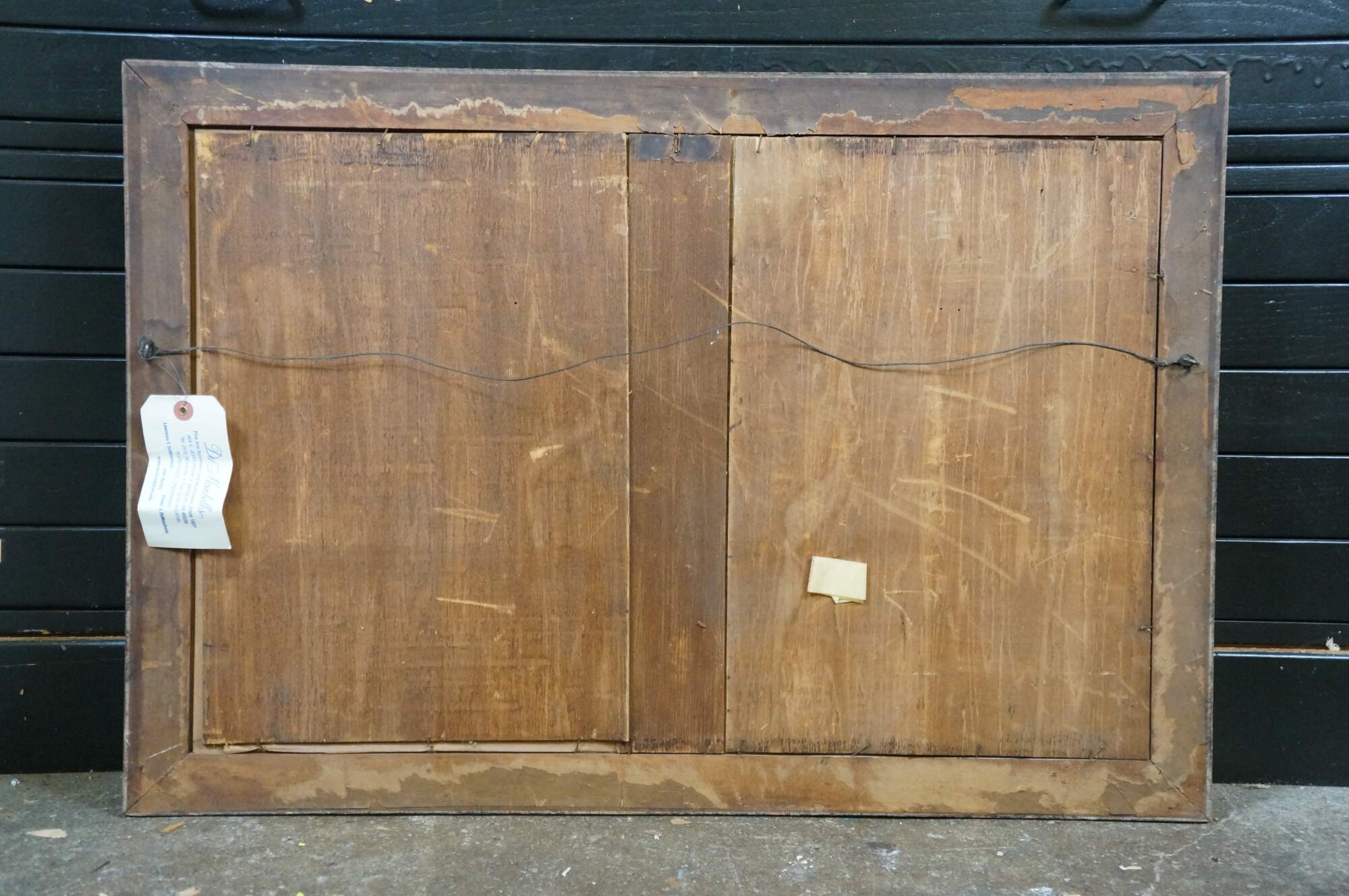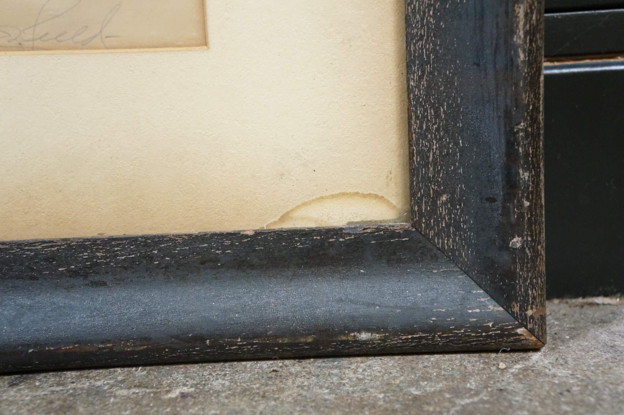 Wear / scuffing / finish loss to frame; some water stains/discoloration / foxing to print and mat.